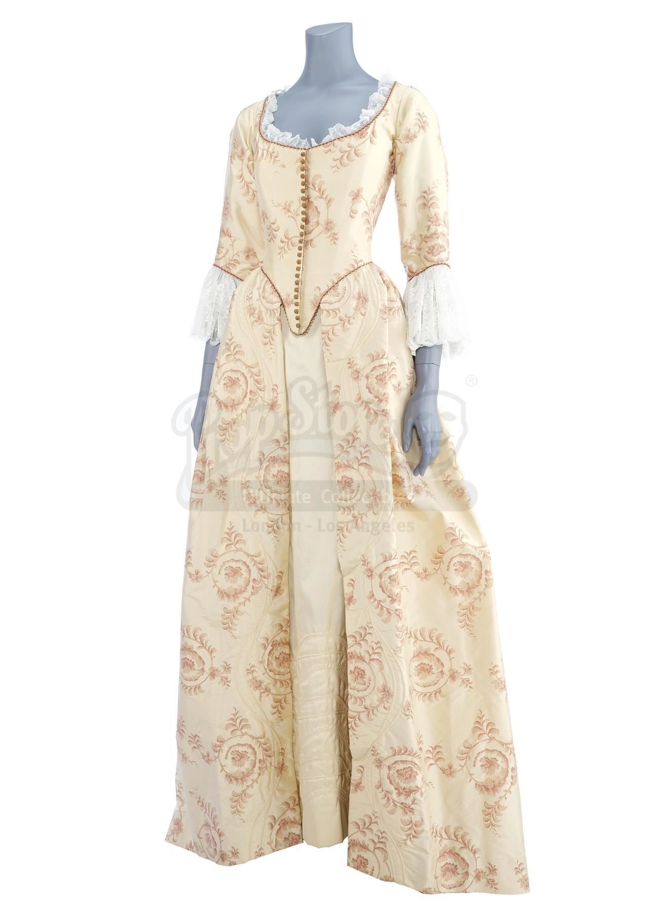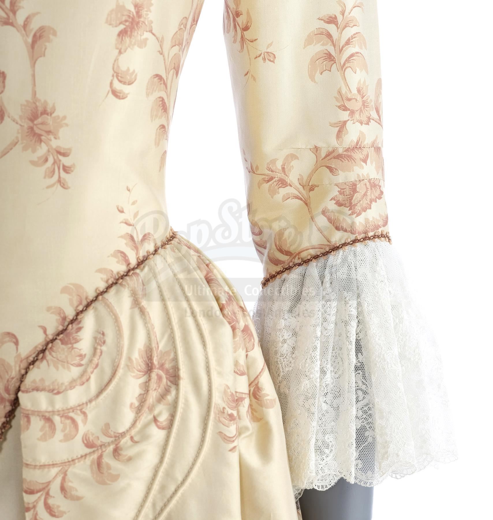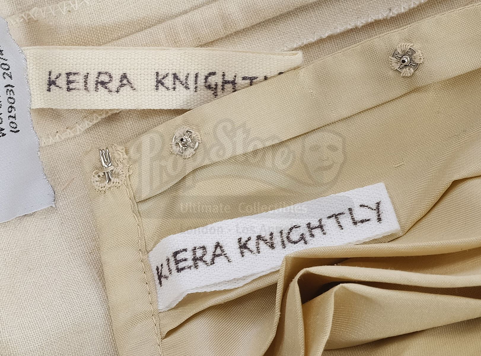 The lot consists of a dress and a petticoat. The peach-color dress features a floral vine pattern throughout with lace-trimmed sleeves and neckline. The petticoat is made of goldtone silk and features a decorative stitched hem. Both include a handwritten tag sewn into the piece, with the dress reading "Keira Knightley" and the petticoat tag reading "Kiera [sic] Knightley." Accompanying the costume is a wardrobe tag from production, with one side reading "Elizabeth Hero" and the other listing the change number and full costume components. The lot remains in excellent overall condition.