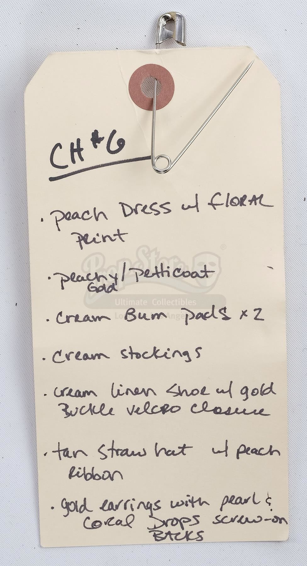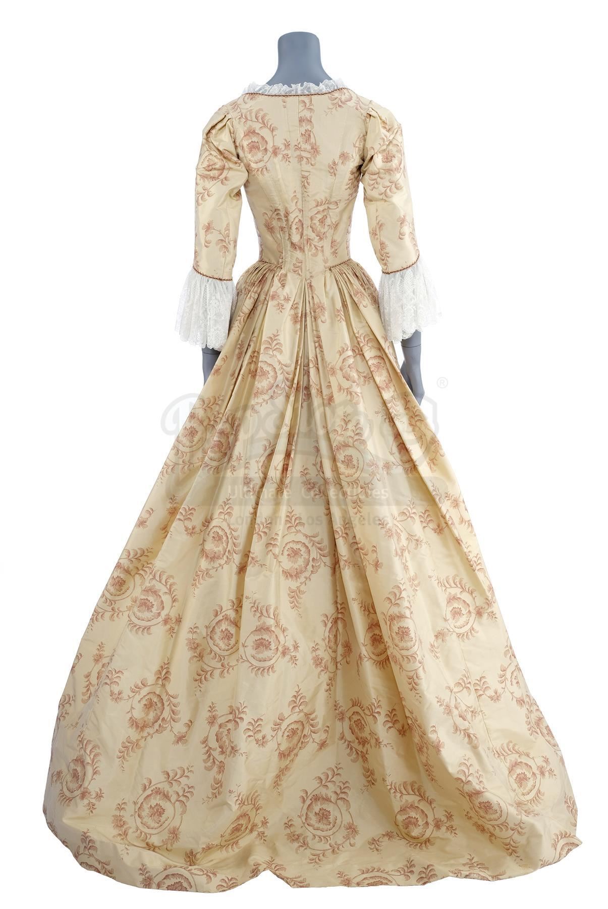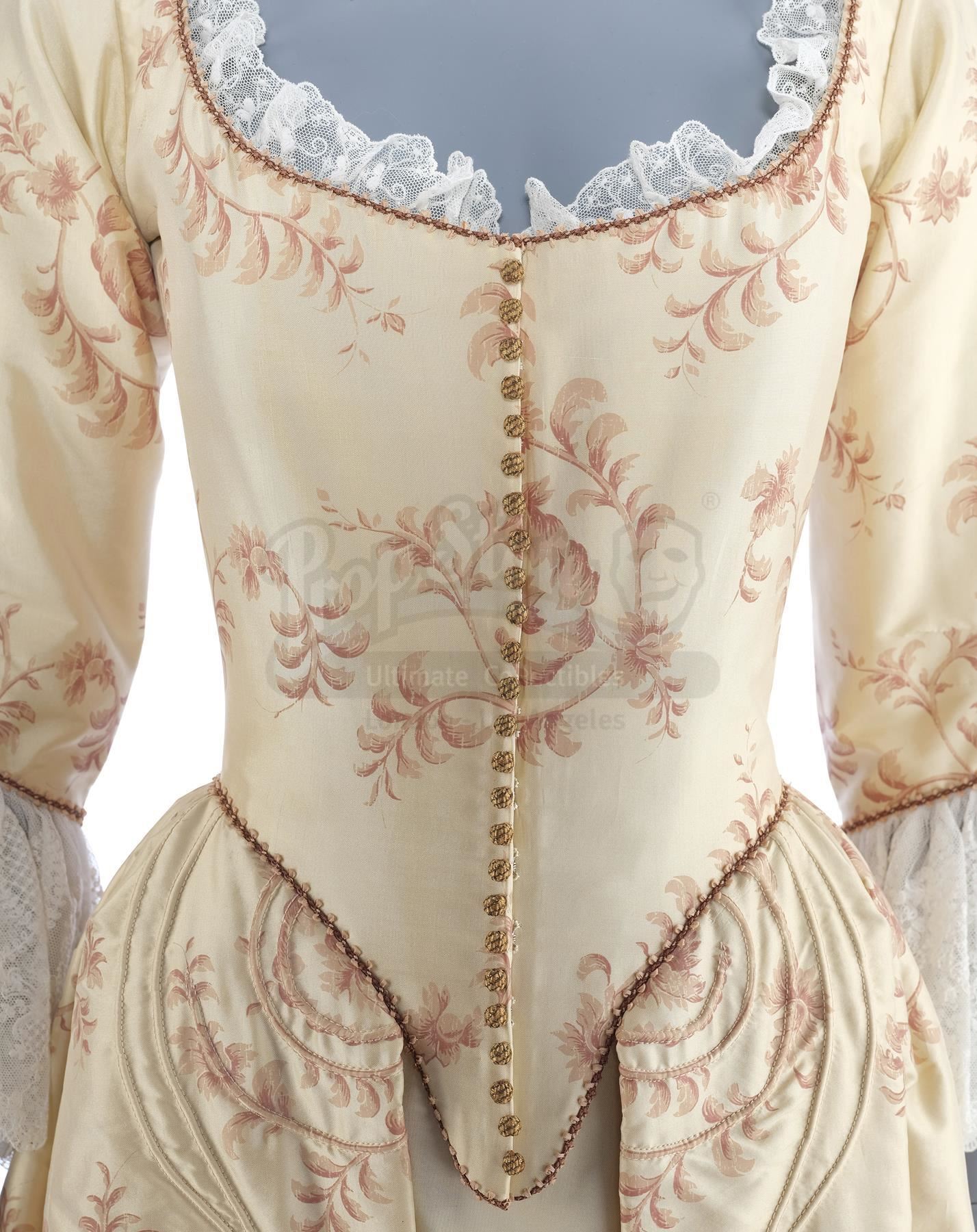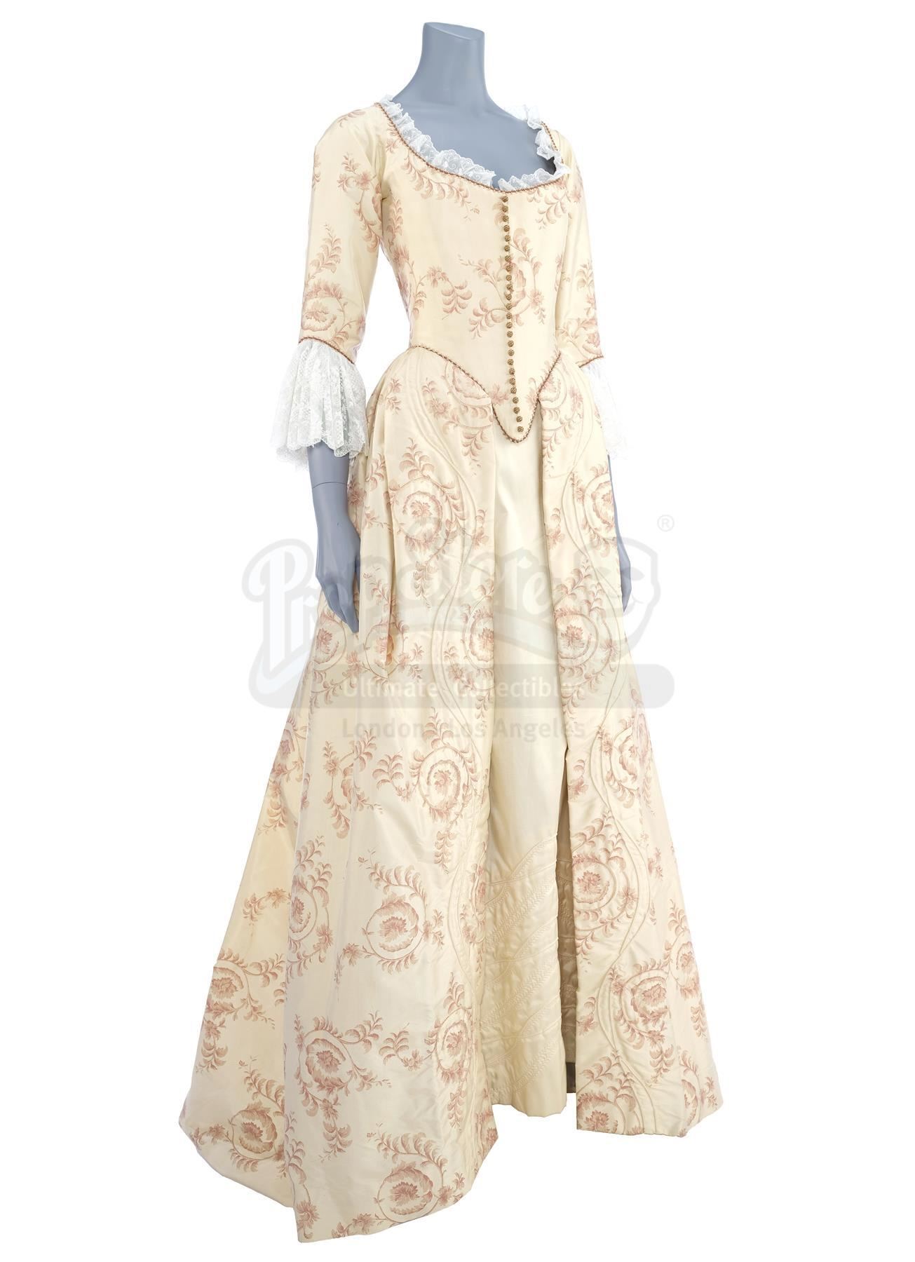 The lot consists of a dress and a petticoat. The peach-color dress features a floral vine pattern throughout with lace-trimmed sleeves and neckline. The petticoat is made of goldtone silk and features a decorative stitched hem. Both include a handwritten tag sewn into the piece, with the dress reading "Keira Knightley" and the petticoat tag reading "Kiera [sic] Knightley." Accompanying the costume is a wardrobe tag from production, with one side reading "Elizabeth Hero" and the other listing the change number and full costume components. The lot remains in excellent overall condition.
