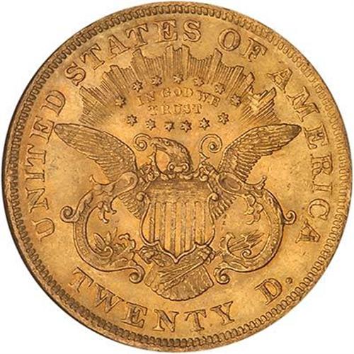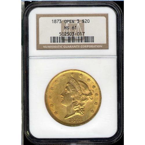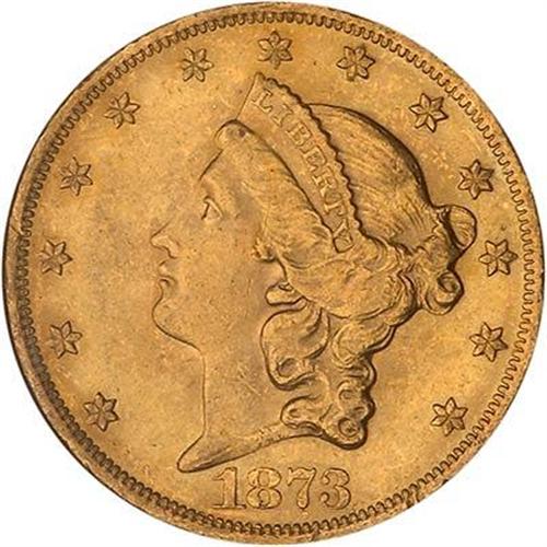 1873 $20 Liberty. Open 3. With pinkish orange patina on the devices and a fair number but not too many small contact abrasions that typify the grade. Lustrous, this is a popular Type 2 design, a coin that is much scarcer than the more heavily produced Type 3 issues of 1877-1907.