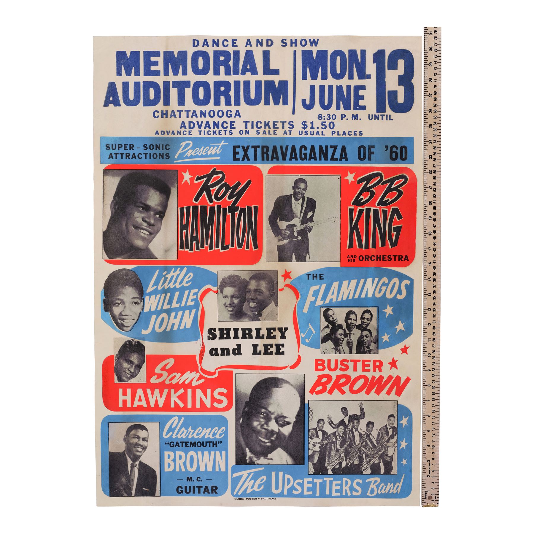 A concert poster promoting the "Extravaganza of '60" Super-Sonic Attractions Dance and Show held at the Memorial Auditorium in Chattanooga, Tennessee on June 13, 1960. Printed in both black-and-white and Dayglo pink and blue, this offset lithograph features images of acts on the lineup, including such legendary musicians as Roy Hamilton, BB King and his Orchestra, Little Willie John, Shirley and Lee, The Flamingos, Sam Hawkins, Buster Brown, Clarence "Gatemouth" Brown with M.C. Guitar, and the Upsetters band. Also listed are the date "Mon. June 13 8:30 PM Until" and price "Advanced Tickets $1.50." The poster grades as Very Fine with light sporadic staining, adhesive residue on the reverse, and a small tear in its lower left corner. Dimensions: 79 cm x 54.75 cm (31.25" x 21.5")
