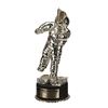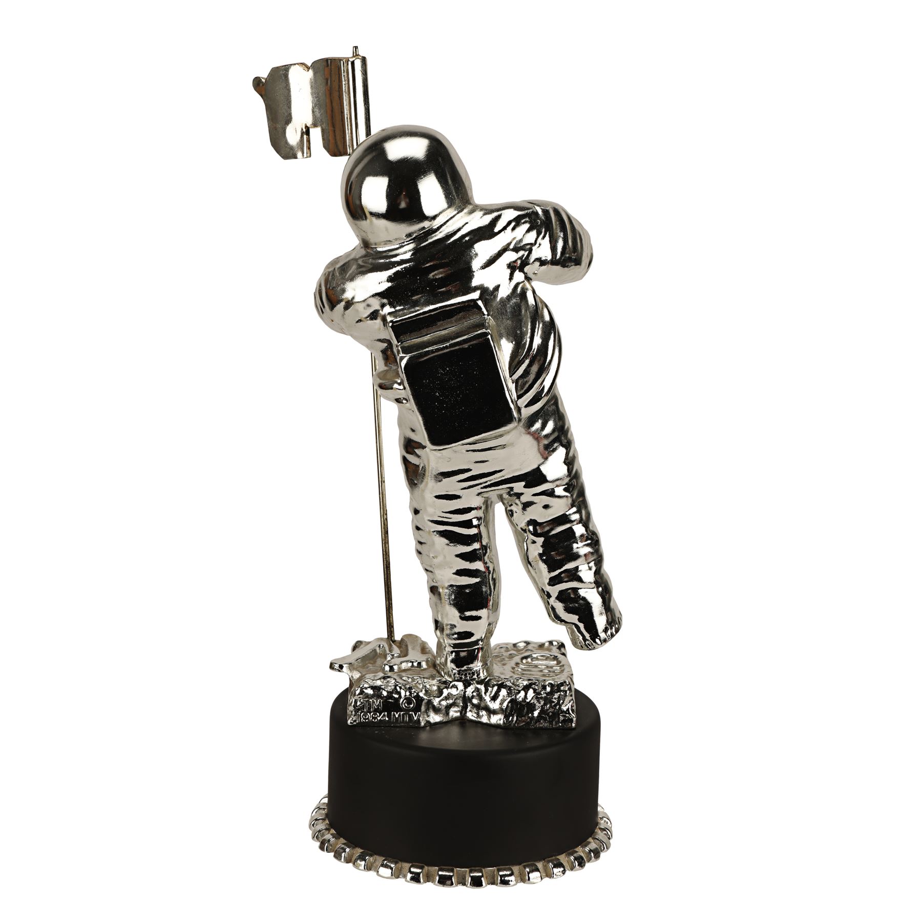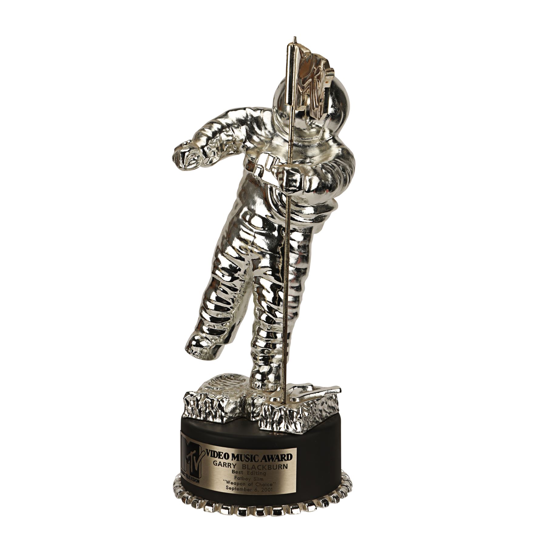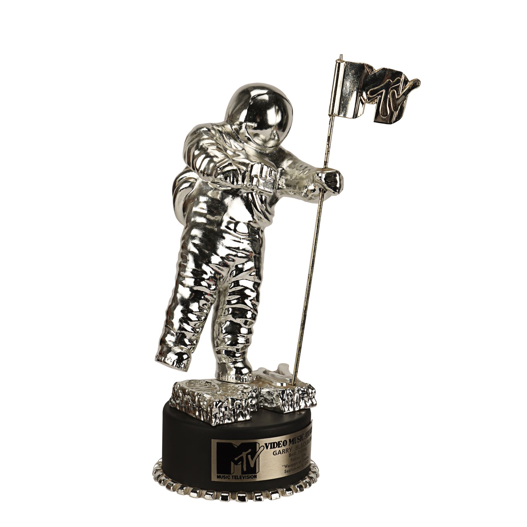 The award comprises a silver-coloured astronaut - now referred to as the "Moon Person" - mounted on a circular base holding a flag that displays the MTV logo. An engraved metal plaque on the front features details of the award. The silver finish has worn away in places over time, and the base exhibits some minor marks. Dimensions: 13 cm x 13 cm x 32.5 cm (5 1/4" x 5 1/4" x 12 3/4")