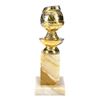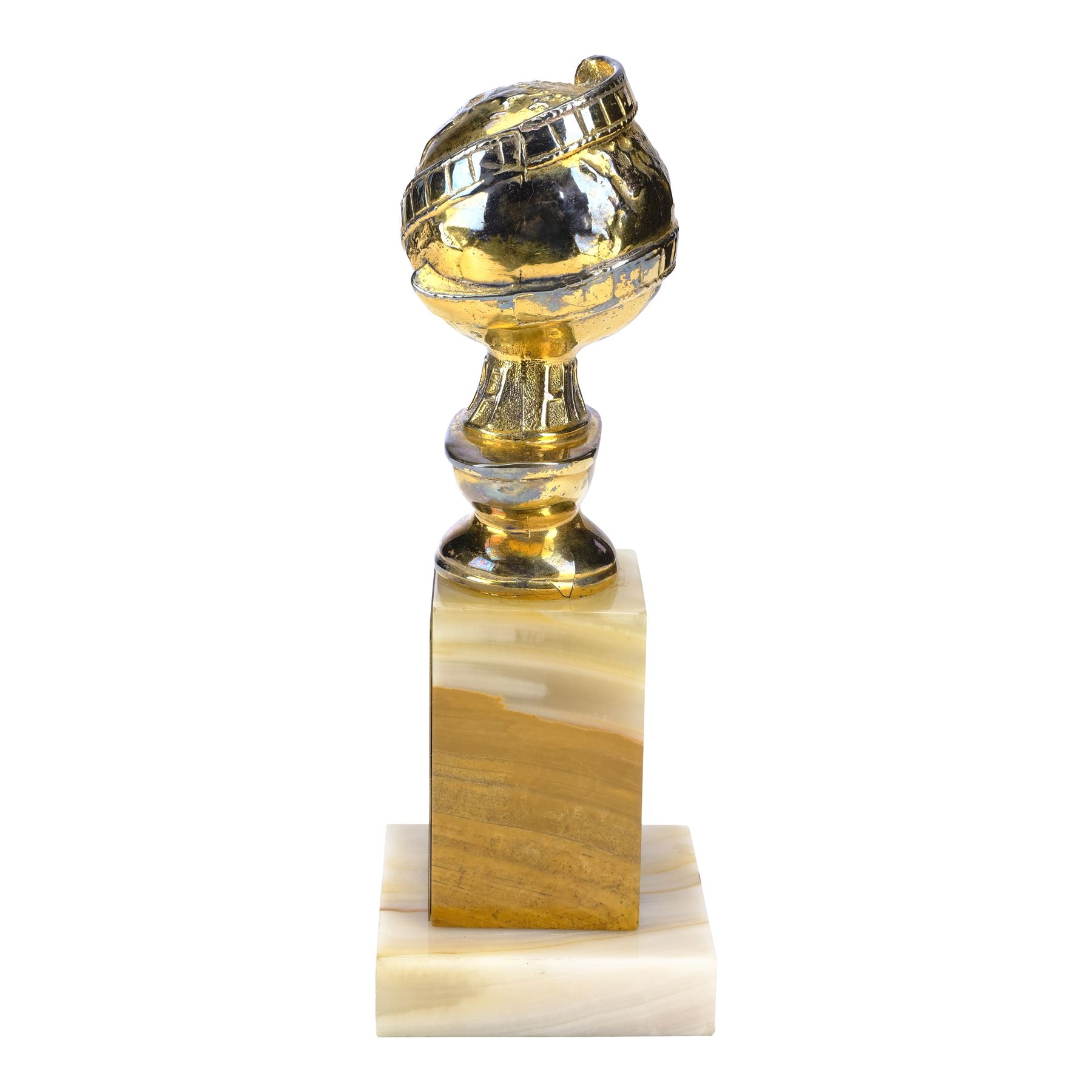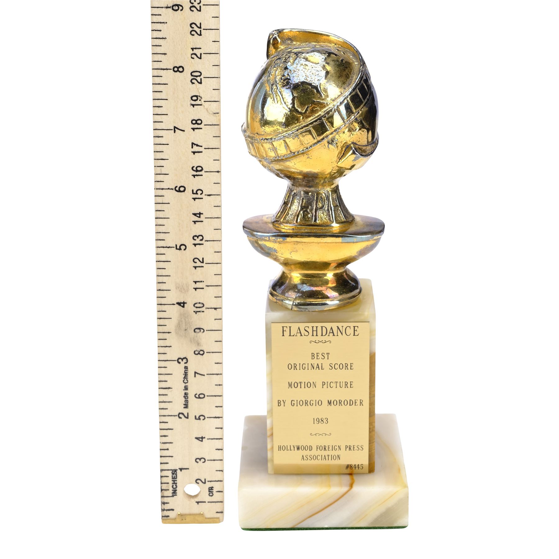 This trophy features a gold-colour metal top depicting a globe with a film strip wrapped around it, a marble base, a felt bottom, and an attached gold-colour plaque reading "Flashdance Best Original Score Motion Picture by Giorgio Moroder 1983 Hollywood Foreign Press Association #8445." The bottom features a label for Awards Plus, Rex Trophies, and Awards-Rex. The top exhibits denting, scratching, and chipping; and the marble exhibits wear along the edges. Dimensions: 8.5 cm x 8.5 cm x 23 cm (3.25" x 3.25" x 9")