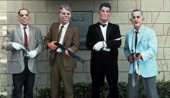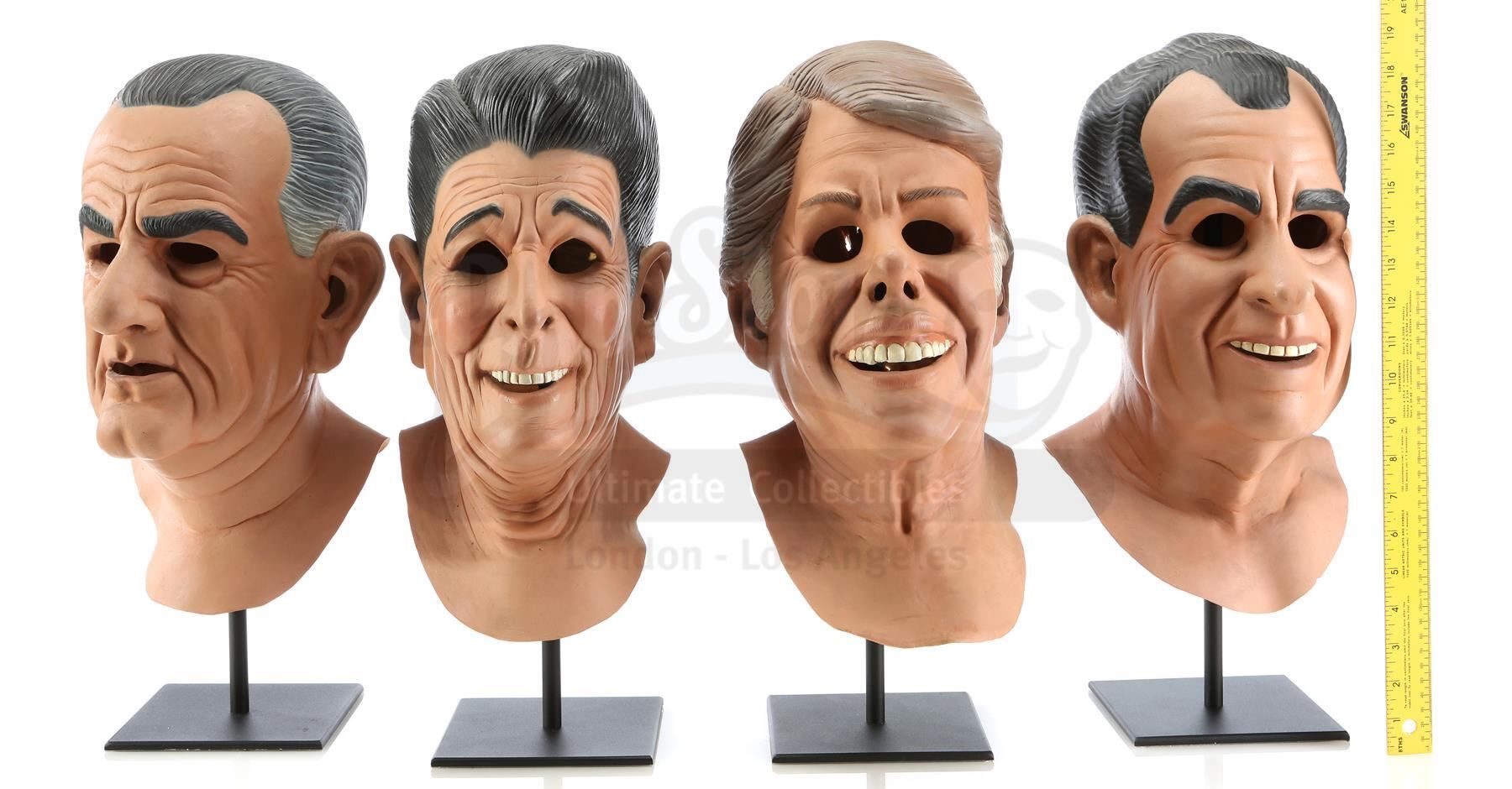 A set of four refrence copy bank robbery presidents masks from Kathryn Bigelow's heist thriller Point Break. A gang of surfers called The Ex-Presidents orchestrated bank robberies while disguised as Ronald Reagan, Jimmy Carter, Richard Nixon, and Lyndon B. Johnson.