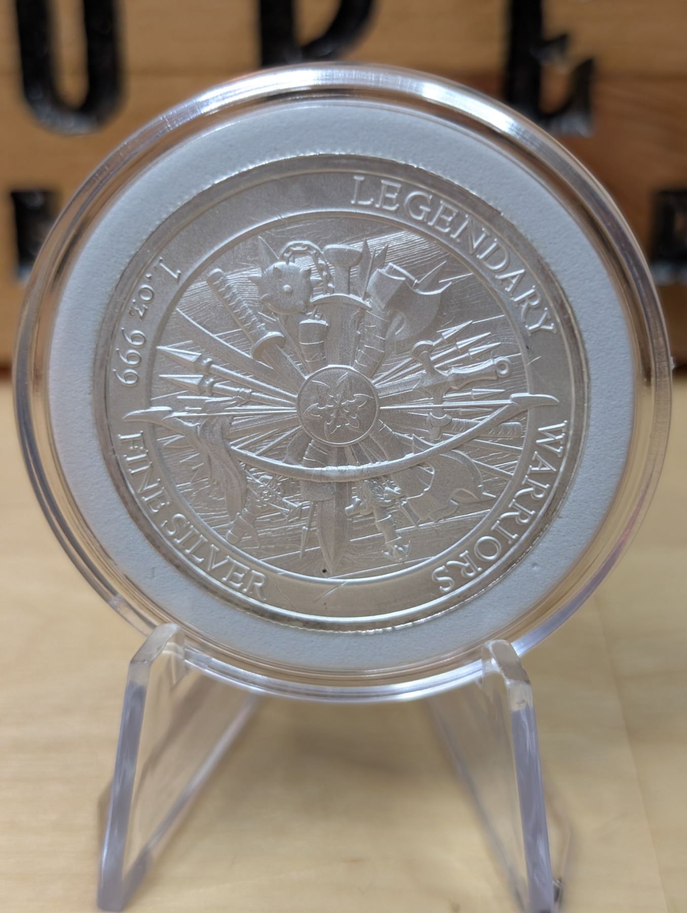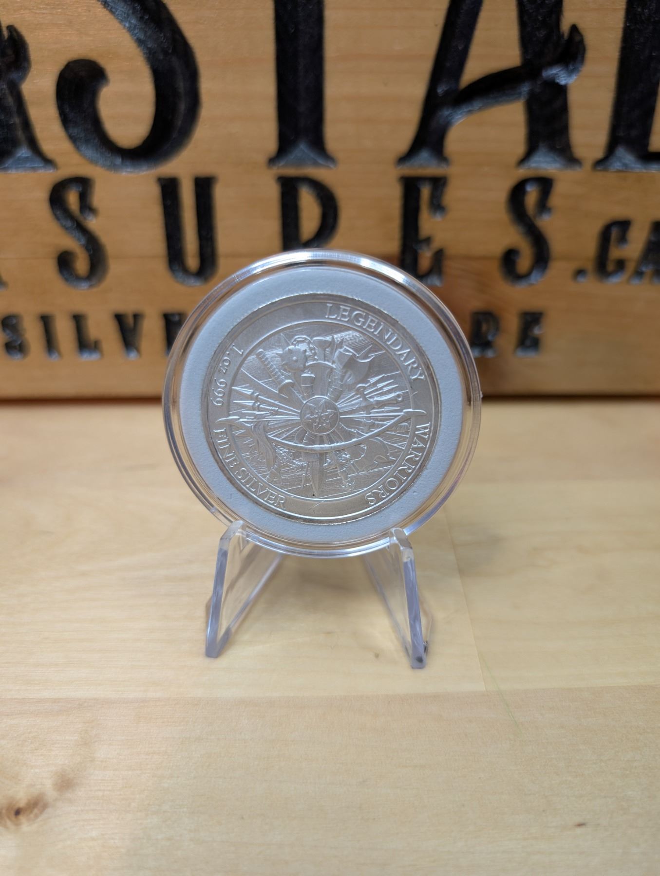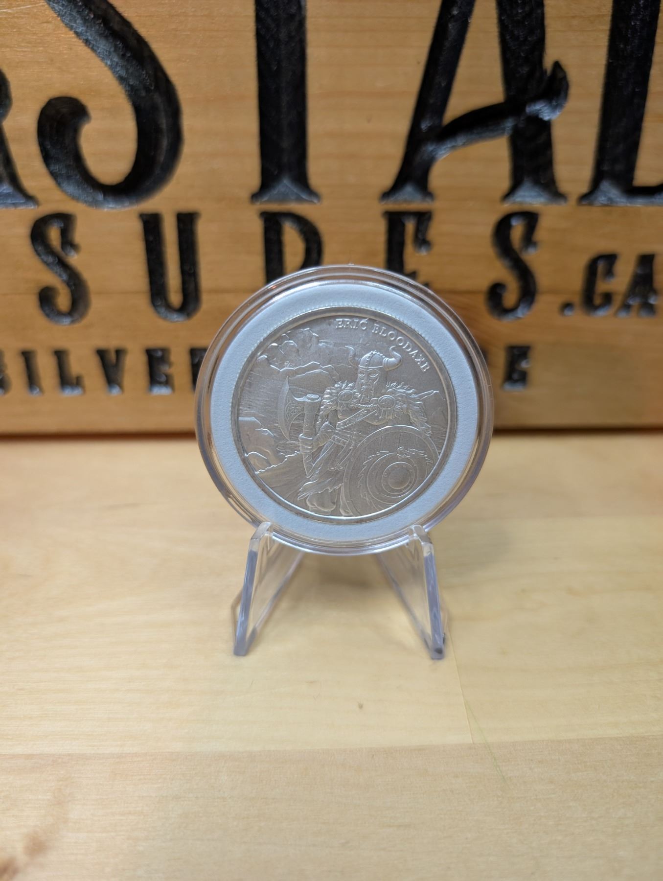 The 1 oz Eric Bloodaxe Legendary Warriors silver round is made from .999 fine silver and features a design of Eric Bloodaxe, a Viking king known for his warrior legacy. Part of the Legendary Warriors series, this round is popular with collectors due to its historical theme and detailed design. Its value is based on the current silver price and collector demand.
