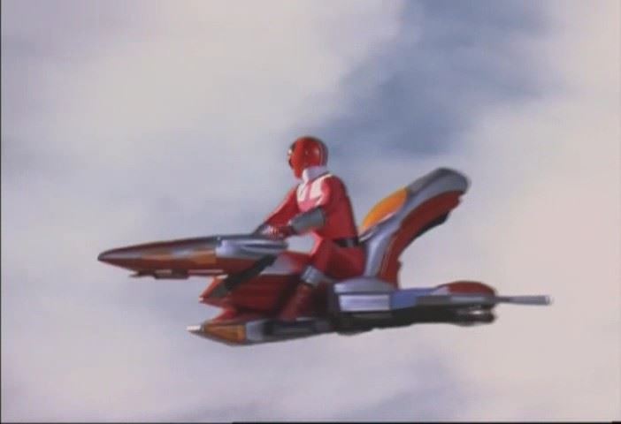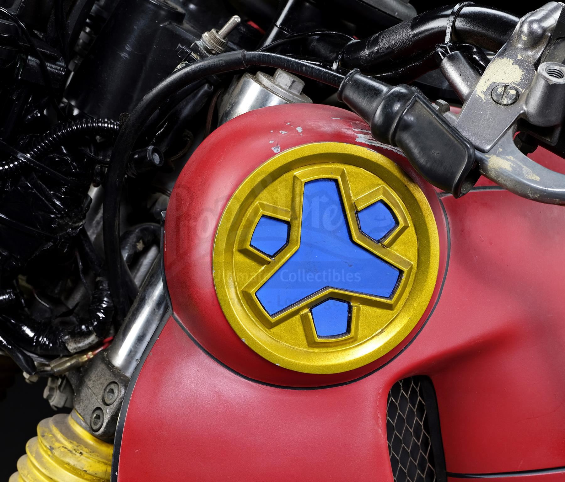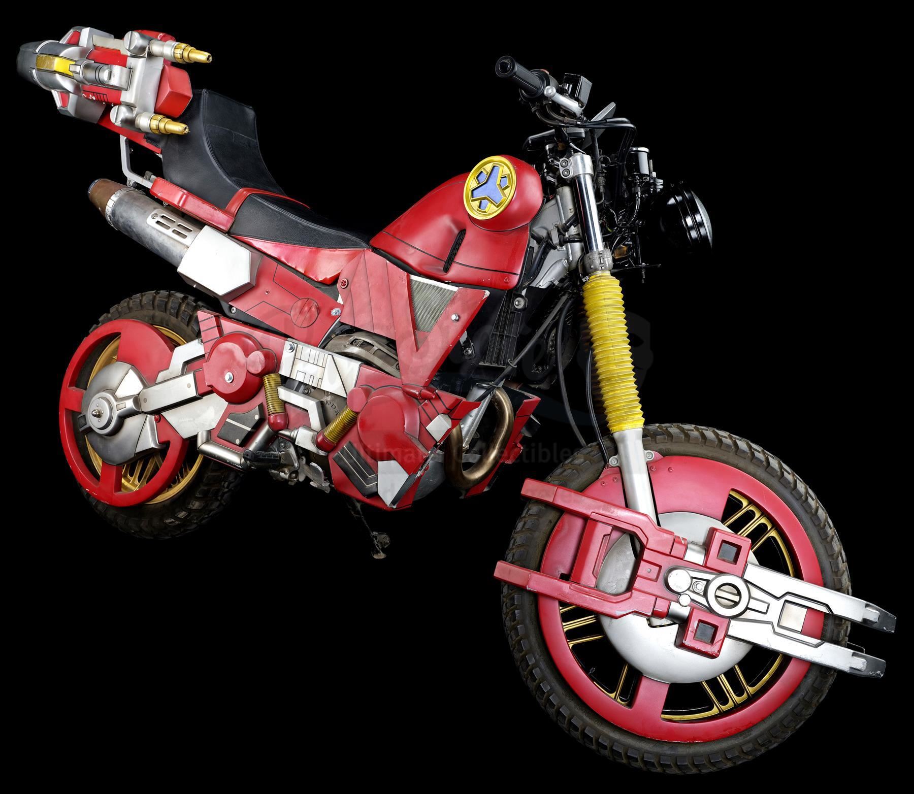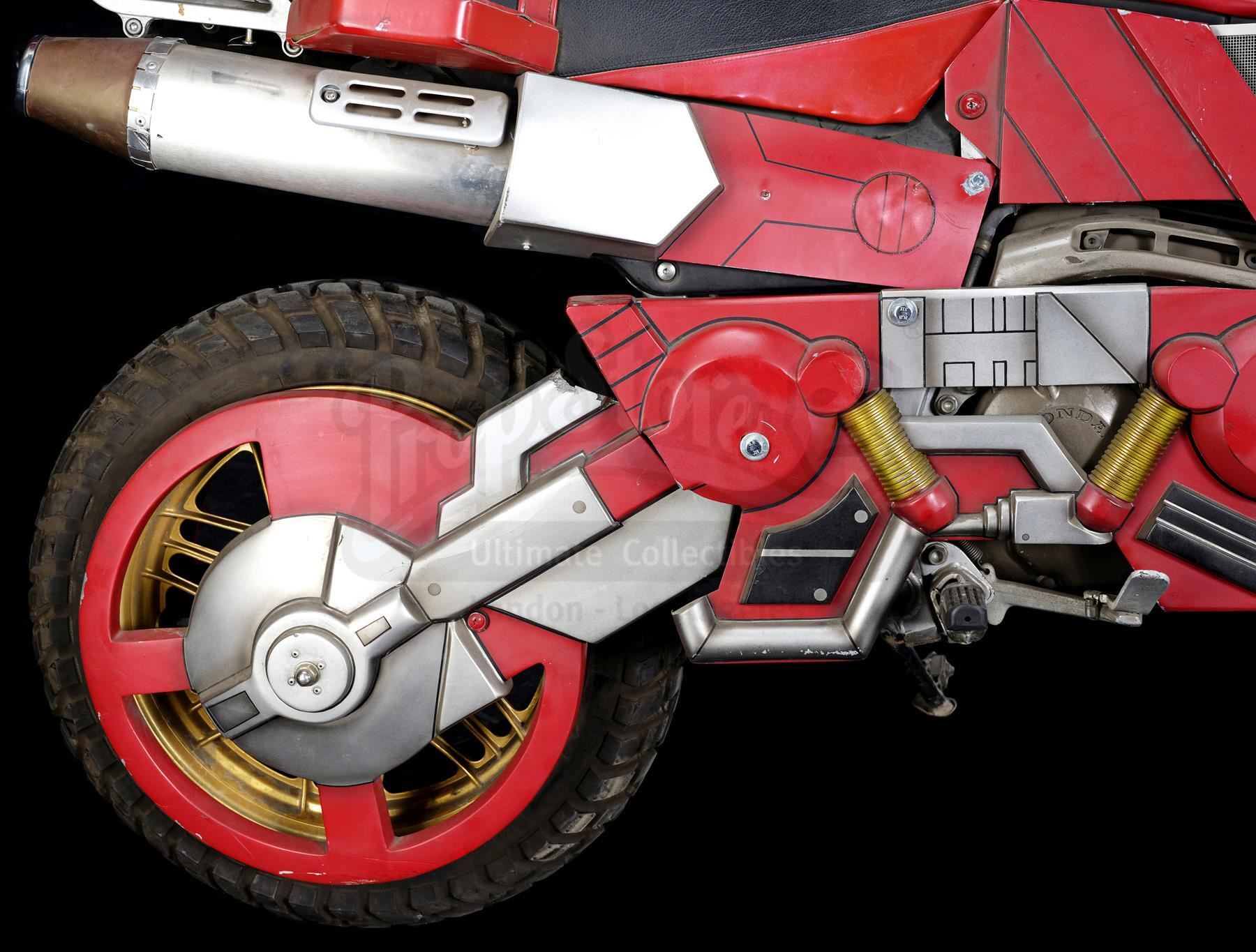 A full-size Strata Cycle from the television action series Power Rangers Lightspeed Rescue and Power Rangers Time Force. After Carter Drayson (Sean Cw Johnson), the Red Lightspeed Ranger, used the Strata Cycle to defeat Vypra (Jennifer L. Yen) in Lightspeed Rescue, Alex Drake (Jason Faunt), the Red Time Force Ranger, gave it to Wes Collins (Faunt) when he granted him the mantle of the new Red Time Force Ranger in Time Force.