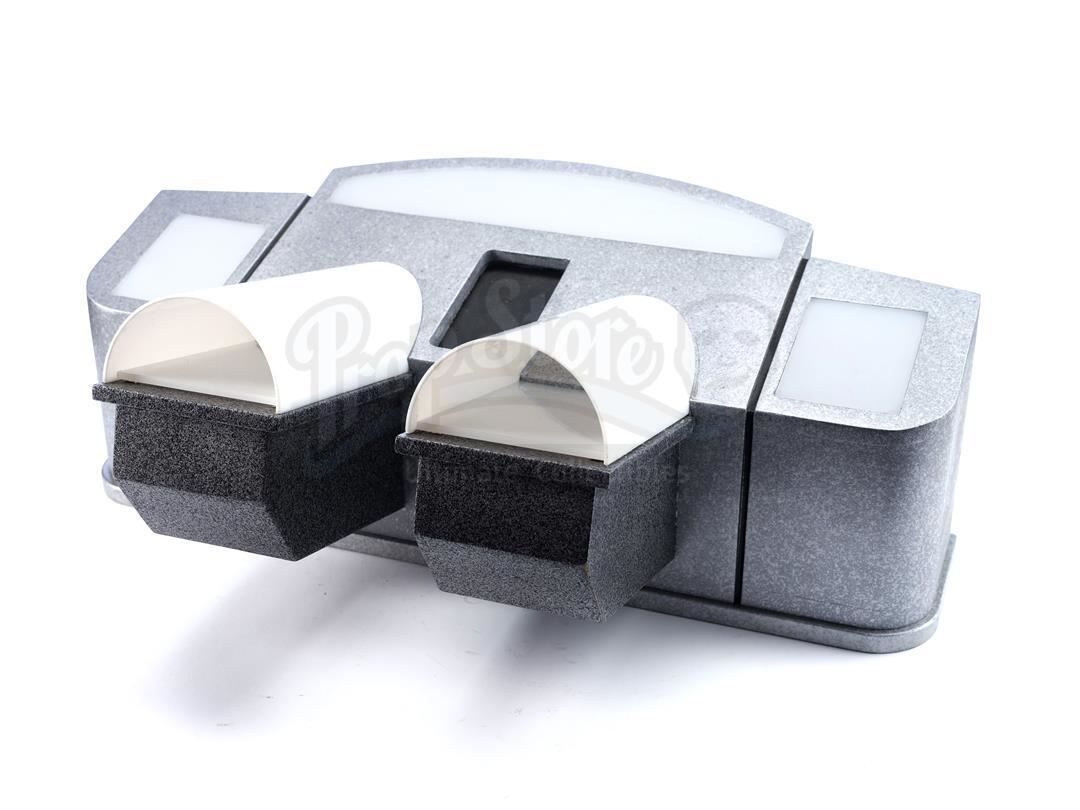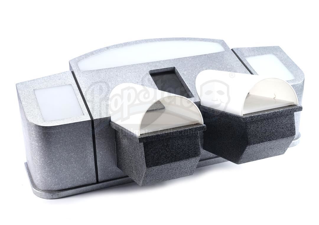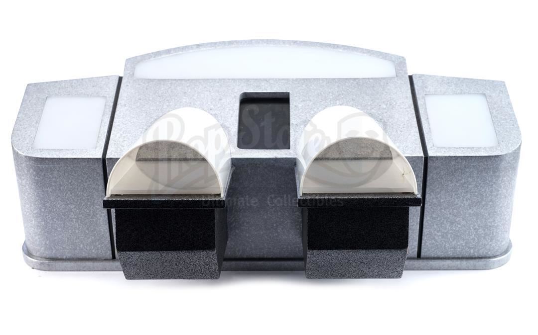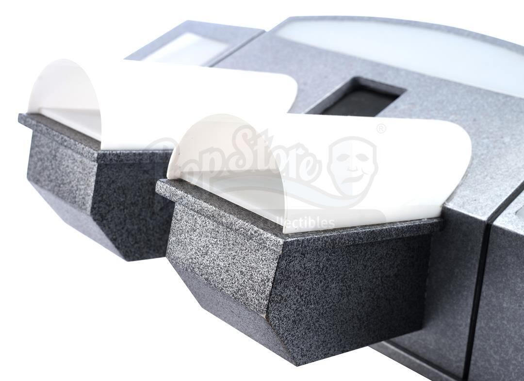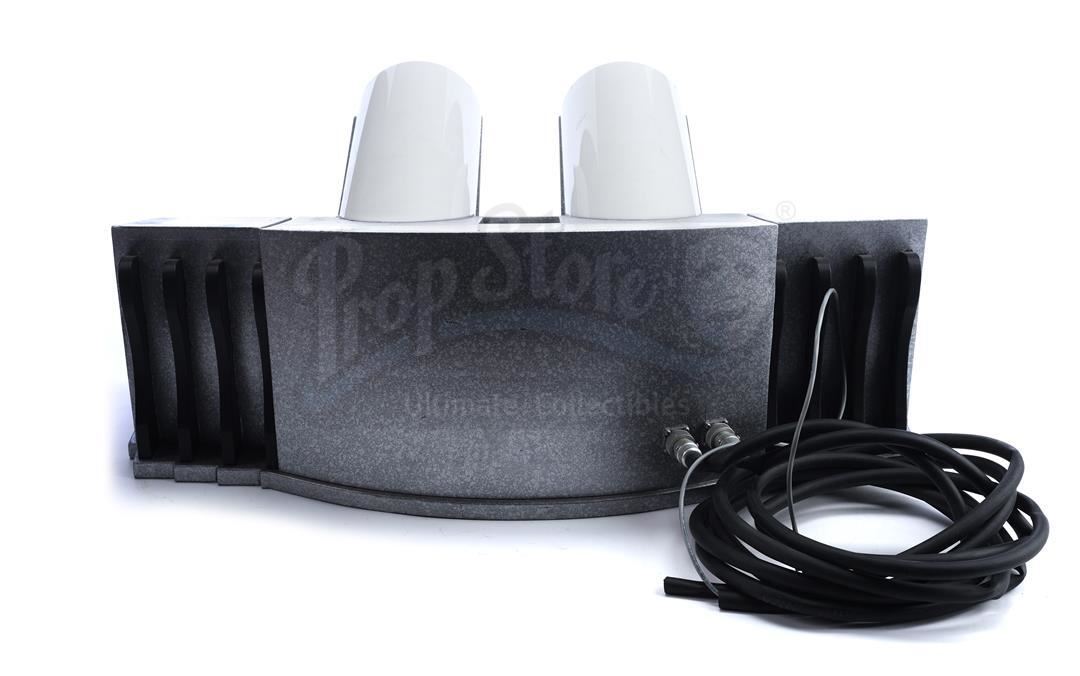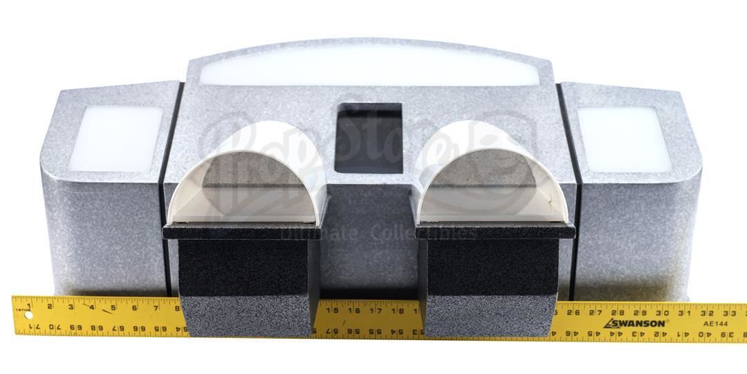 A light-up Chronicom console from Season 7 of Marvel's Agents of S.H.I.E.L.D. Both Chronicoms, like Sibyl, and humans, such as Phil Coulson and John Garrett, operate otherworldly console devices throughout the season to study and communicate through time. This lot consists of a gray speckled wood and urethane console with three LED displays, a pair of white urethane cylindrical details, and a pair of rubber tubes protruding from the front, one of which contains a power cord that, when connected, powers illuminates LED lights in the device. It is in good overall condition with some wear from production throughout including detachment on one of the cylindrical details. This item contains electronic and mechanical components. While every effort is made to describe them accurately, no guarantee or warranty is made as to the functionality, lifespan or safety of those components. It is entirely incumbent on the new owner to satisfy themselves as to their safe use and maintenance. Dimensions: 22" x 31" x 12" (56 cm x 78.75 cm x 30.5 cm)