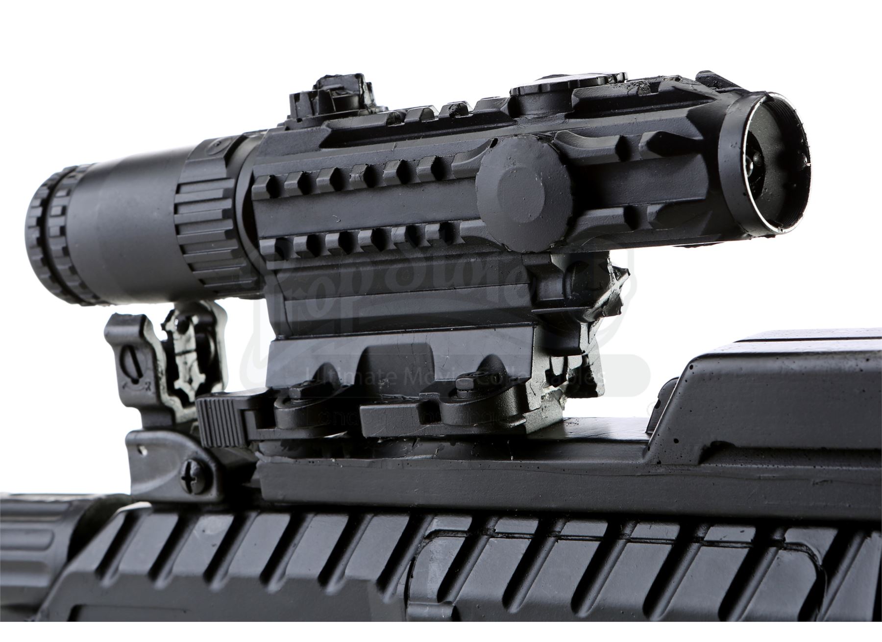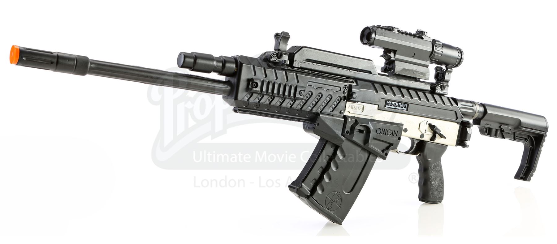 Willis ‘Diamondback’ Stryker’s stunt tactical rifle from the episodes ‘Manifest’ (107) and ‘Blowin’ Up the Spot’ (108) of Marvel's Luke Cage. In the episodes, Stryker fires Judas bullets at Luke Cage in an attempt to kill him. This lot consists of a black and silver plastic and dense foam stunt machine gun with a metal rod interior. It is in good overall condition with some signs of wear from production. A blaze orange plug was affixed to the end of the piece after production in order for it to be sold as a collectible.