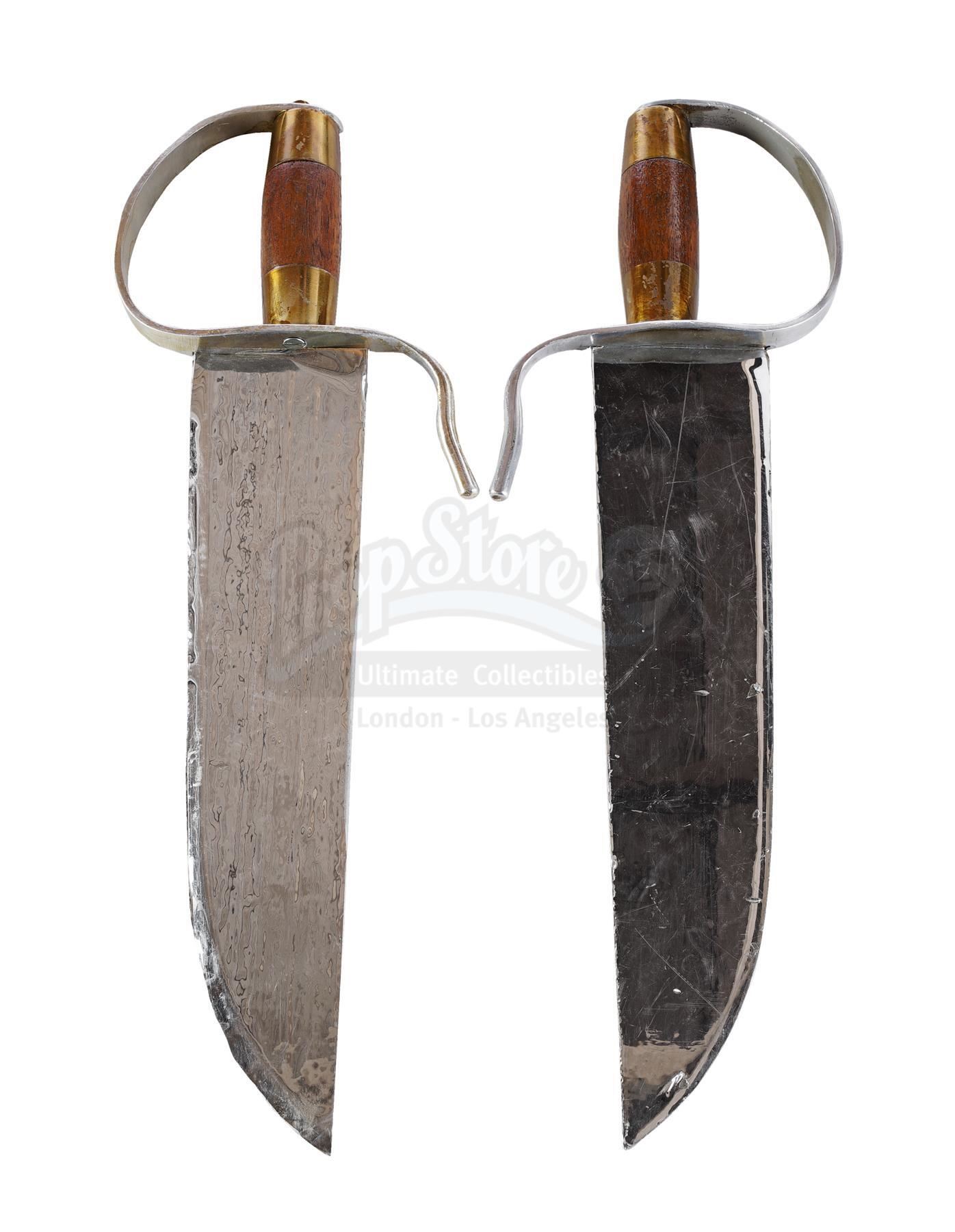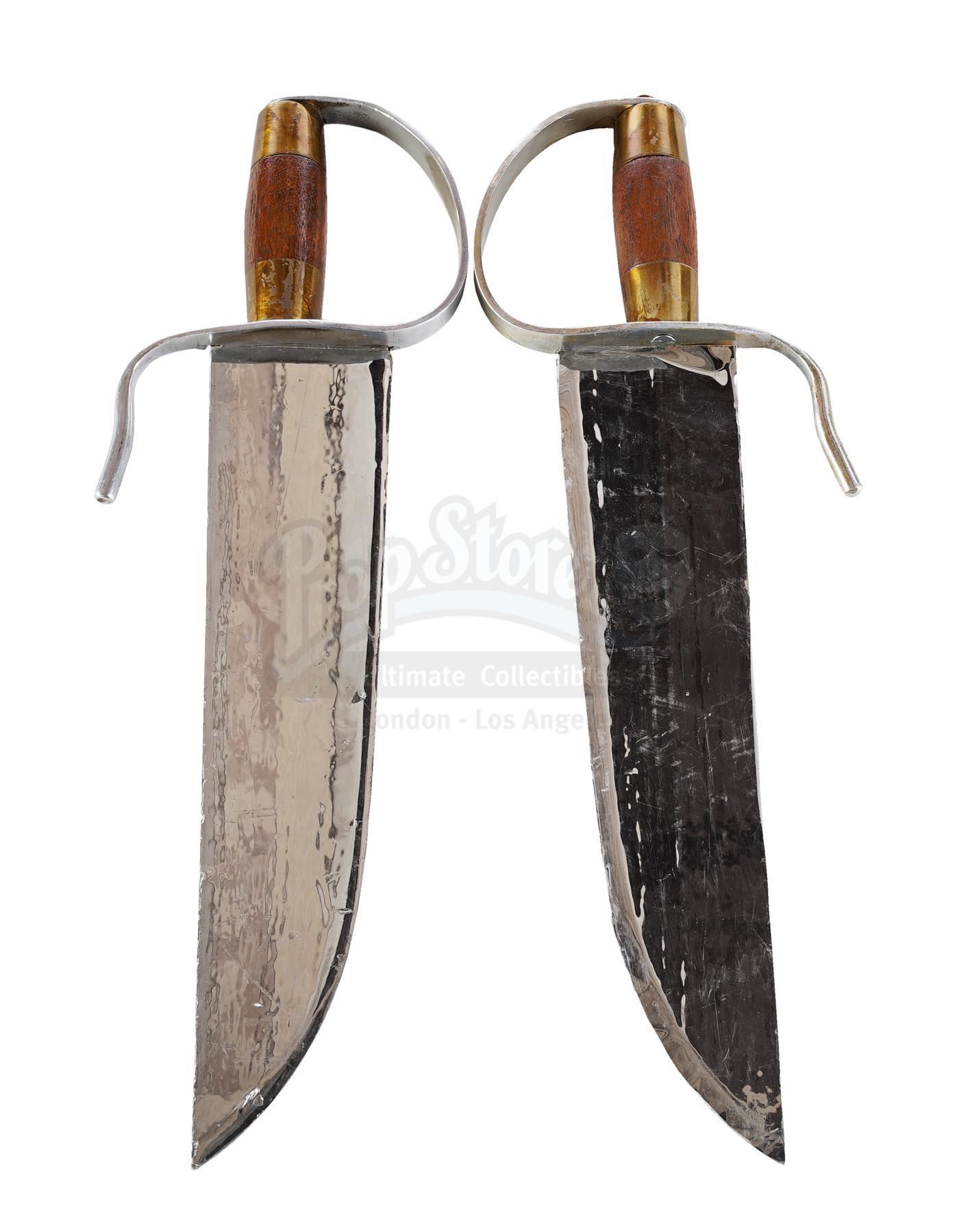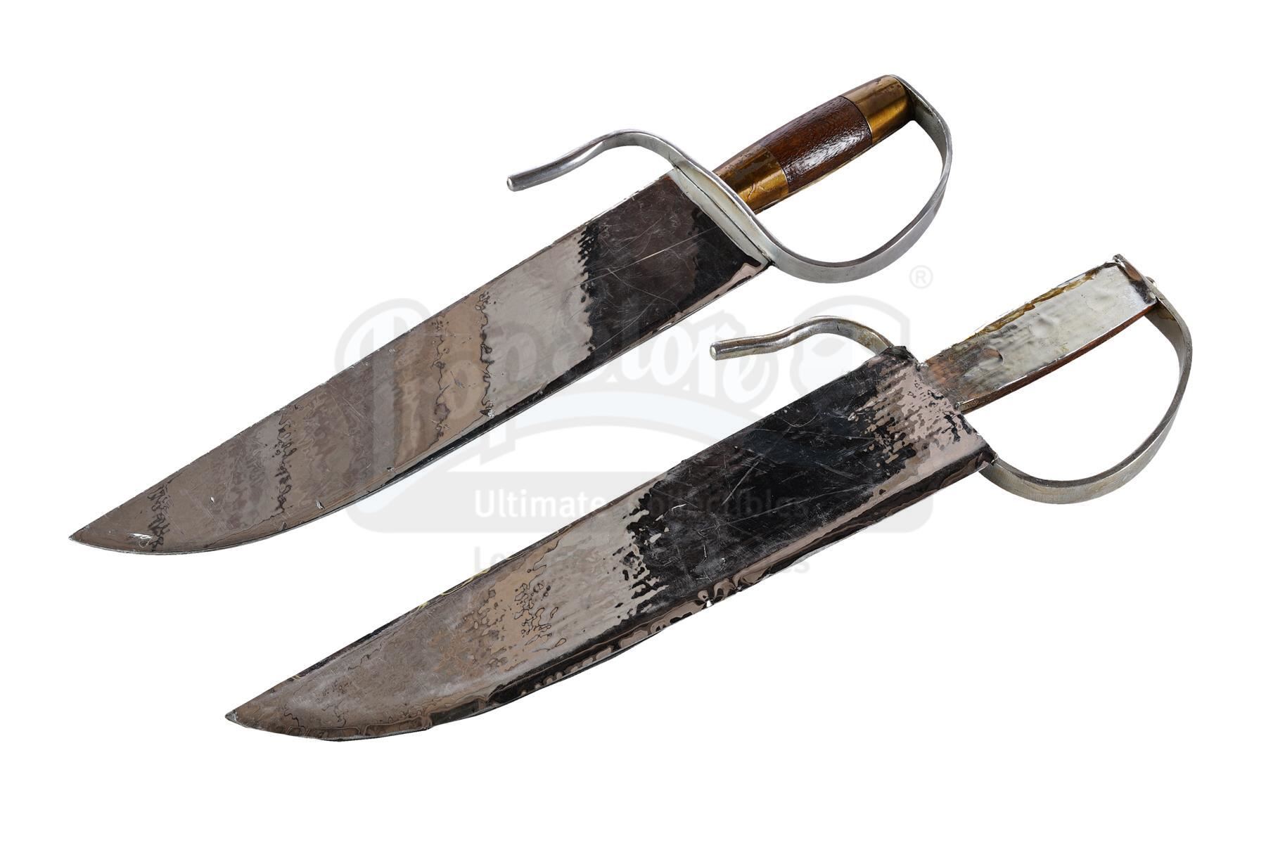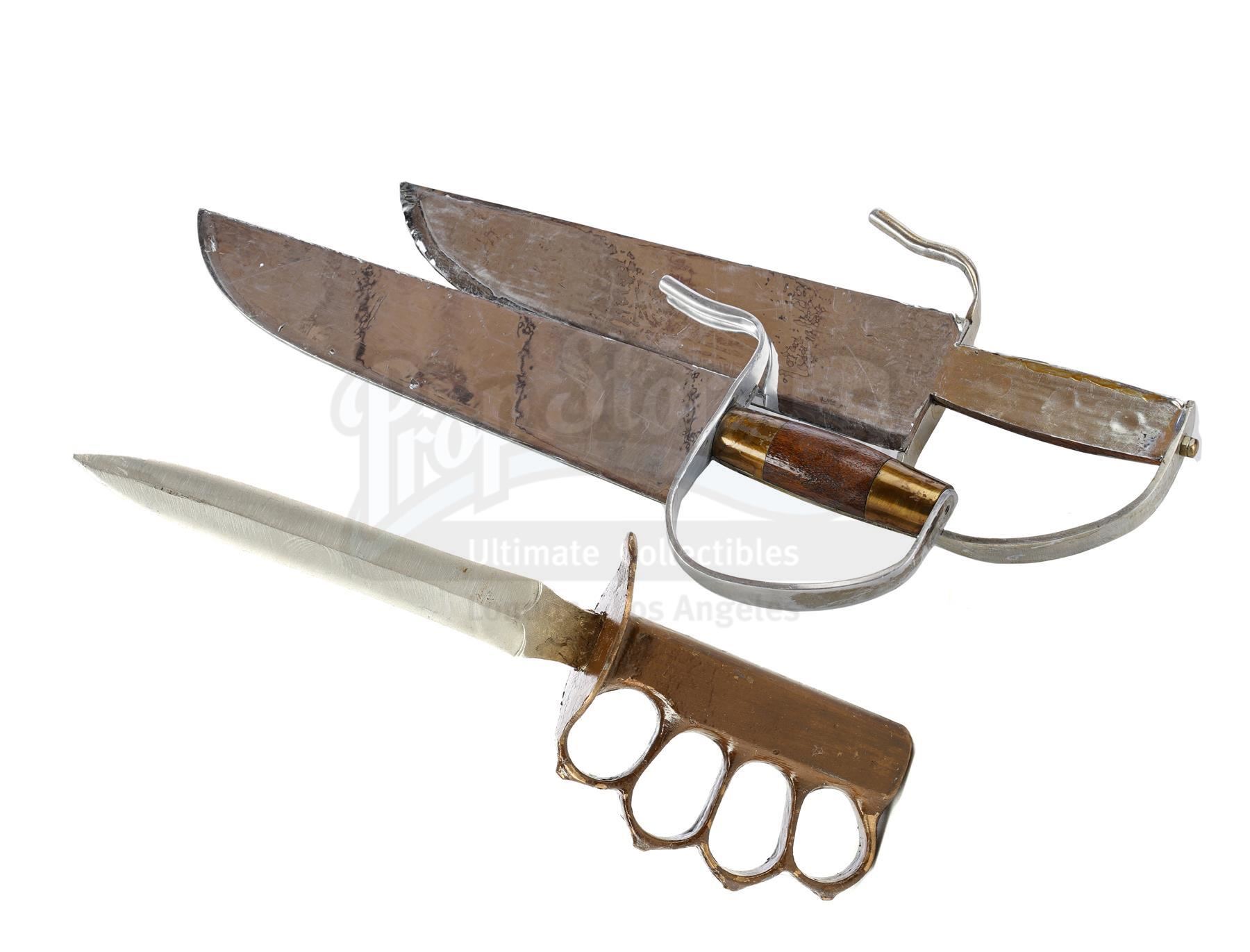 This lot will be auctioned on Wednesday, June 30th. The auction will begin at 9:00am PDT and lots are sold sequentially via live auctioneer; tune in to the live streaming broadcast on auction day to follow the pace. Note other lots in the auction may close on June 29th or July 1st. A set of Wing Kong and Chang Sing knives from John Carpenter's action comedy Big Trouble in Little China. The Chang Sing wielded knives in battle against their criminal rivals, the Wing Kong. This set consists of two resin Wing Kong blades with metal and wood handles and silver-color decals, as well as a bronze-handled metal Chang Sing dagger with knuckle grips. It is in good overall condition with some scrapes and chipping on the decals from production use. Dimensions (largest): 16" x 5.5" x 1" (40.75 cm x 14 cm x 2.75 cm); (smallest): 11" x 4" x 2" (28 cm x 10.25 cm x 5 cm) Estimate: $1,000 - 1,500