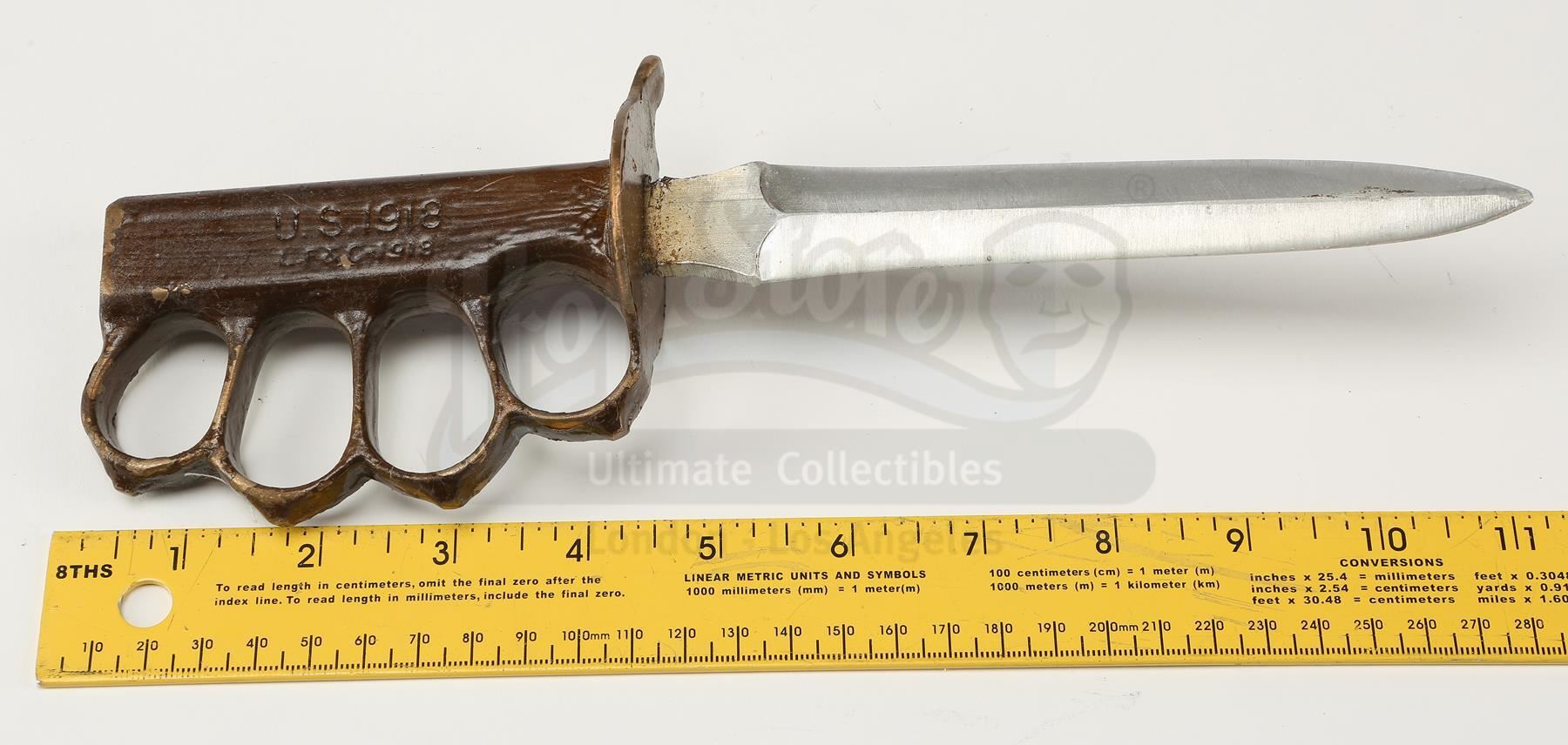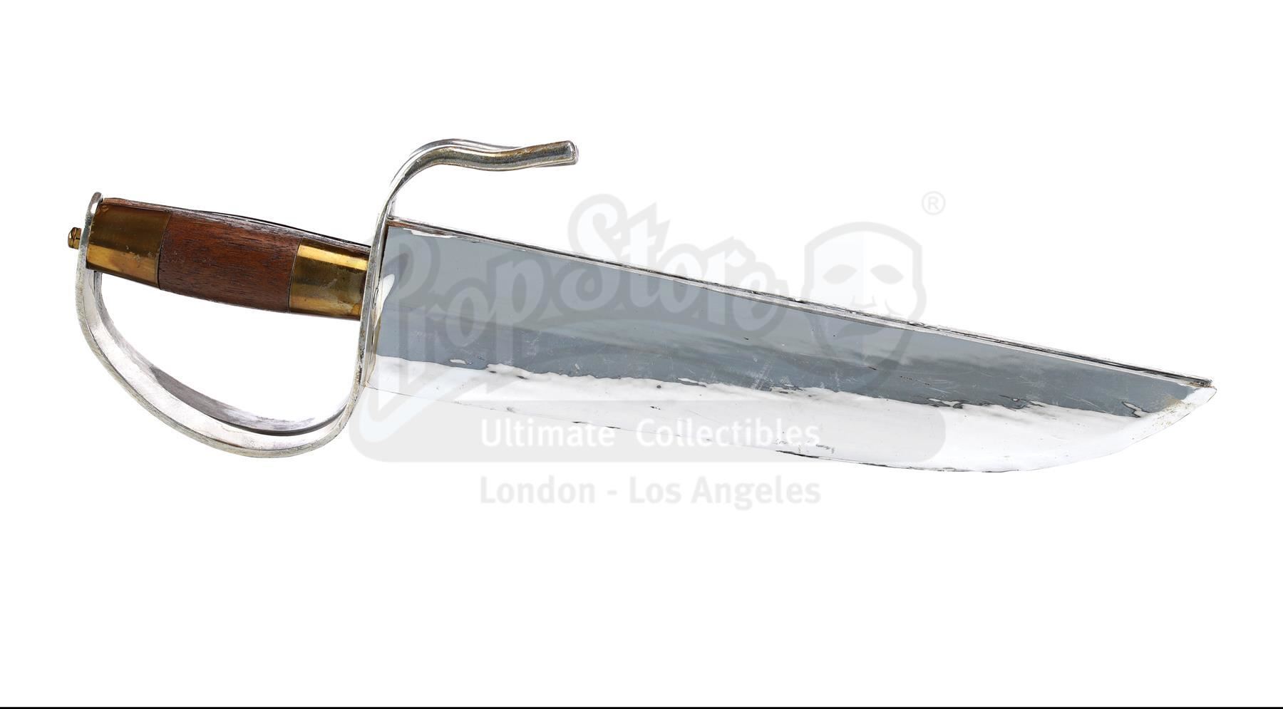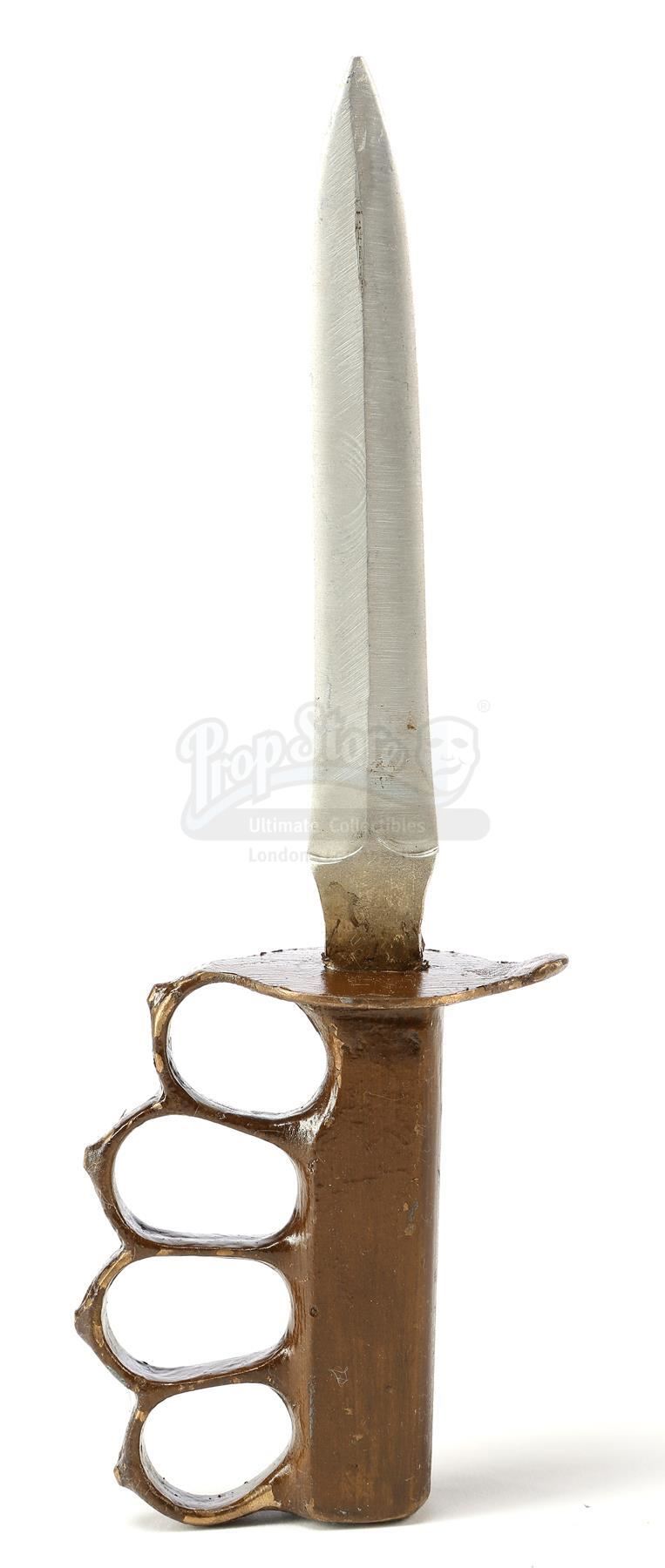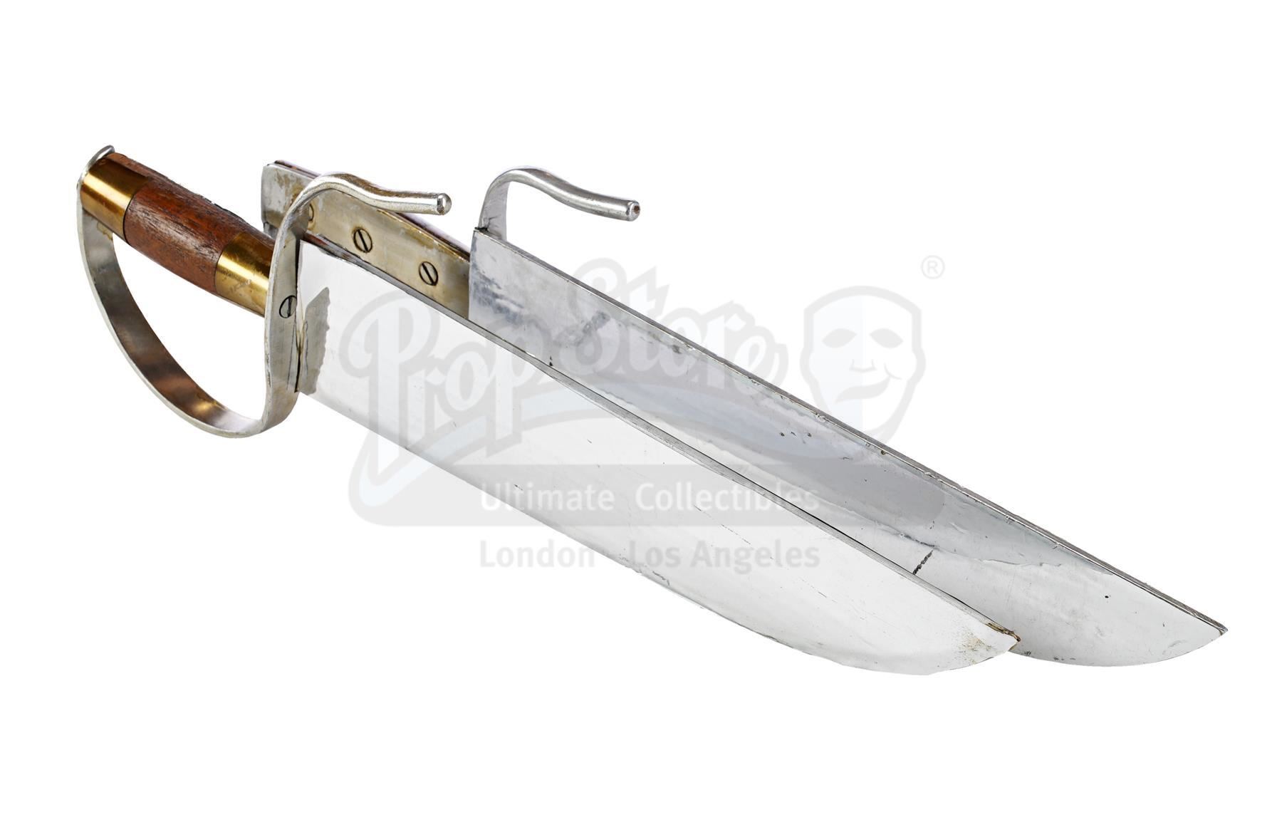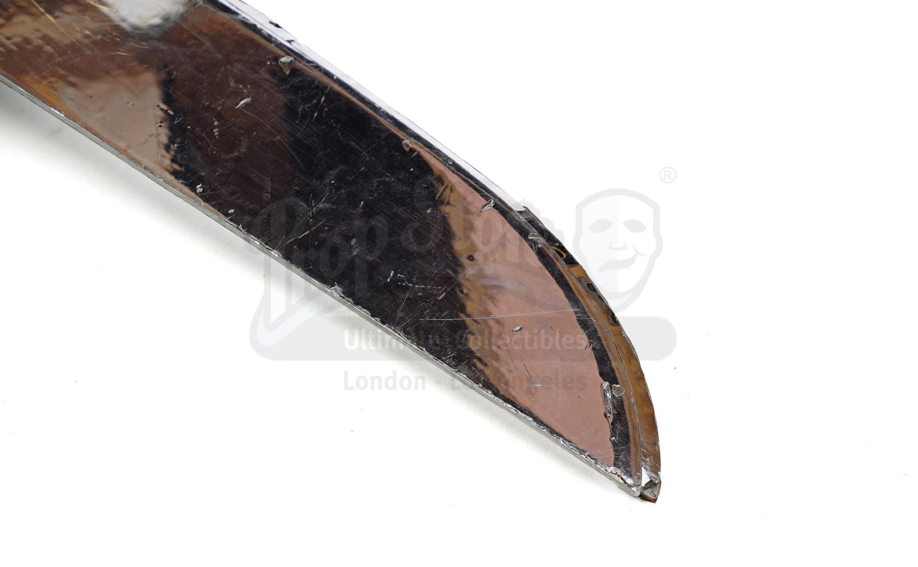 This lot will be auctioned on Wednesday, June 30th. The auction will begin at 9:00am PDT and lots are sold sequentially via live auctioneer; tune in to the live streaming broadcast on auction day to follow the pace. Note other lots in the auction may close on June 29th or July 1st. A set of Wing Kong and Chang Sing knives from John Carpenter's action comedy Big Trouble in Little China. The Chang Sing wielded knives in battle against their criminal rivals, the Wing Kong. This set consists of two resin Wing Kong blades with metal and wood handles and silver-color decals, as well as a bronze-handled metal Chang Sing dagger with knuckle grips. It is in good overall condition with some scrapes and chipping on the decals from production use. Dimensions (largest): 16" x 5.5" x 1" (40.75 cm x 14 cm x 2.75 cm); (smallest): 11" x 4" x 2" (28 cm x 10.25 cm x 5 cm) Estimate: $1,000 - 1,500