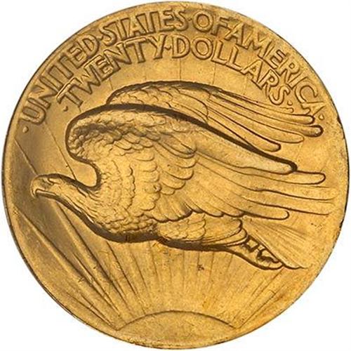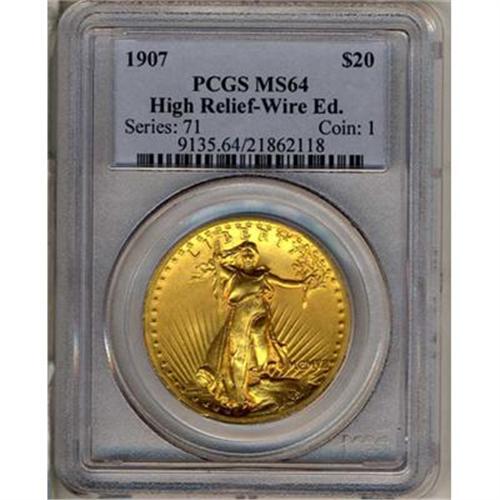 1907 $20 St. Gaudens. High relief, Roman numerals, wire rim. As was true of the 1907 Indian designs for the Eagle, the present piece was the product of Theodore Roosevelt's association with Augustus Saint-Gaudens, America's most distinguished sculptor at the time. It was originally planned that the entire range of American coinage would be changed, from the lowly One-cent piece through the Double Eagle. In correspondence, Augustus Saint-Gaudens felt that the 1857 Flying Eagle Cent was the finest motif found on any American coin. It is interesting to note that this same motif he used on the Double Eagle offered here. Only about 11,250 High Relief $20 gold pieces were made. These required special equipment to manufacture and so, as it turned out, were a very limited issue. Handsome as this coin is, it thoroughly meets or surpasses all of the criteria for the MS64 grade including clear-cut relief, satiny swirling luster on both sides, exceptionally nice rims with a "fin" or wire edge, and overall aesthetic appeal. (#9135)