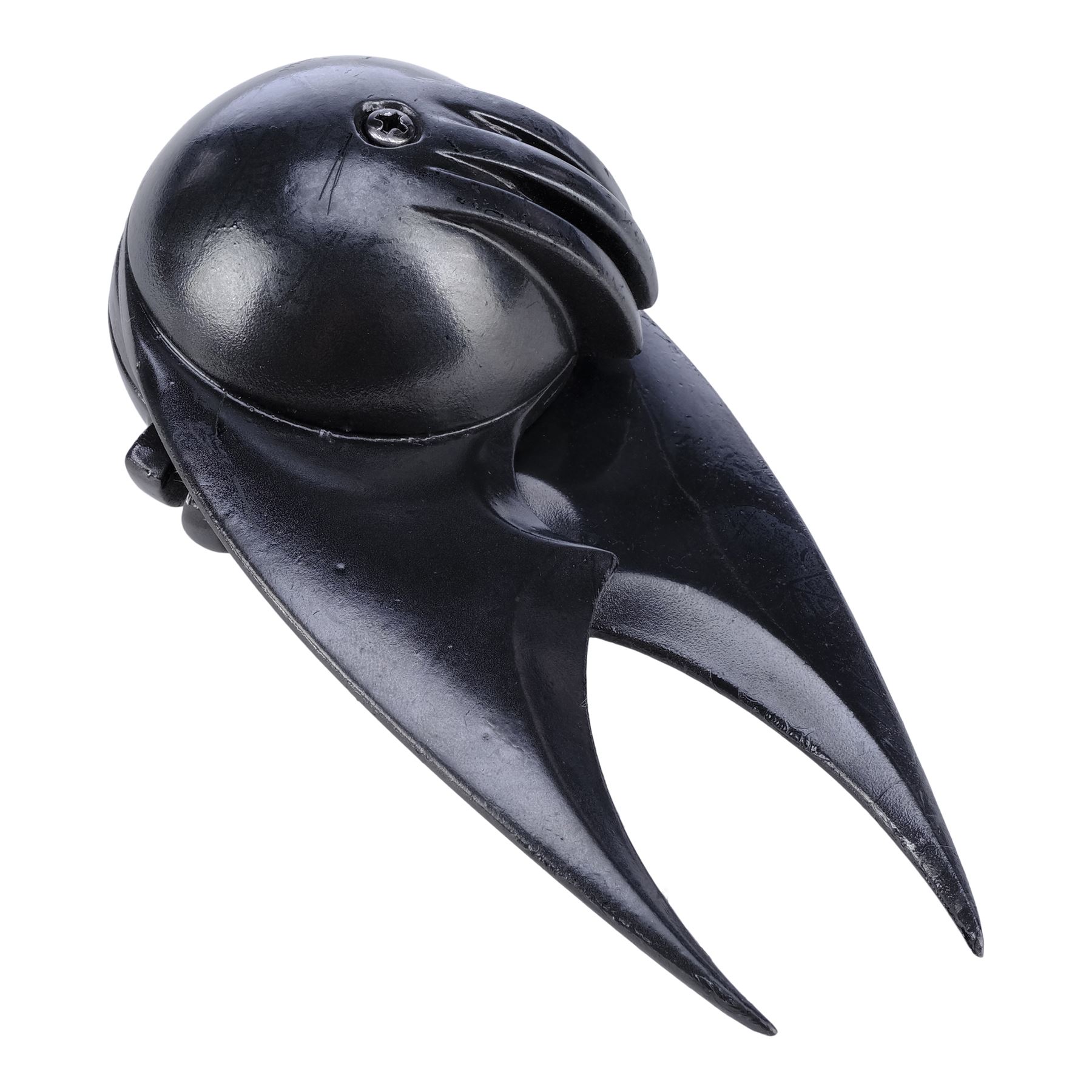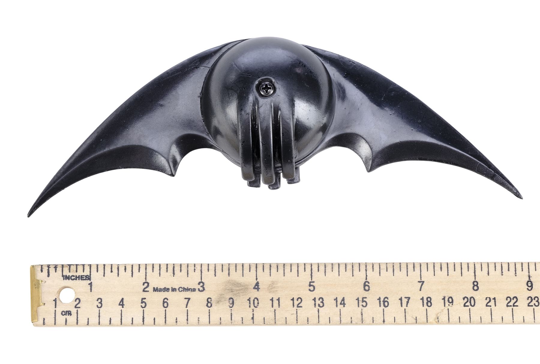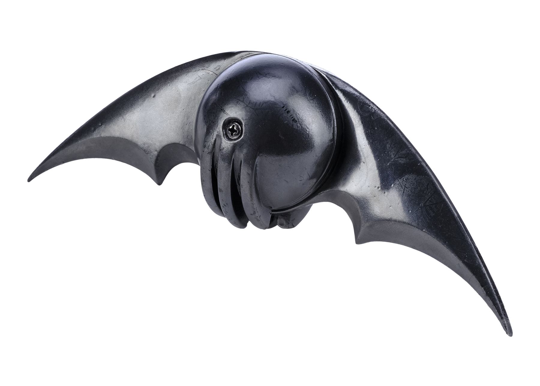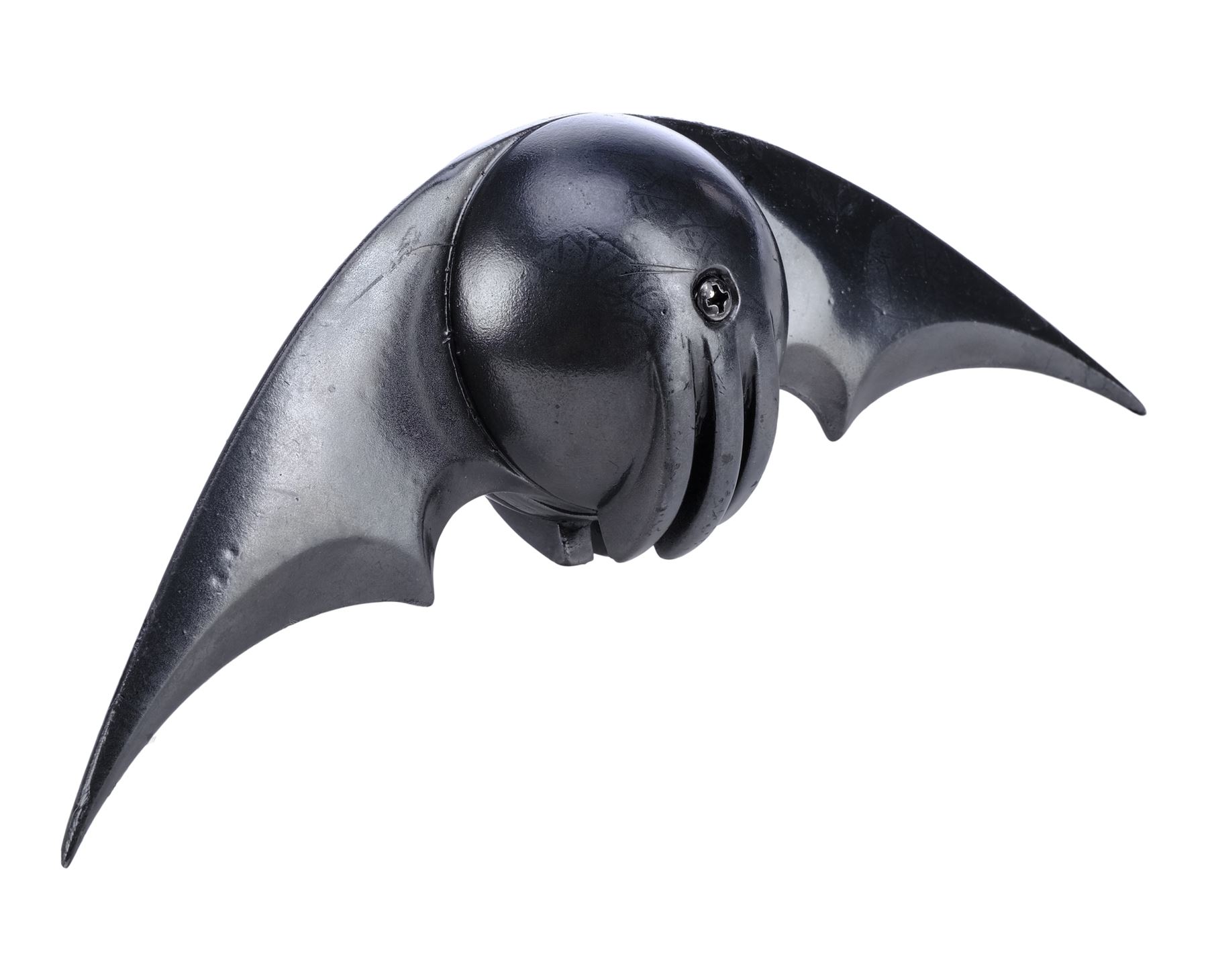 This foldable Bola features two resin halves, each with a batwing extending from a ridged half-sphere centre, screwed together and painted in Batman's signature gunmetal black. The resin exhibits scuffs and scratches to its painted finish from use, as well as some grime residue from storage. Dimensions: 23 cm x 6.5 cm x 6.5 cm (9" x 2.5" x 2.5")