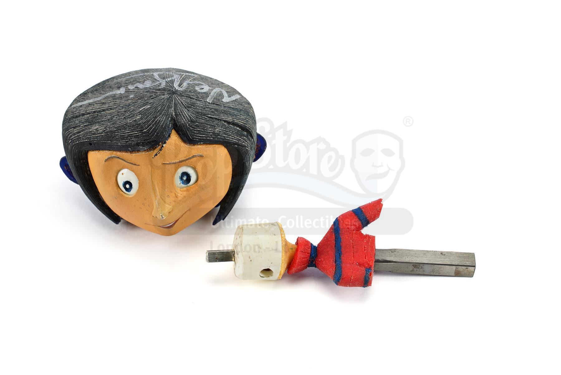 This lot will be auctioned on Tuesday, June 29th. The auction will begin at 9:00am PDT and lots are sold sequentially via live auctioneer; tune in to the live streaming broadcast on auction day to follow the pace. Note other lots in the auction may close on June 30th or July 1st. The first-ever prototype Coraline Jones (Dakota Fanning) puppet built for the production of Henry Selick's stop-motion animated dark fantasy film Coraline and signed by author Neil Gaiman. In this adaptation of Gaiman's novella, Jones discovered a mysterious door in her new home that led to a strange parallel world. This multi-piece puppet head and body was created by artist Martin Meunier circa January 2006 for one of the earliest "puppet summit" meetings held with director Henry Selick during preproduction on the film. Meunier worked from a character maquette sculped by Damon Bard to create the prototype that showed how replacement faces could be installed with magnets to facilitate replacement animation. The resin head features eyes installed on socket joints, magnets to attach the face, silicone hair and a silicone body. Director Selick approved the format of the puppets to be used based on this maquette, which was then the first three-dimensional puppet representation of the character used for discussions in meetings. The piece was signed by author Gaiman at the end of production, and inscribed with a "1" to signify the fact that it was the first puppet created and therefore a significant piece of Coraline history. Included with the lot is a letter of authenticity from Martin Meunier who was the film's Facial Animation Designer and built this piece. The bust is in good overall condition with some wear, including scuffing and paint chipping throughout. Dimensions (assembled): 4.5" x 3" x 2" (11.5 cm x 7.75 cm x 5.25 cm) Estimate: $10,000 - 15,000