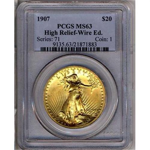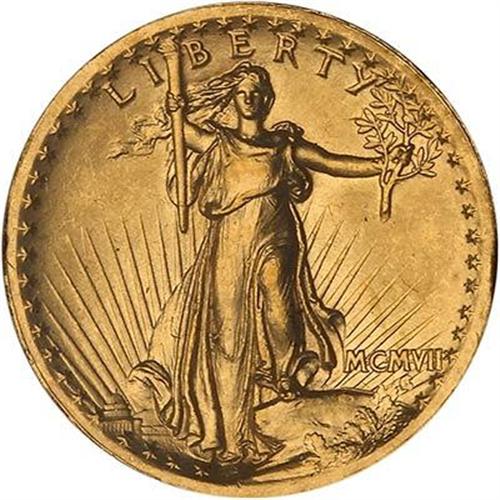 1907 $20 St. Gaudens. High relief, Roman numerals, wire rim. Another choice, satiny example of this majestic design. Giving his artistic expression full rein, the Augustus Saint-Gaudens expressed the date on this issue in Roman numerals, MCMVII -- a first for an American coin design -- and the designs themselves in sculpture-like high relief. The Mint's staff objected vehemently, as those in Philadelphia felt that coins were their franchise and it was unfair for President Roosevelt to procure the assistance of an outsider to create new models. Apart from this, the engraving department at the Mint made it known that Saint-Gaudens' idea of producing a circulating coinage in high relief was impractical, for such would require multiple blows on a special press and would not be suitable for high-speed production. It so happens, the Mint was correct. This marvelous design was used only for a short while in 1907 and then rejected as impractical. Were it only possible to roll back the clock and change the course of events! (#9135)