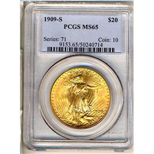 1909-S $20 St. Gaudens. Attractive yellow-gold patina; with only a few bagmarks but plenty of colorful eye-appeal, this Gem easily outranks others in its nominal grade. Scarce above MS64 condition. (#9153)