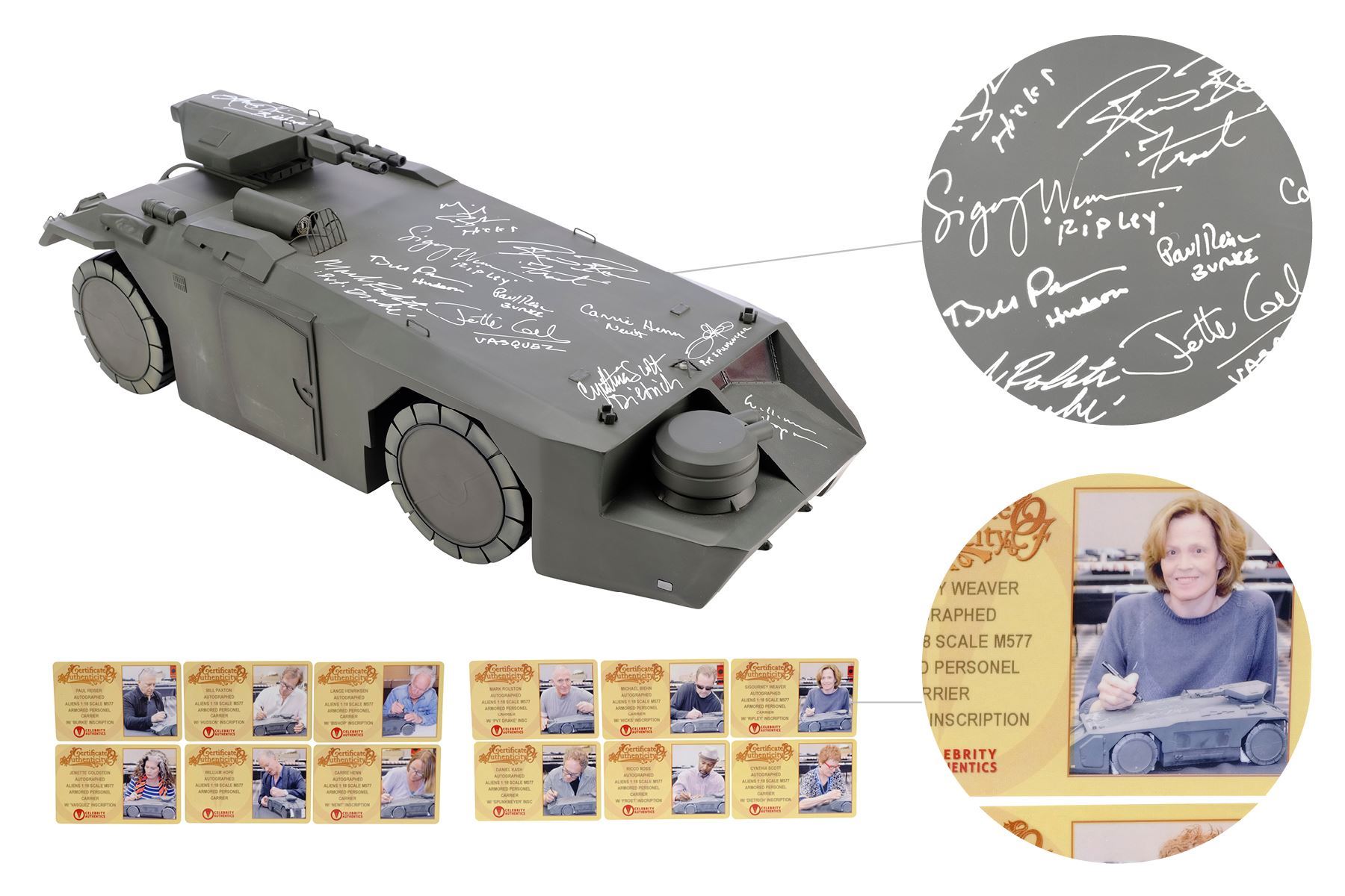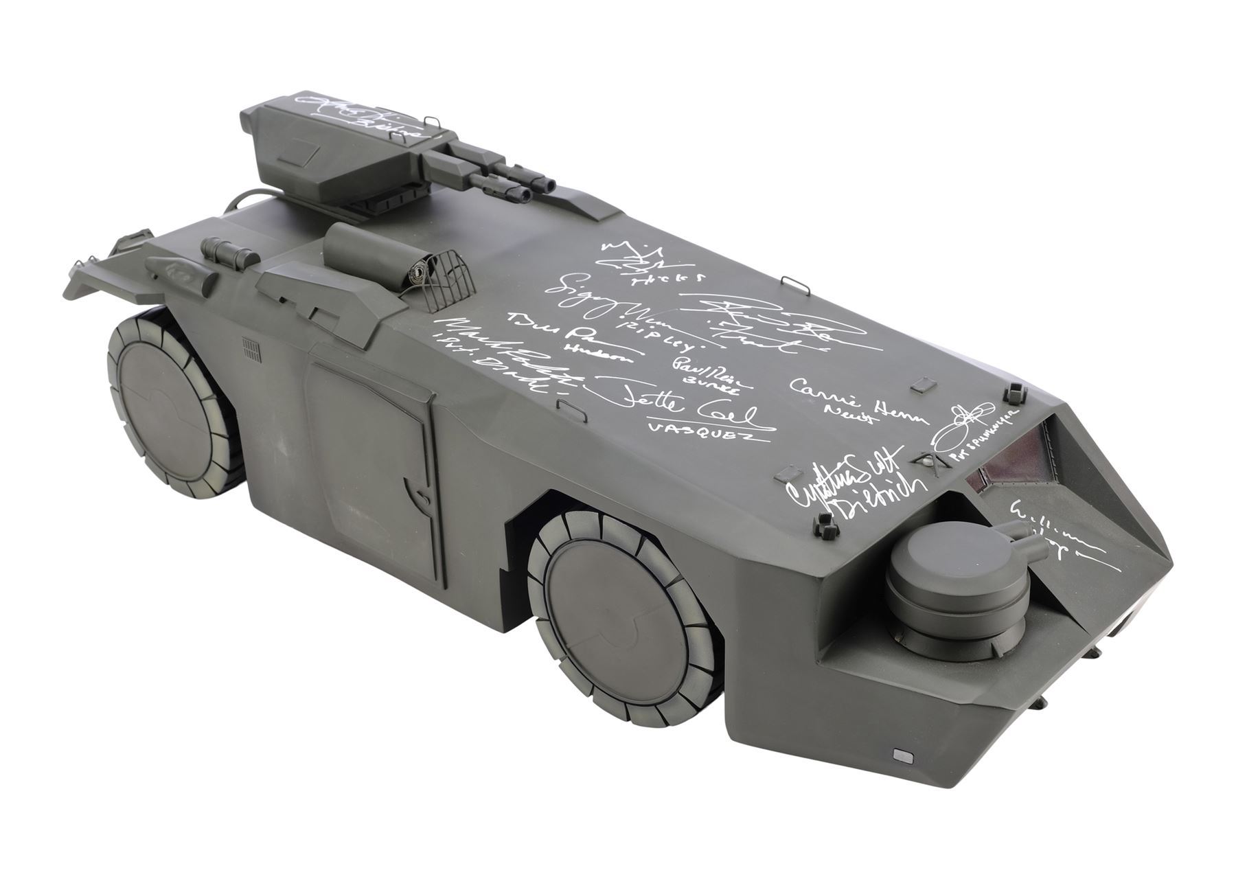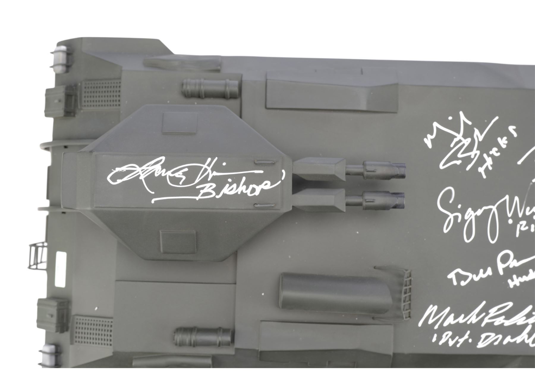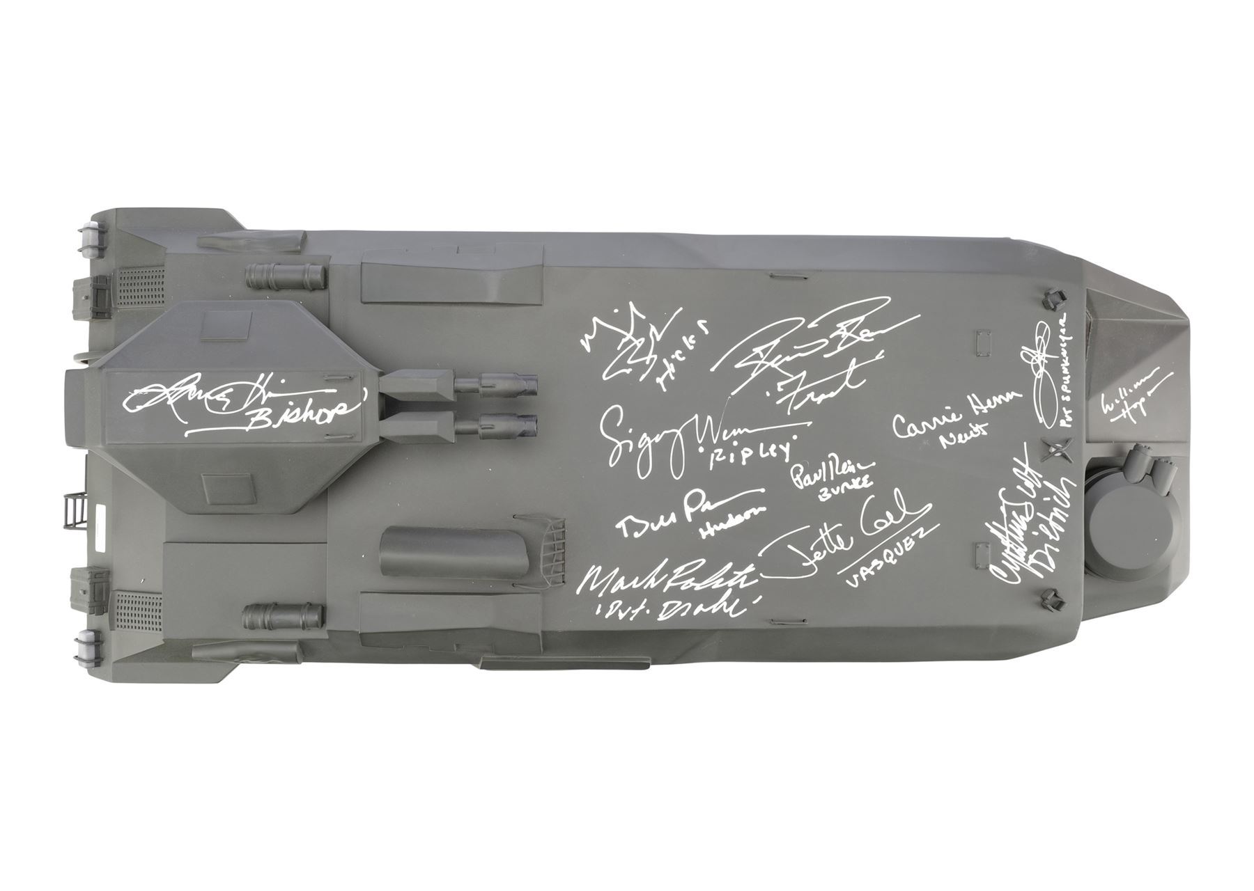 ALIENS (1986) - Cast-Autographed Replica M577 APC Tank Model-Miniature Display - A cast-autographed replica M577 APC tank model-miniature display from James Cameron's sci-fi horror film sequel Aliens. Ripley (Sigourney Weaver), Hicks (Michael Biehn), and the other Marines arrived at terraforming colony Hadley's Hope in two Armored Personnel Carriers (APCs).