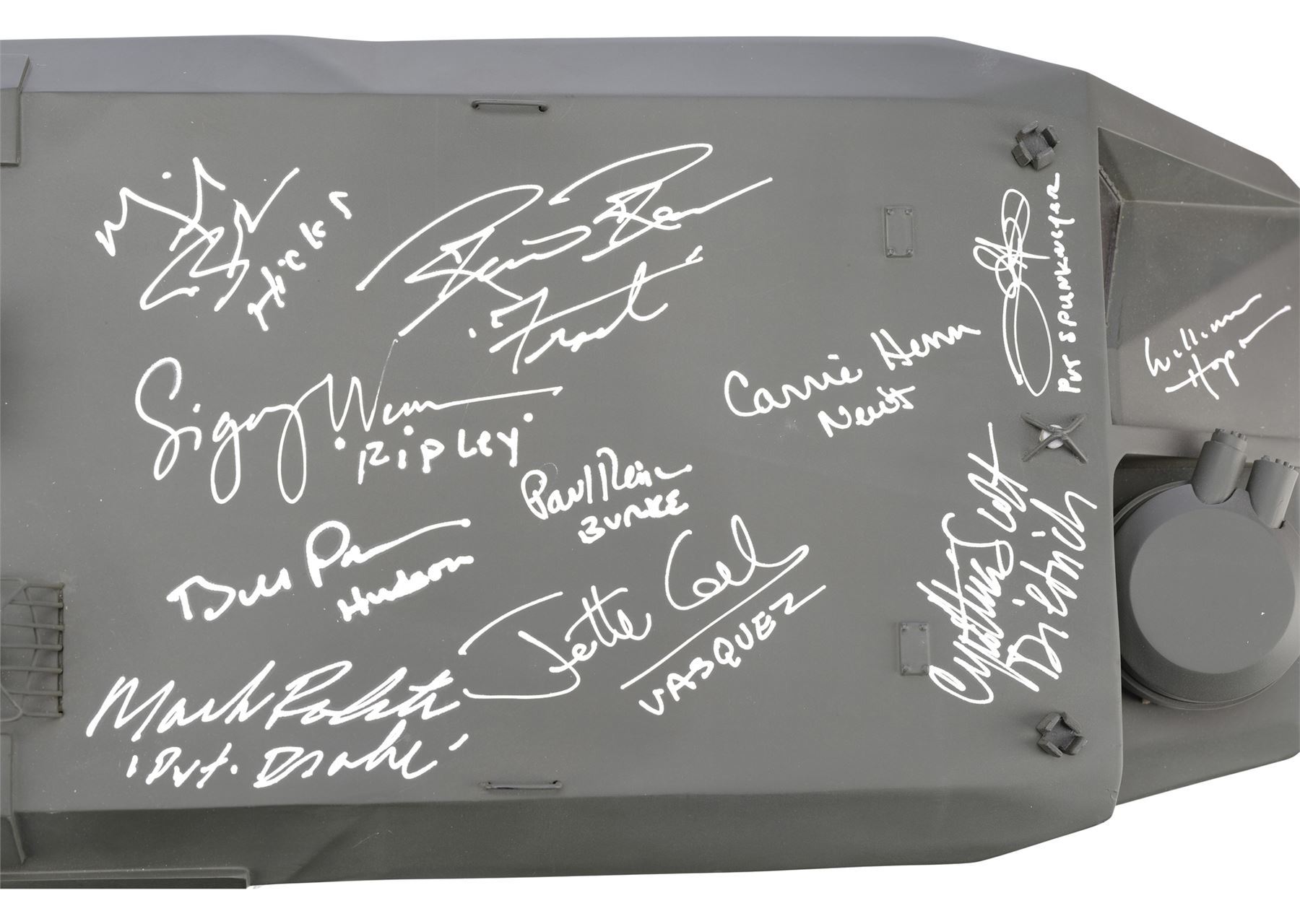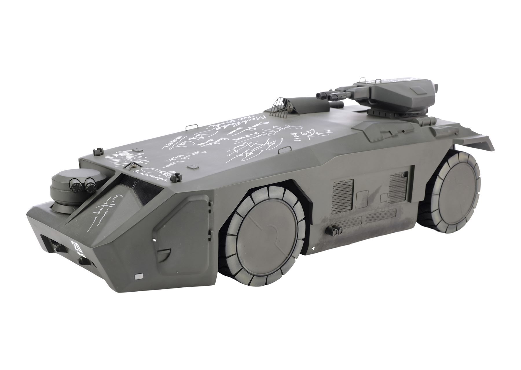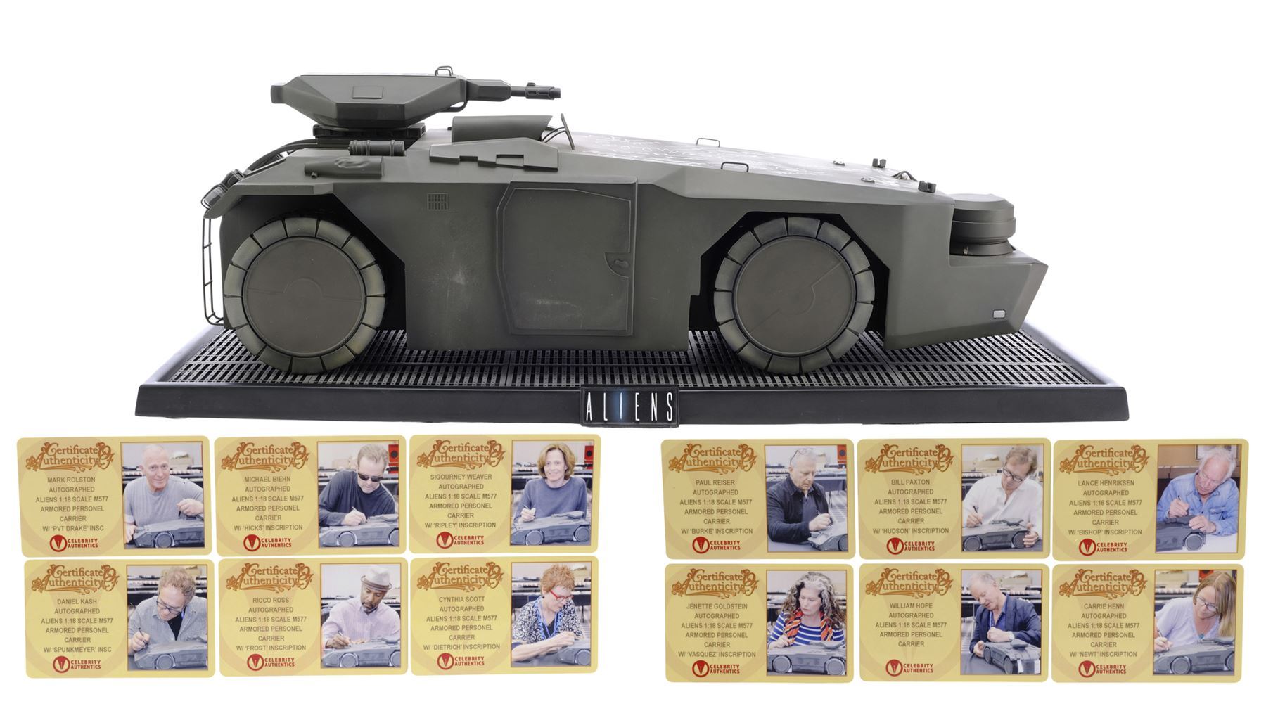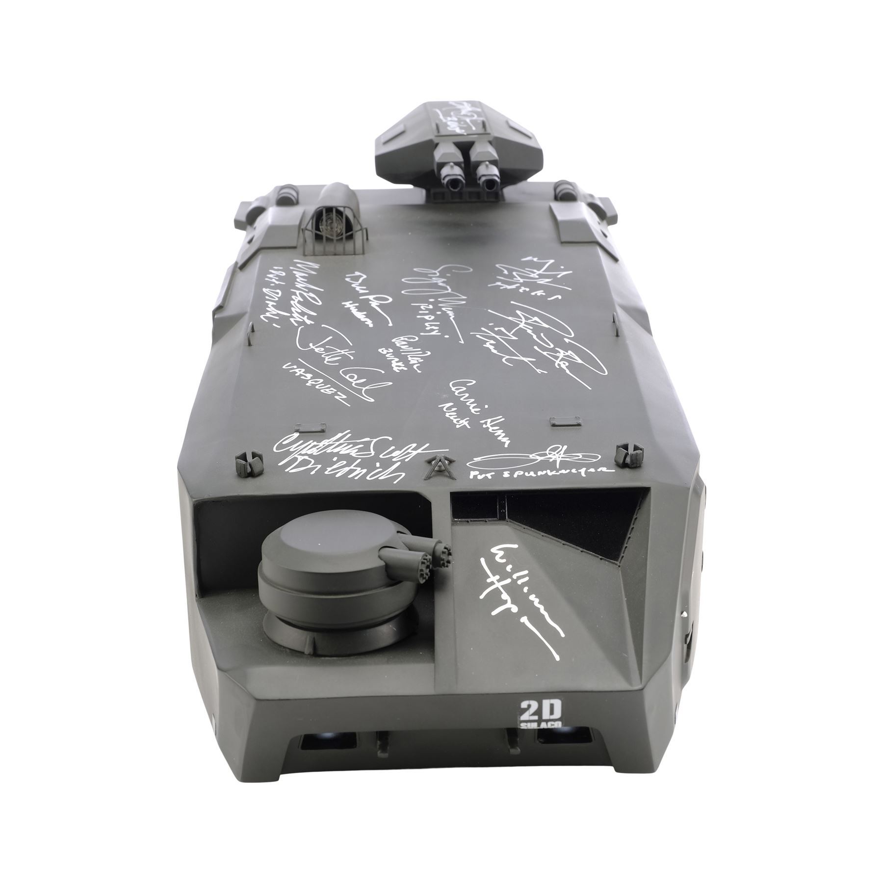 ALIENS (1986) - Cast-Autographed Replica M577 APC Tank Model-Miniature Display - A cast-autographed replica M577 APC tank model-miniature display from James Cameron's sci-fi horror film sequel Aliens. Ripley (Sigourney Weaver), Hicks (Michael Biehn), and the other Marines arrived at terraforming colony Hadley's Hope in two Armored Personnel Carriers (APCs).