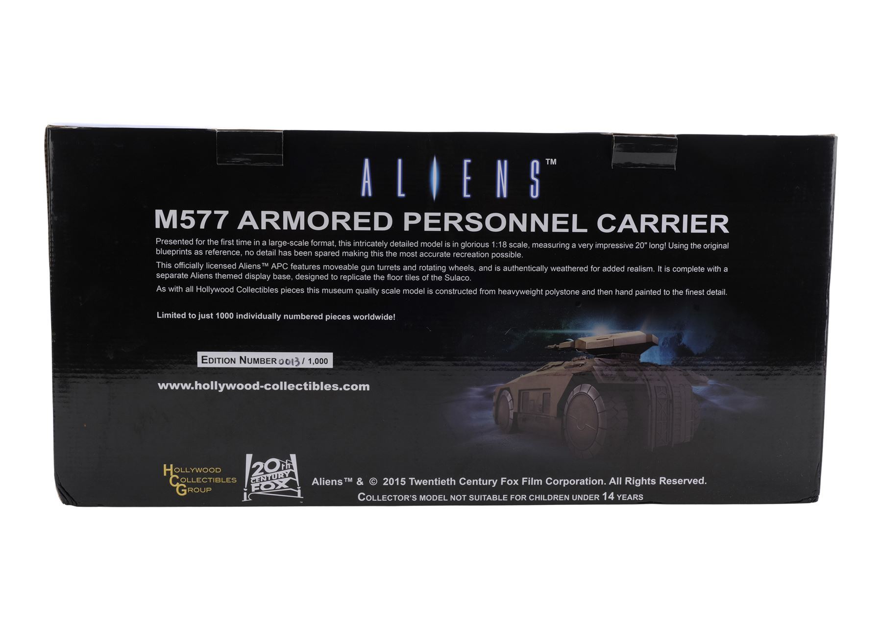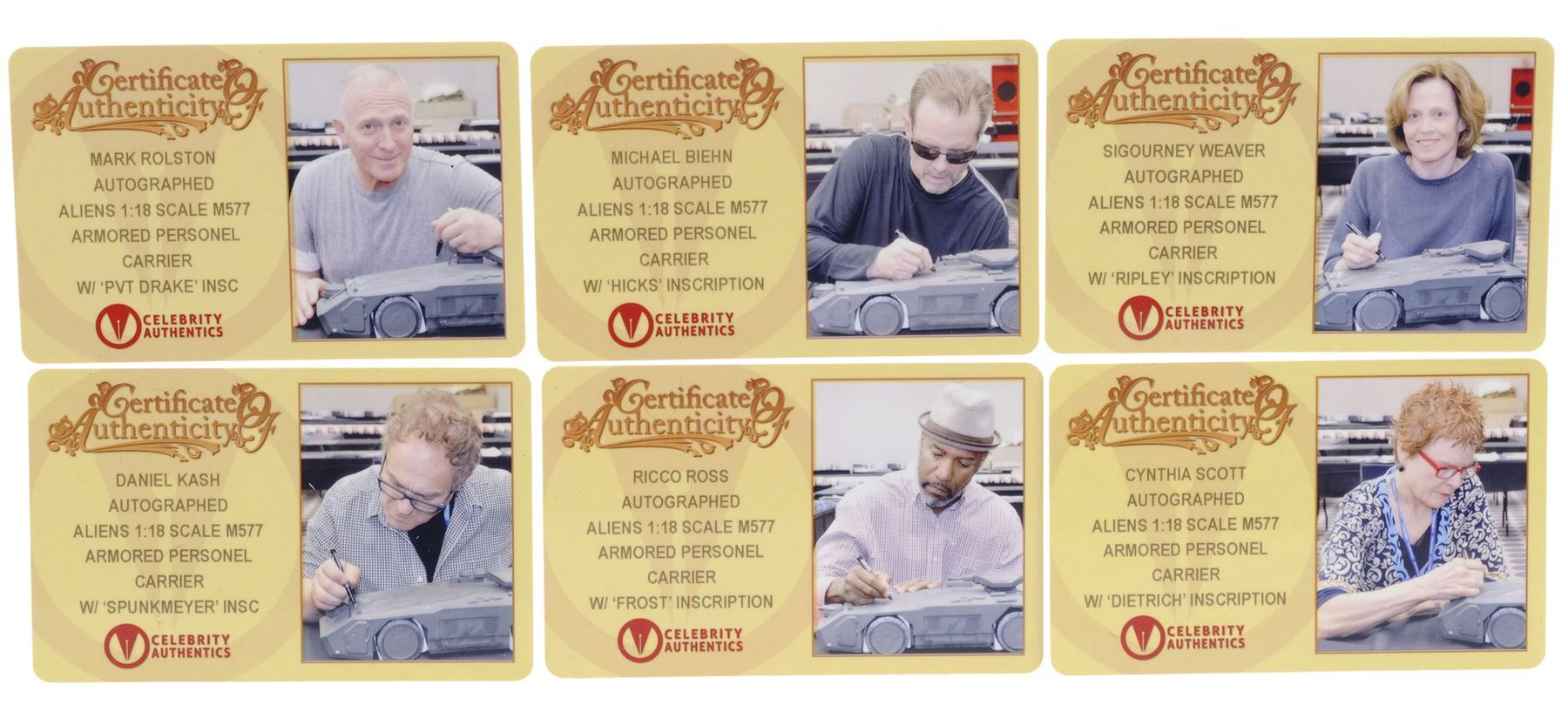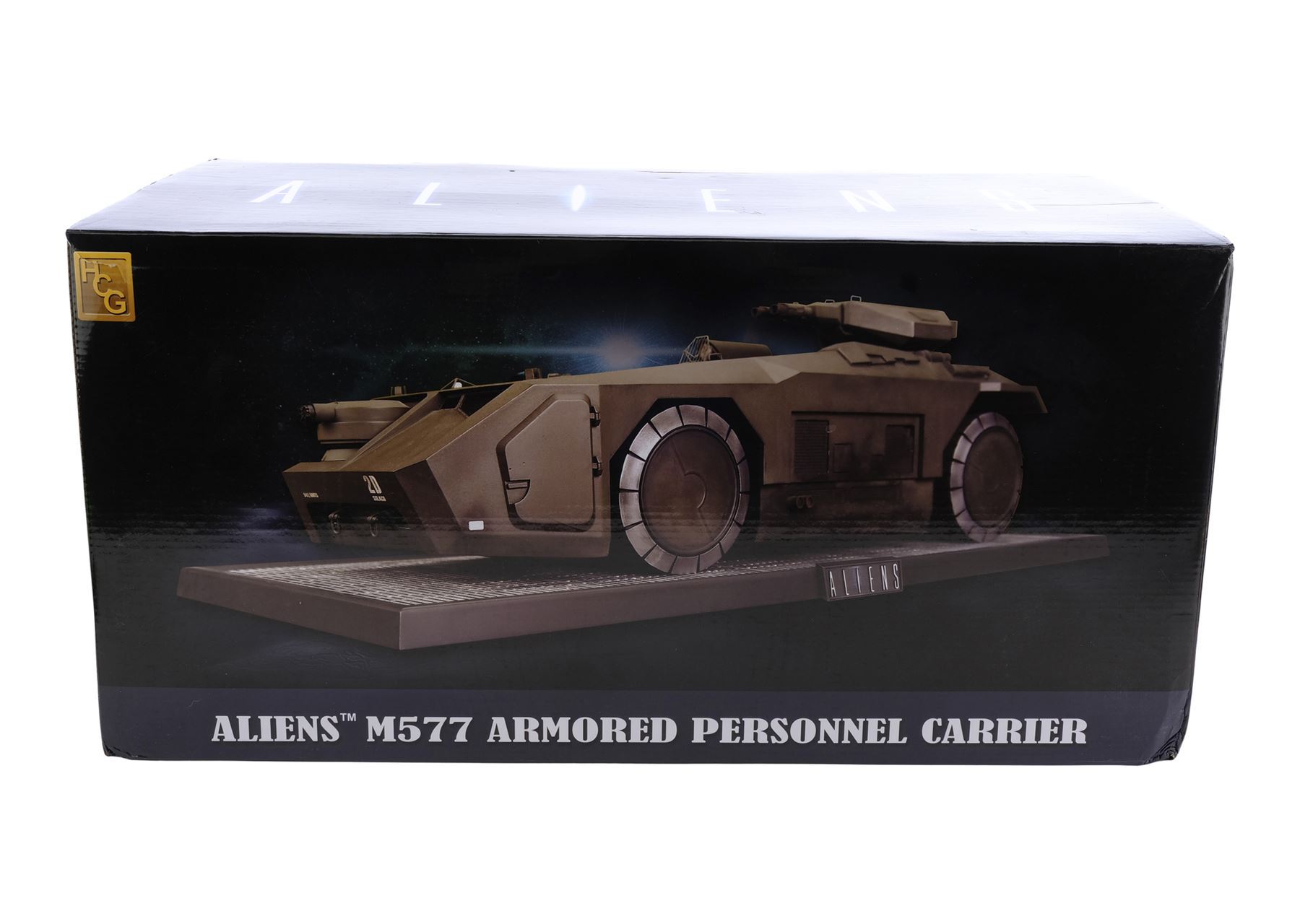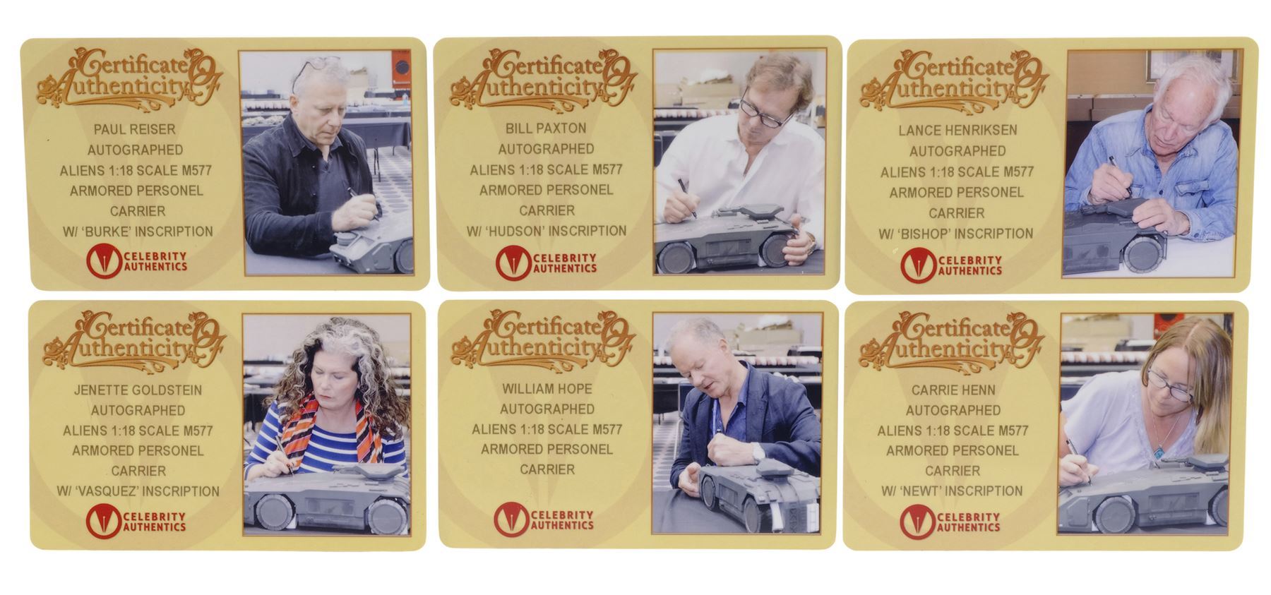 ALIENS (1986) - Cast-Autographed Replica M577 APC Tank Model-Miniature Display - A cast-autographed replica M577 APC tank model-miniature display from James Cameron's sci-fi horror film sequel Aliens. Ripley (Sigourney Weaver), Hicks (Michael Biehn), and the other Marines arrived at terraforming colony Hadley's Hope in two Armored Personnel Carriers (APCs).