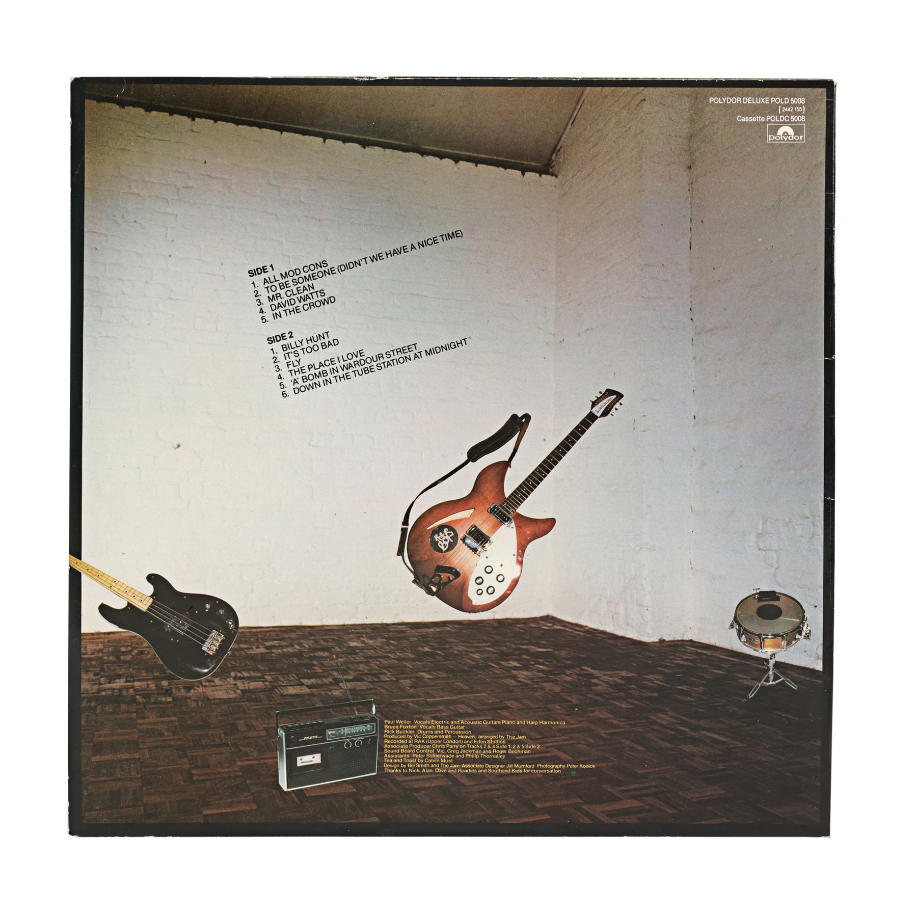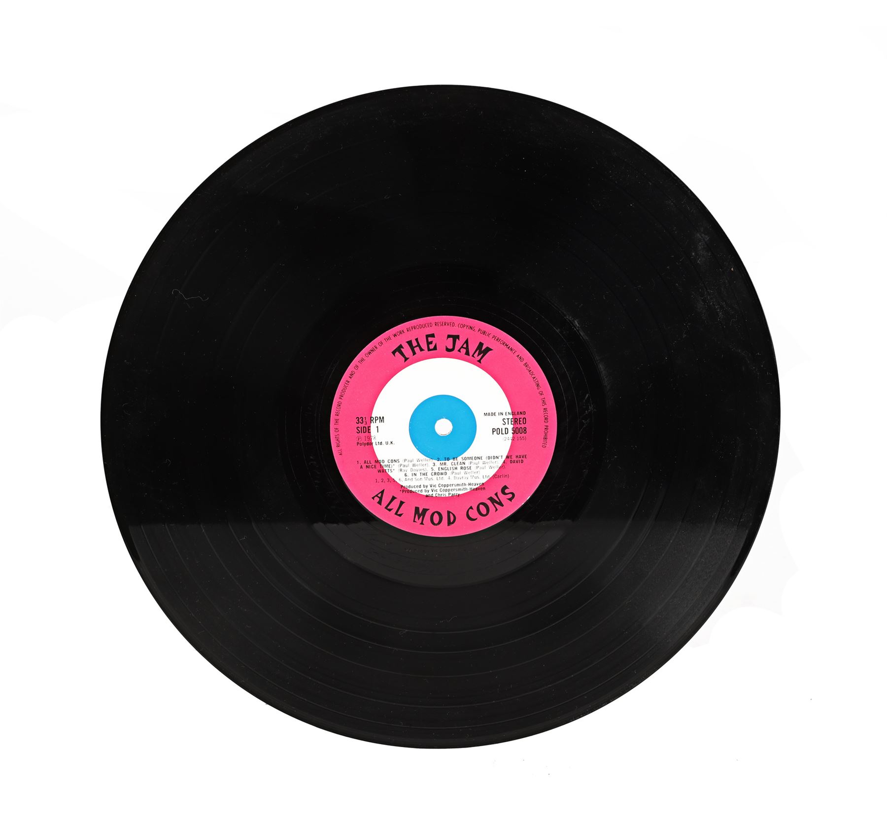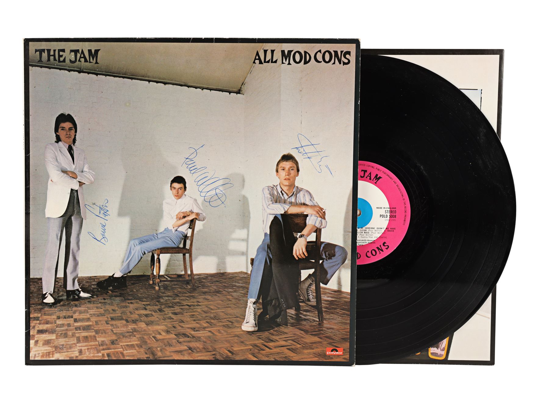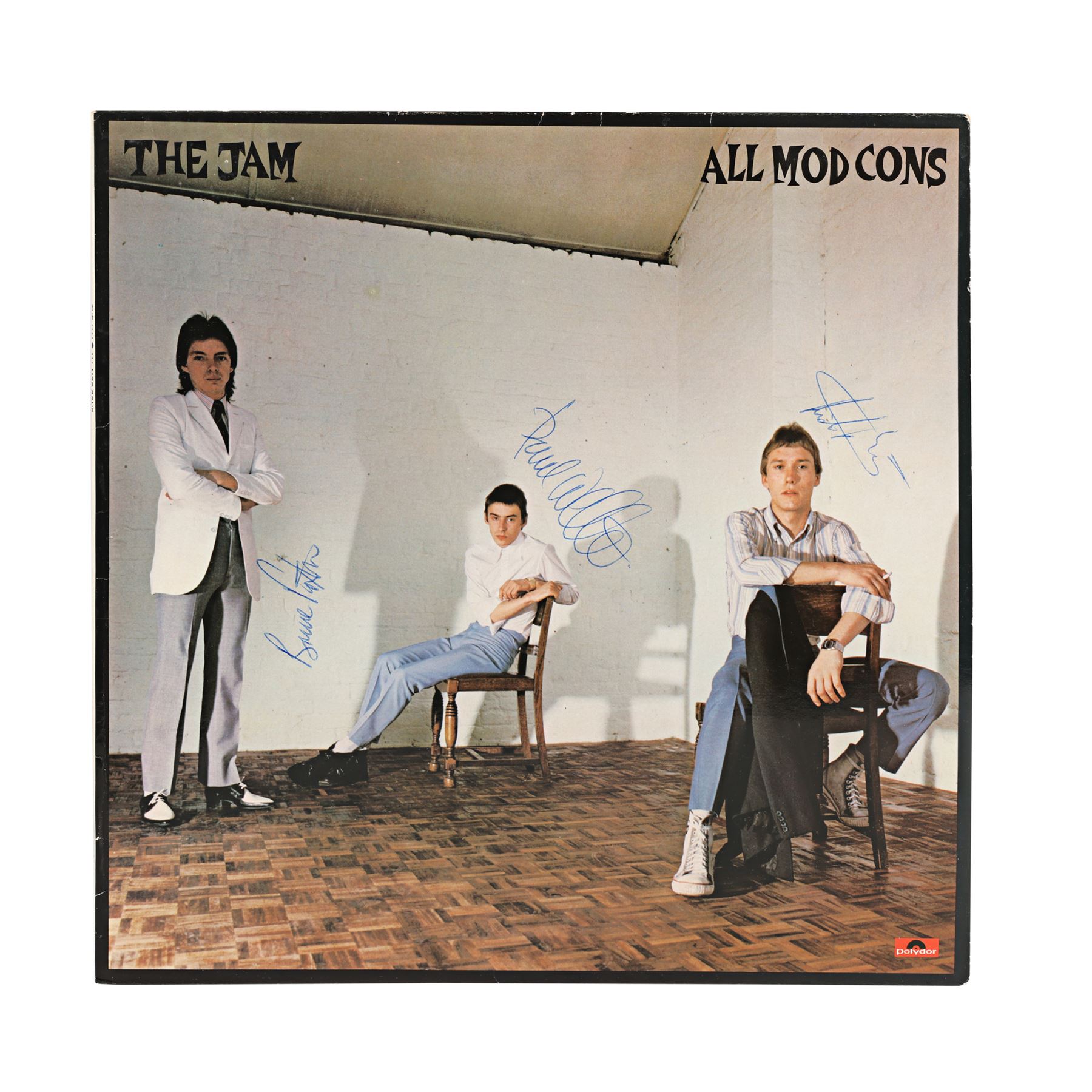 An original UK pressing of The Jam's album All Mod Cons, autographed by all three band members. All Mod Cons was the band's third studio album, released in 1978 by Polydor Records. This sleeve was one of five signed by the band backstage at Preston Guildhall on 5 July 1981, one of the dates on their Bucket and Spade tour. The original owner of this lot attended the concert and managed to sneak backstage and obtain the autographs.