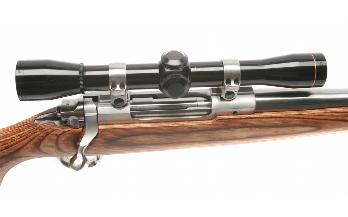Excellent condition - 24" barrel - 98% remaining stainless steel finish with few/minor scratches to barrel/mag floor plate - laminated hardwood stock in excellent condition with rubber Ruger recoil pad - no sights - crisp markings on barrel & receiver - bolt action in excellent condition - fitted with Leupold M8-4X scope with clear optics on stainless rings - yr. mfg: 1999 - SN 787-05443 - est. 400 - 600 - FFL - 20kJBWSC001