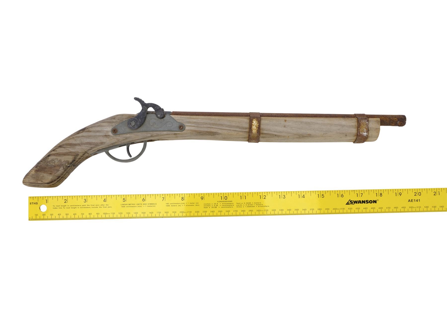 This lot consists of a pistol; a brass hilt knife with a wooden handle; a leather knife sheath; a brass telescope; a metal chain segment; and an iron stake. The lot exhibits rust, scuffing, scratches, cracking, paint wear, and paint chipping. Dimensions: (gun) 20" x 4" x 2" (50.75 cm x 10.25 cm x 5.25 cm); (stake): 8" x 1" x 1" (20.25 cm x 2.5 cm x 2.5 cm)