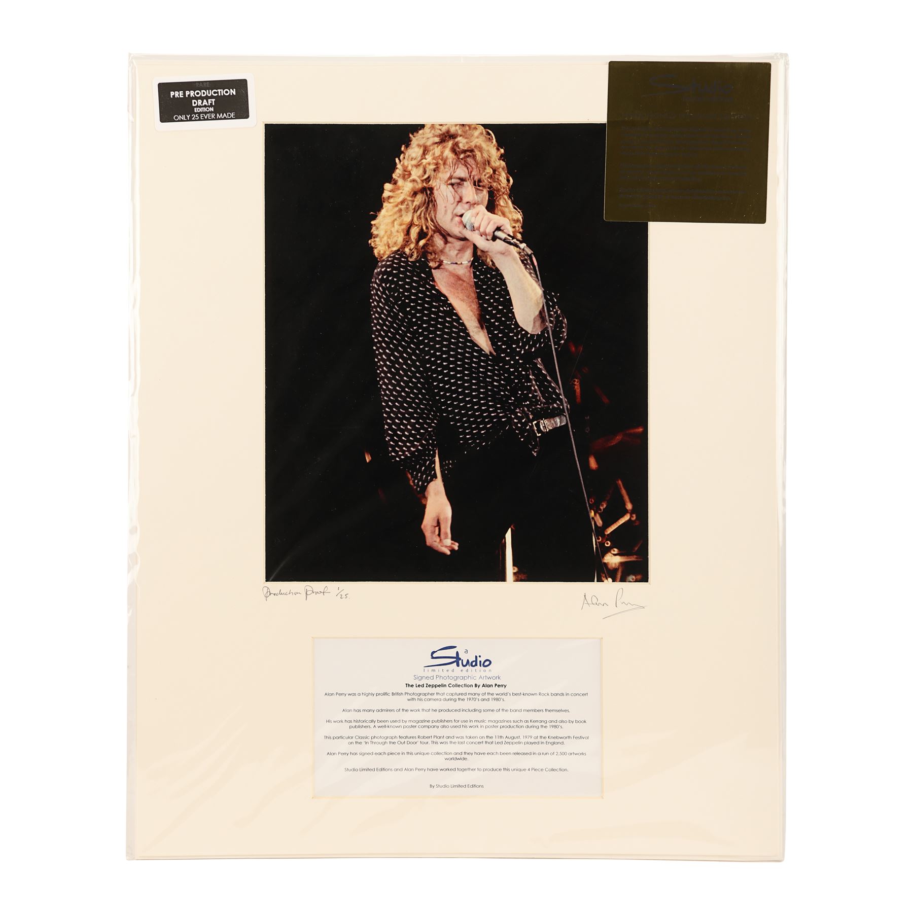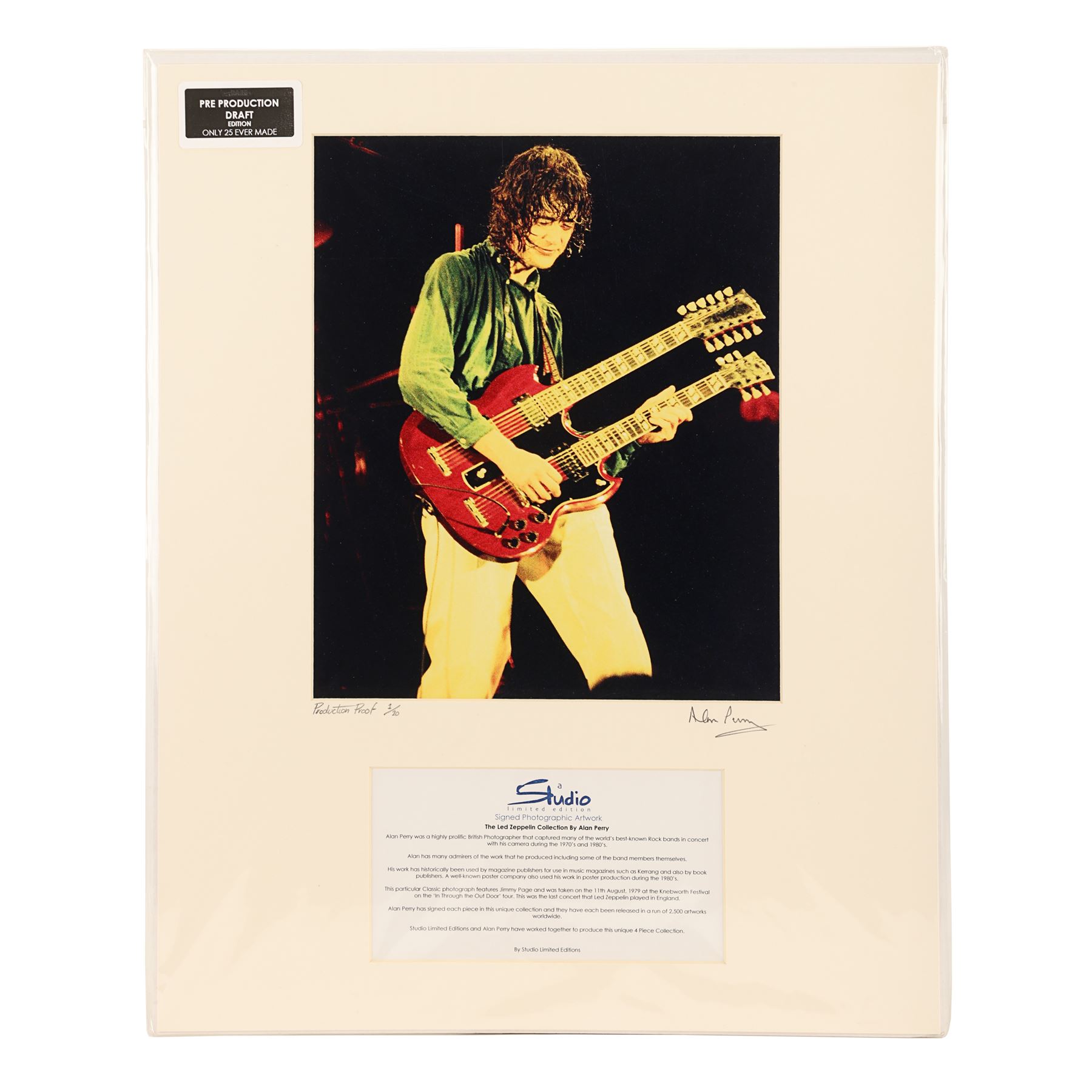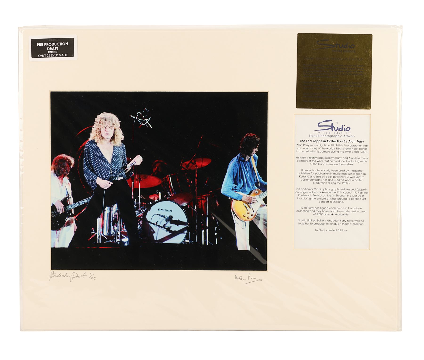 A set of four limited edition photographs showing Led Zeppelin playing at Knebworth Festival on the 11th August 1979, their last ever concert in the UK. These full-colour images were taken by British music photographer Alan Perry. One photo features the whole band on stage, one shows singer Robert Plant, one shows lead guitarist Jimmy Page, and the final photograph shows drummer John Bonham. All four are hand signed in pencil by Perry and labelled "Production Proof, 1/25". Each print is presented in a cardboard frame with a Studio Limited Editions certificate of authenticity on the back and comes in sealed packaging. Dimensions (each print displayed): 50 cm x 40 cm (19 3/4" x 15 3/4")