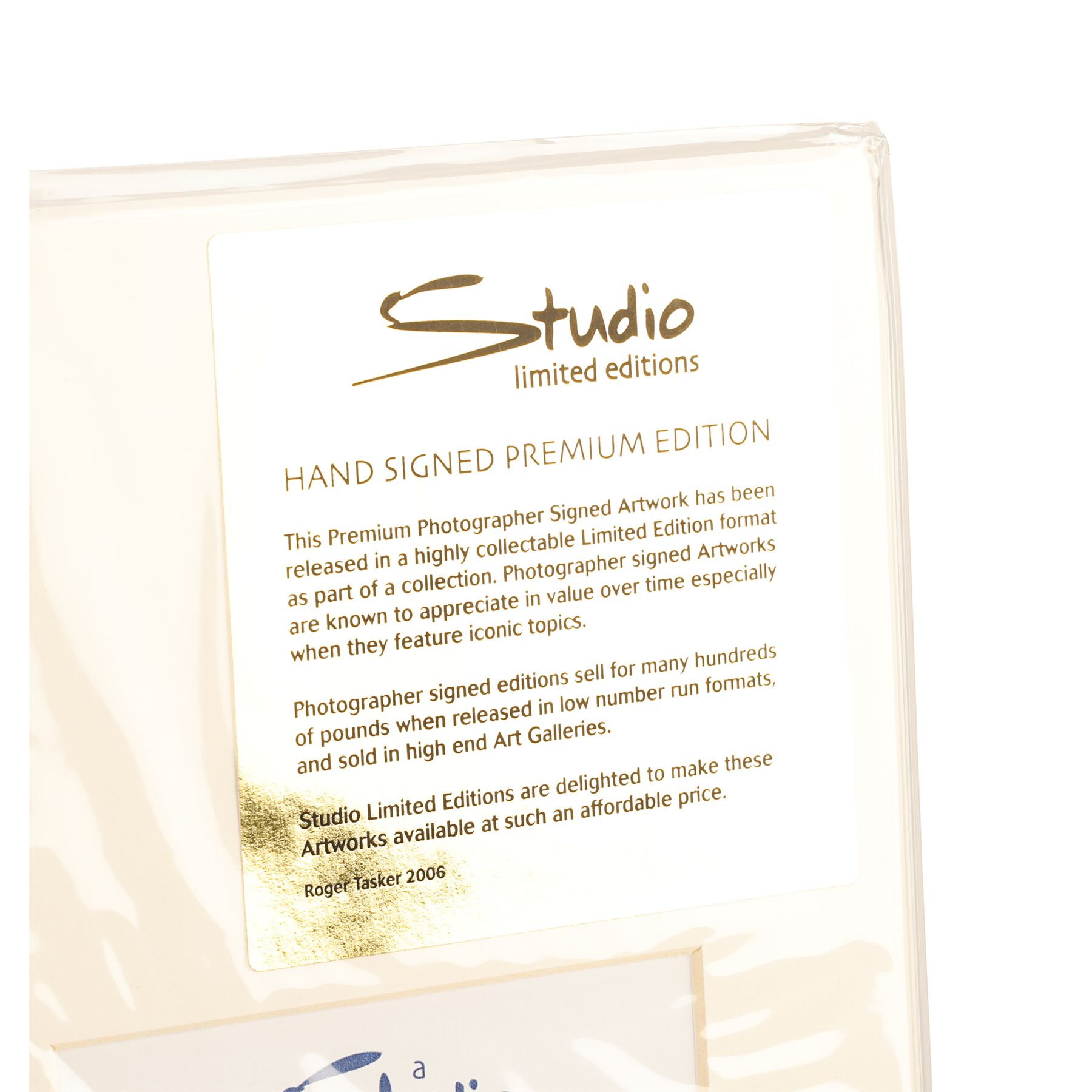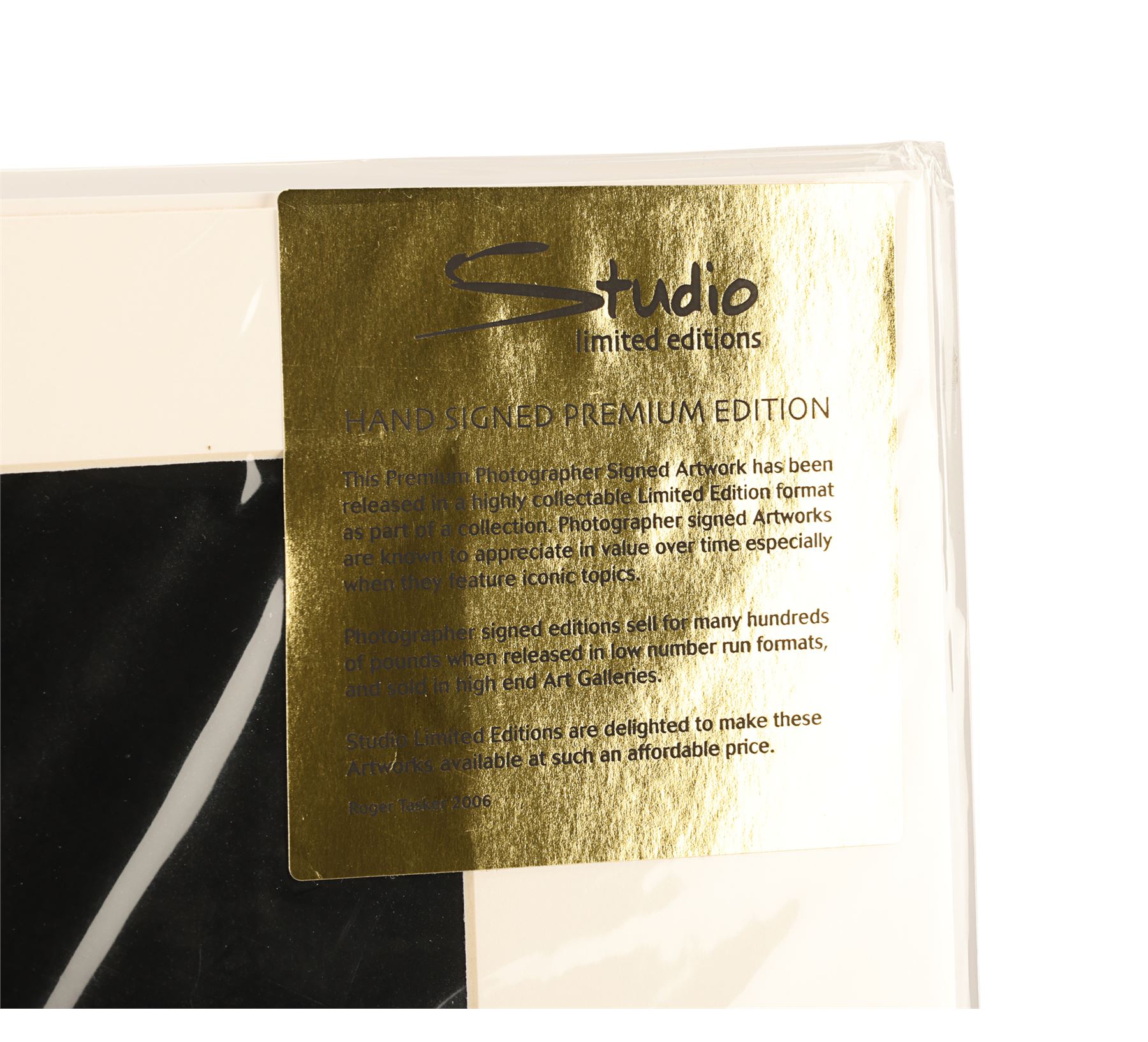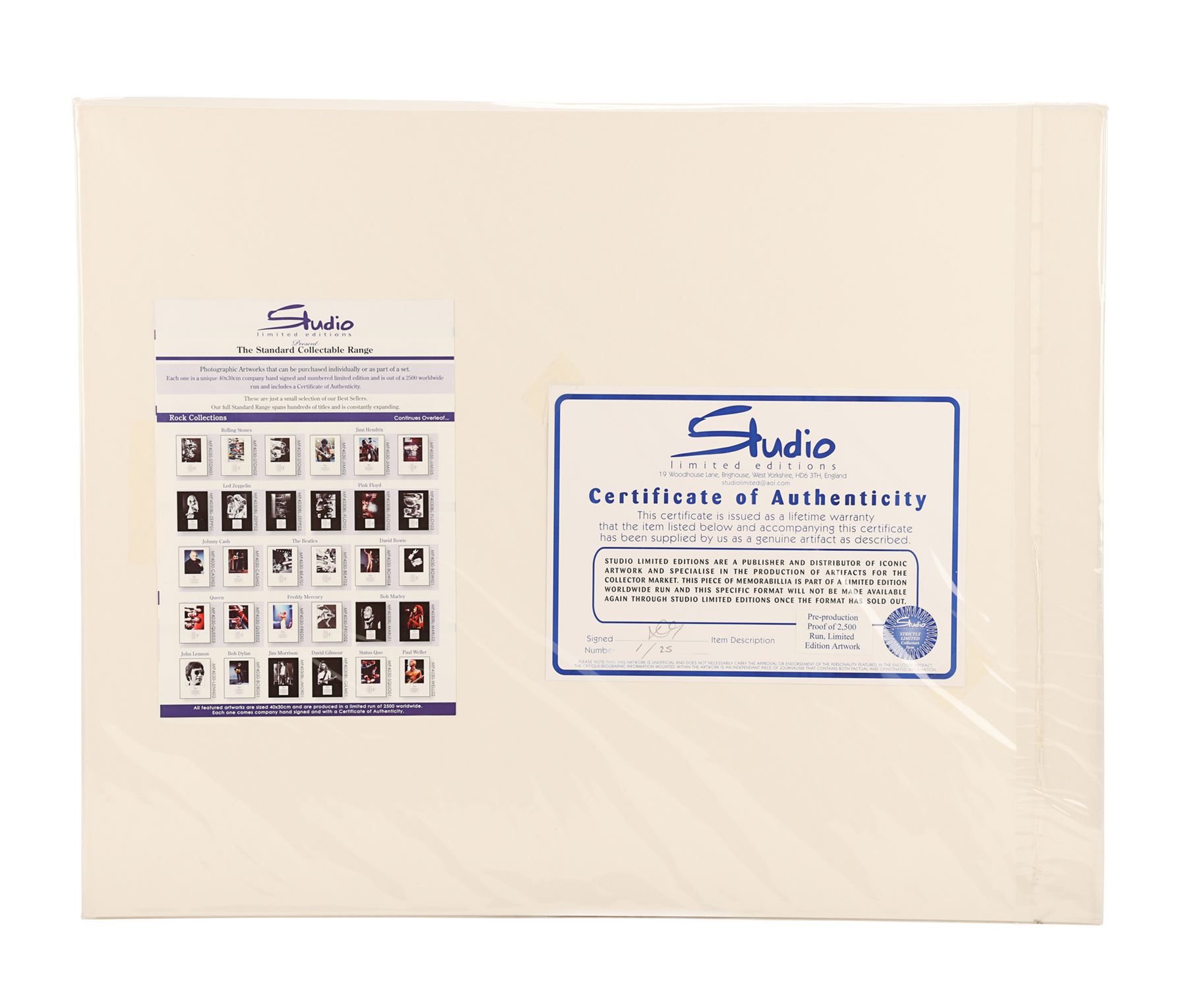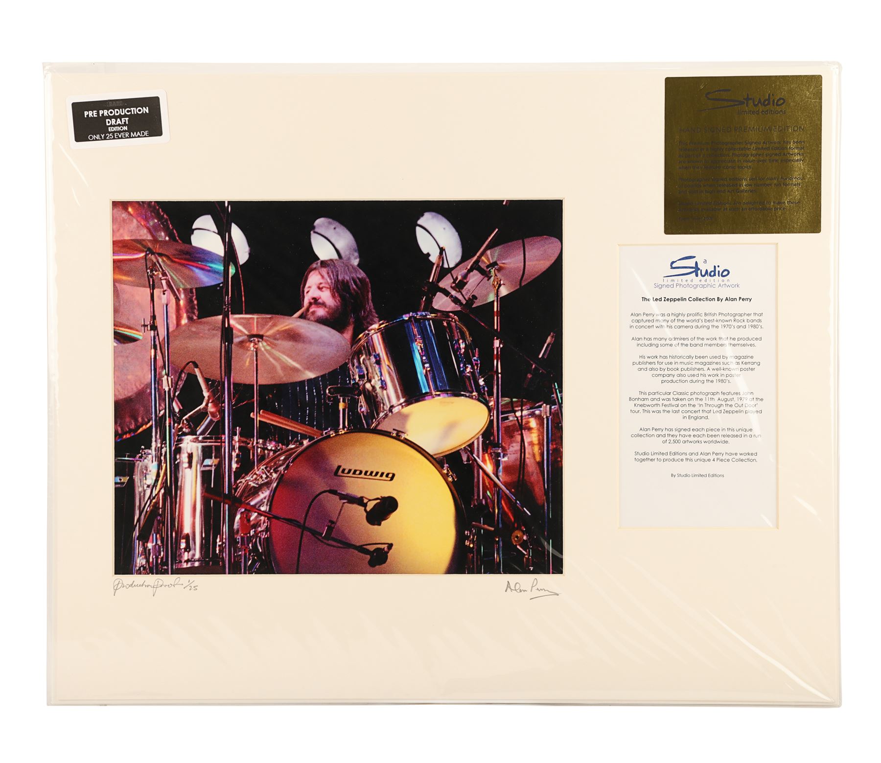 A set of four limited edition photographs showing Led Zeppelin playing at Knebworth Festival on the 11th August 1979, their last ever concert in the UK. These full-colour images were taken by British music photographer Alan Perry. One photo features the whole band on stage, one shows singer Robert Plant, one shows lead guitarist Jimmy Page, and the final photograph shows drummer John Bonham. All four are hand signed in pencil by Perry and labelled "Production Proof, 1/25". Each print is presented in a cardboard frame with a Studio Limited Editions certificate of authenticity on the back and comes in sealed packaging. Dimensions (each print displayed): 50 cm x 40 cm (19 3/4" x 15 3/4")