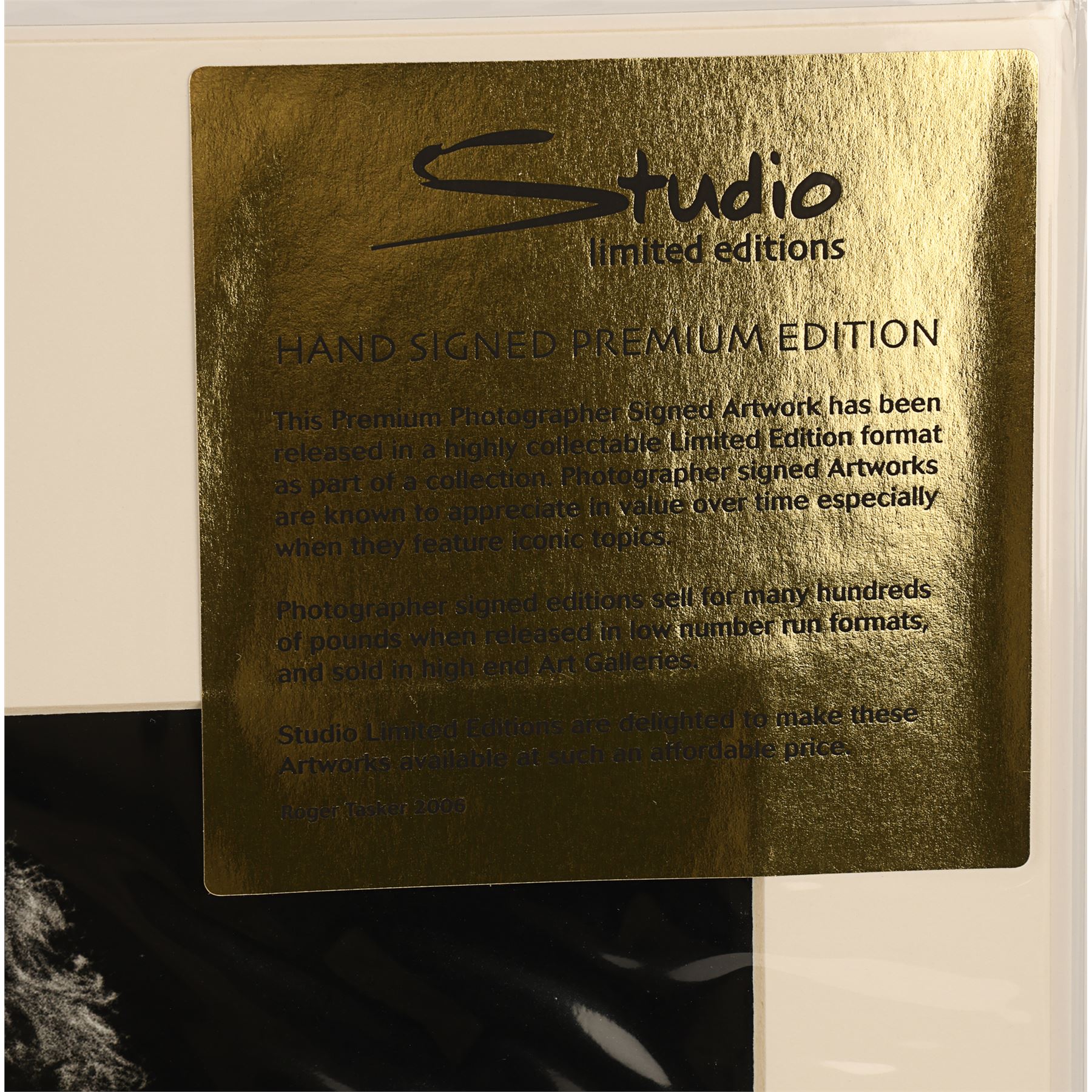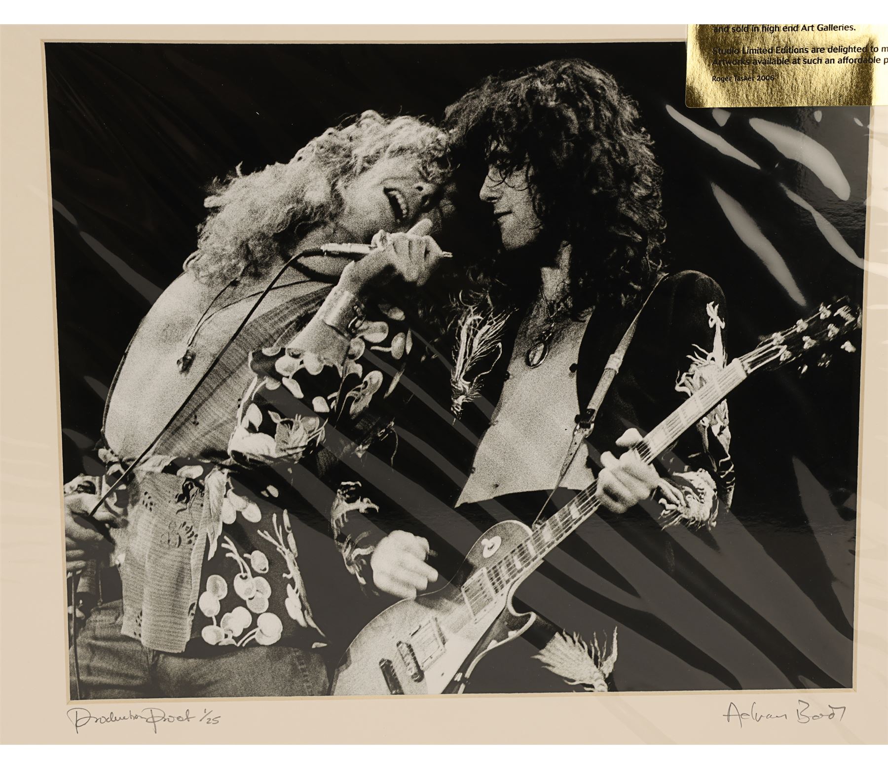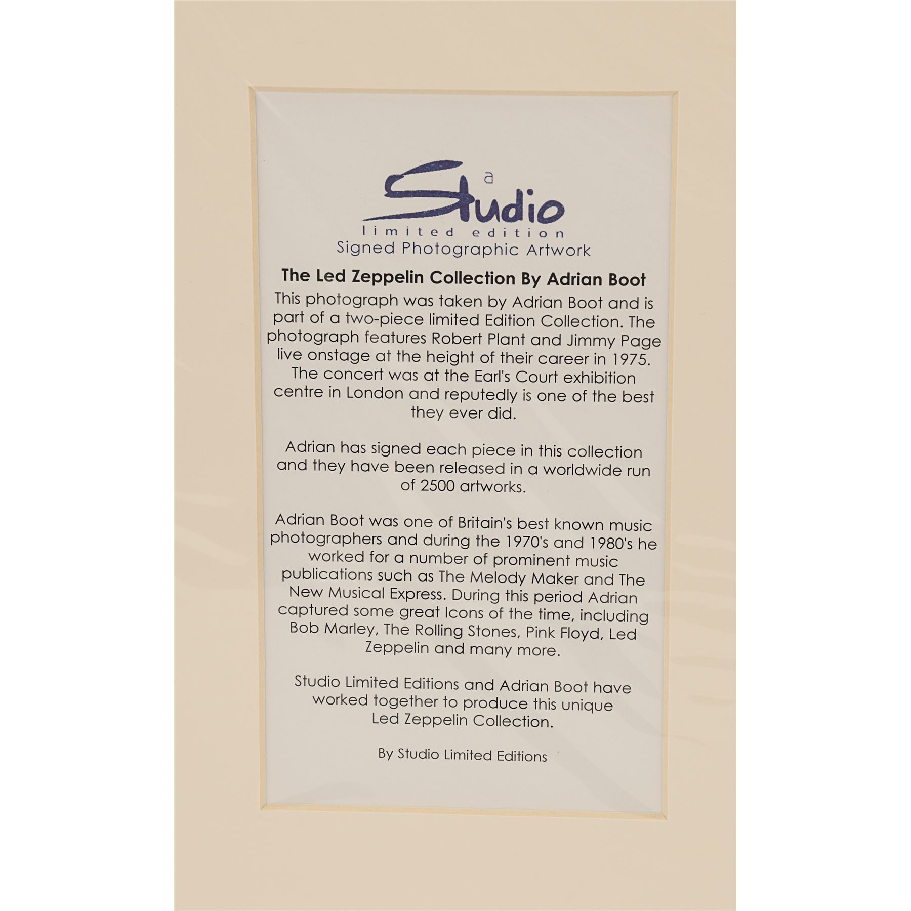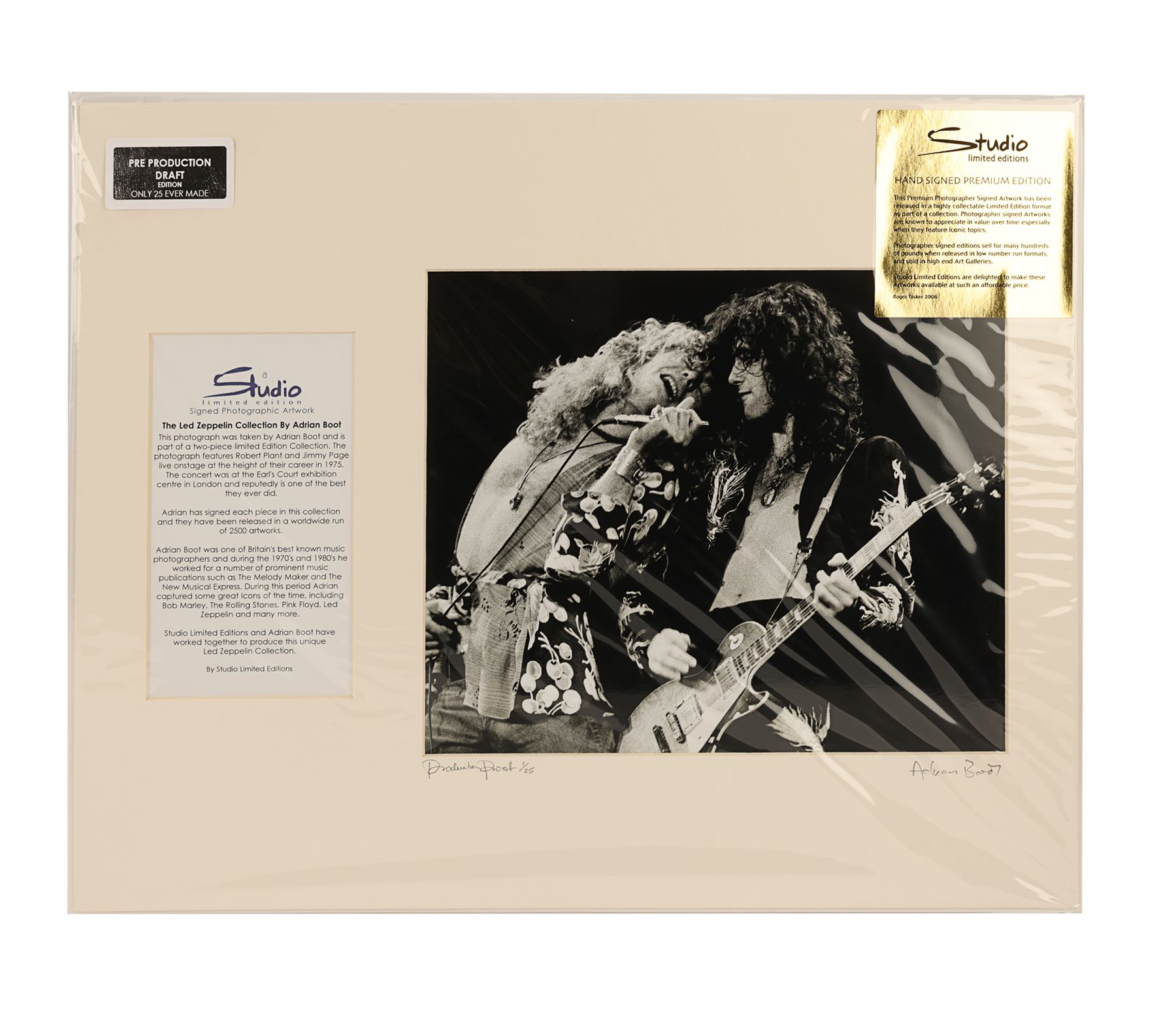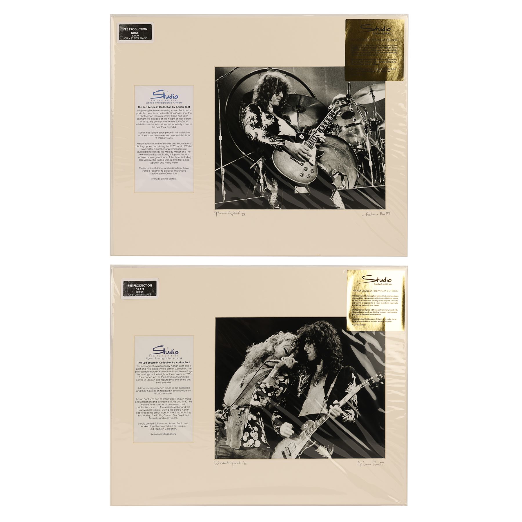 A set of two limited edition photographs showing Led Zeppelin playing on stage in 1975 at the Earl's Court Exhibition in London. These black-and-white images were taken by British music photographer Adrian Boot. One photo features singer Robert Plant and lead guitarist Jimmy Page, and the second image again shows Page and drummer John Bonham. Both are hand signed in pencil by Boot and labelled "Production Proof, 1/25". Each print is presented in a cardboard frame with a Studio Limited Editions certificate of authenticity on the back and comes in sealed packaging. Dimensions (each print displayed): 50 cm x 40 cm (19 3/4" x 15 3/4")