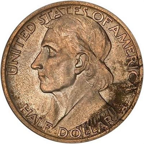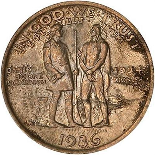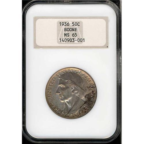 1936 Boone Half Dollar. Elusive and quite costly as a Gem 68, this much more affordable (and still gem) 65 example is free of noticeable abrasions. The strike, while just as complete as on any other, is well above par for the detail seen under magnification on both sides.