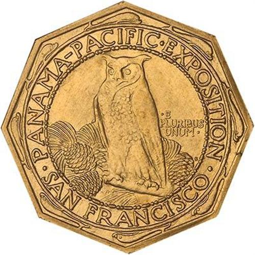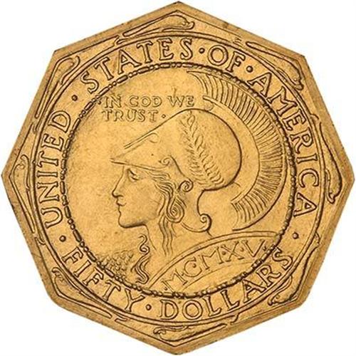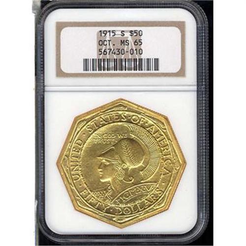1915-S Panama-Pacific Gold $50 Octagonal. Satiny and lustrous orange-gold with pale rose and lovely iridescent gold toning highlights, a spectacular Gem of this important rarity. Almost identical in design to that on the round-format $50 coins, although somewhat reduced in size to properly fit the coin's octagonal shape: Eight tiny dolphins have been added to the border design on each side, outside the circle surrounding the legends, one dolphin at each angle. On the obverse is a head of Minerva wearing a stylized Greek helmet of the Corinthian style; on the reverse, an owl and pine branch with pinecones. This version, made to the extent of 1,500 pieces, was slightly more popular with the public, due to the distinctive octagonal shape which reflected the historic $50 slugs of 1851-1852. When final accounts were tallied, it was learned that only 645 pieces of the original 1,500 had been distributed. However, in those days, collectors (and non-collectors) had poorer means for storing their coins; many of the pieces were actually mishandled or carried as pocket pieces, accounting for the actual worn specimens as well as those which got knocked about. This is one of the very select Gem MS65 survivors from the low mintage, and a marvelous, indeed, an impressive specimen! (NGC serial #567430-010) (#7452)