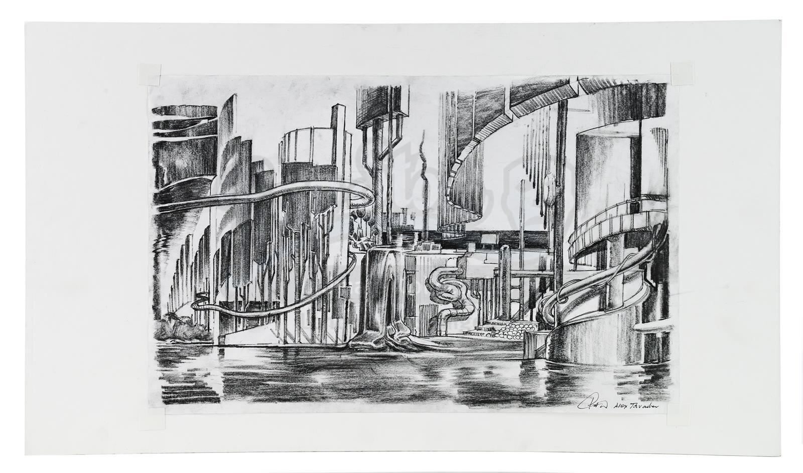 This lot will be auctioned on Wednesday, June 30th. The auction will begin at 9:00am PDT and lots are sold sequentially via live auctioneer; tune in to the live streaming broadcast on auction day to follow the pace. Note other lots in the auction may close on June 29th or July 1st. Alex Tavoularis-signed artwork from the production of Tim Burton's film adaptation of Roald Dahl's Charlie and the Chocolate Factory. Tavoularis created concept artwork for many of the locations featured in the film, including the whimsical interior of the chocolate factory. This drawing of a room full of fantastical factory machinery is rendered in graphite on paper taped to a white backing board. It is signed by the artist in the lower right corner. It is in good overall condition with minimal wear, including some charcoal smudging. Dimensions: 24" x 14" (61 cm x 35.75 cm) Sold without copyright; see notice in the Buyer's Guide. Estimate: $400 - 600