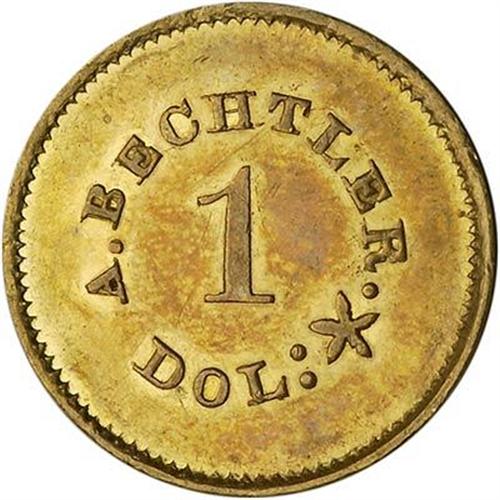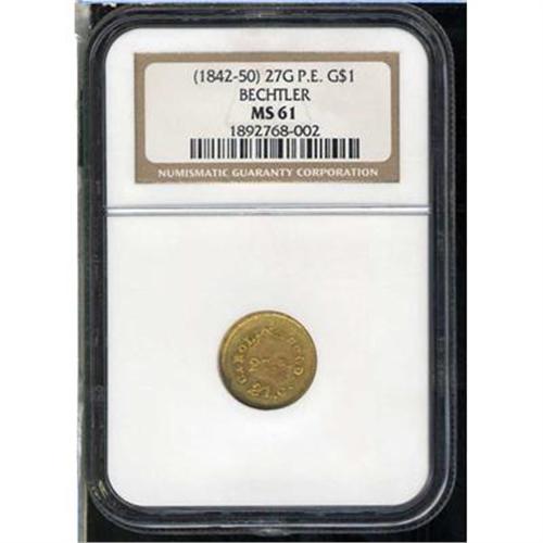 (1842-50) 27G P.E. G$1 BECHTLER. The Bechtler mint was a private venture conducted at the abode of Christopher Bechtler, and operated by himself and the Bechtler family. The activity was highly esteemed in its time, well covered in press and financial papers, and served its purpose in providing circulating coins in that part of the South. There were no mints in North Carolina or Georgia until 1838, therefore the Bechtler enterprise, which began in 1830, filled an important function. Washington, D.C. did not object to the Bechtlers, but allowed the private mint to continue in full operation, although now and again mention of it was made in the Annual Report of the Director of the Mint. This is one of the standard issue Dollars struck in greenish yellow gold with slightly rippled effect from the dies but sharp lettering on the avowedly simple obverse & reverse design. (#10040)