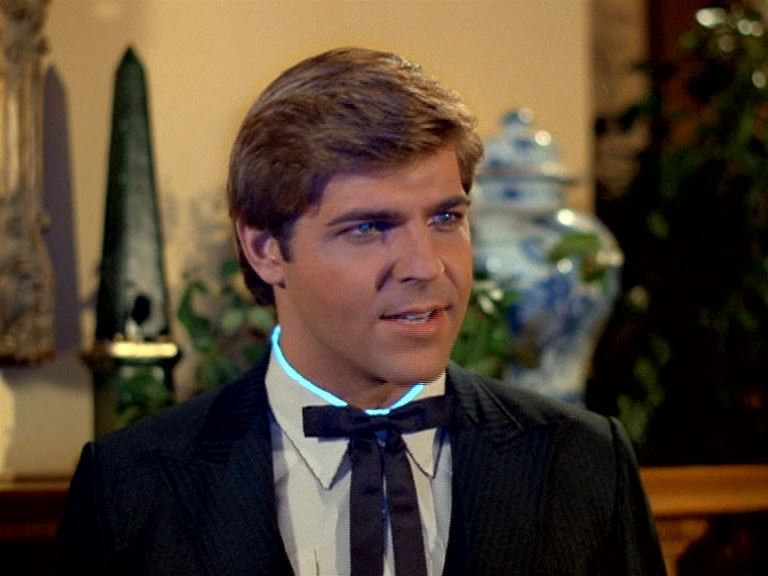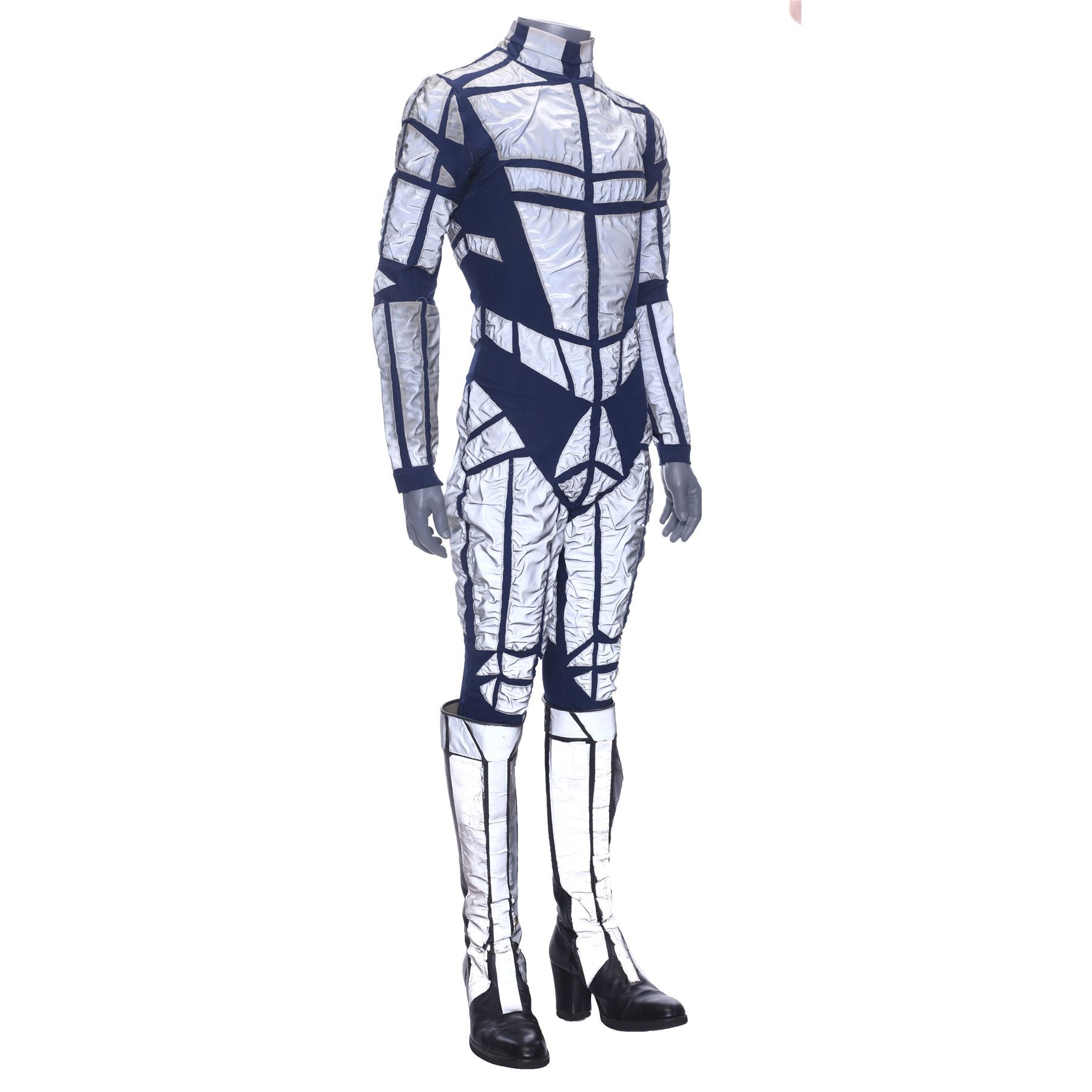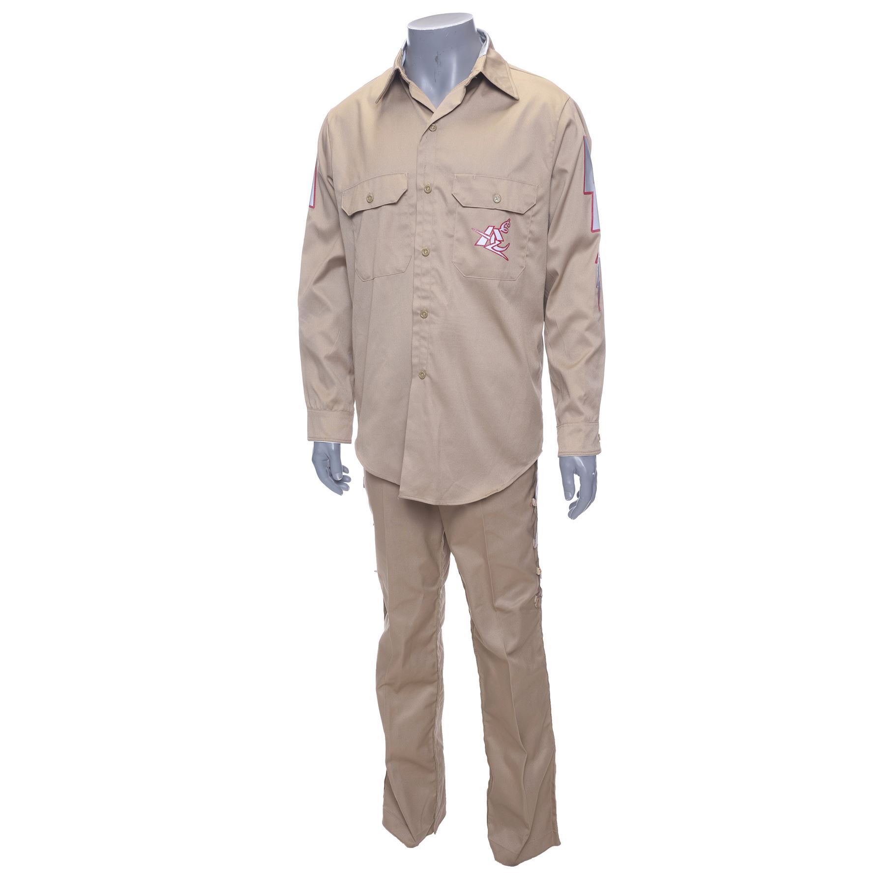 These costumes were designed by Jean-Pierre Dorleac. They consist of a blue jumpsuit with boot stirrups, a rear zipper, and patches of special retroreflective sheeting applied throughout to appear luminescent; a pair of leather Fabrizio Los Angeles high-heeled boots with reflective patches; a tan polyester and cotton work shirt affixed with red and white electricity-themed graphics and concealed fastening strip enclosures for tearing quickly off the wearer; matching breakaway pants with fastening strip closures; a white cotton Bosweel After Six pleated long-sleeve dress shirt; and a tan H Bar C California Ranchwear permanent press western shirt with dark brown trim and a faux pearl snap closure. Silver-color synthetic material is sewn to each shirt collar. Also included is a black and white promotional print featuring two photos from the series with a caption and 20th Century Fox copyright information. The lot exhibits wear from use and age, including staining, cracks in the adhered graphics, and rips and worn finish in some of the reflective patches.