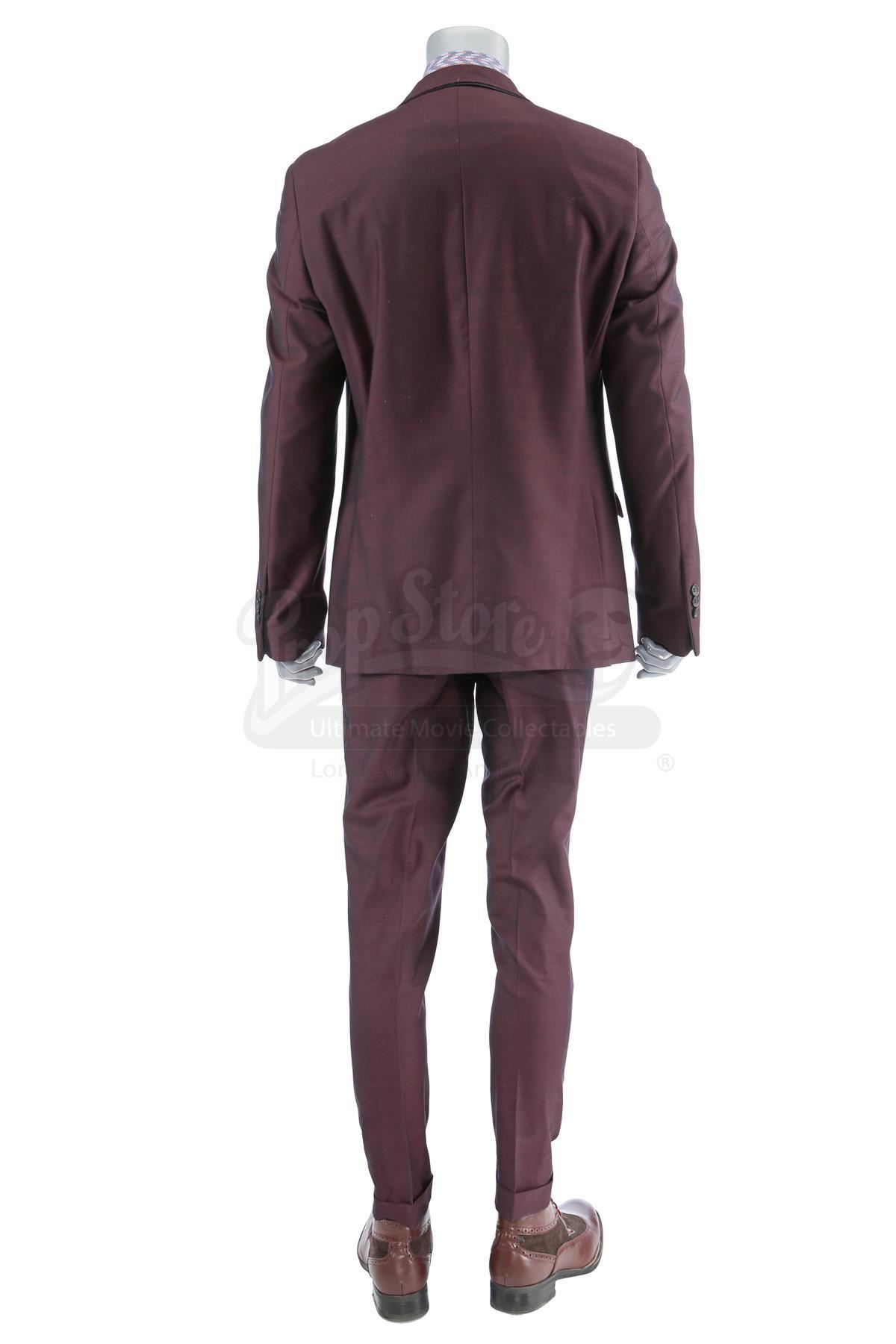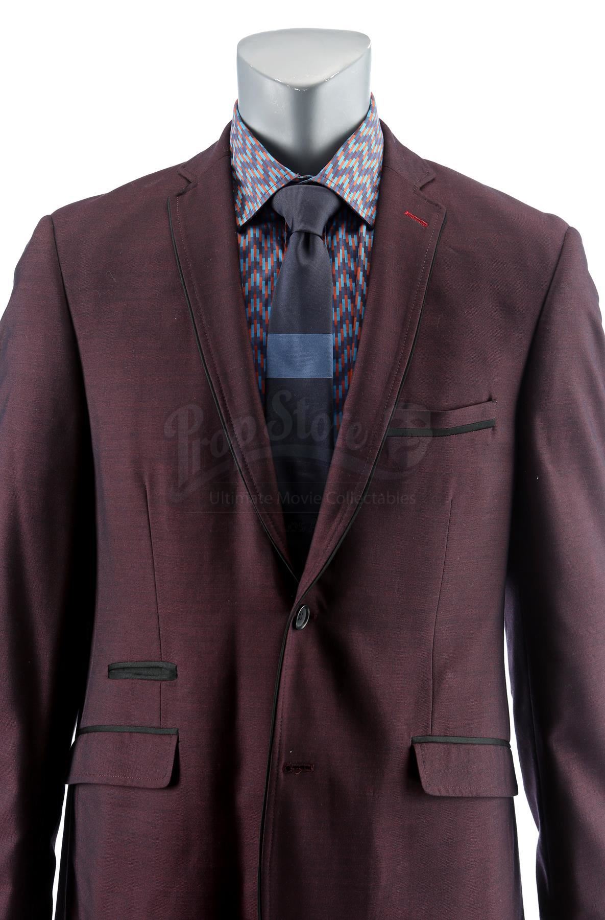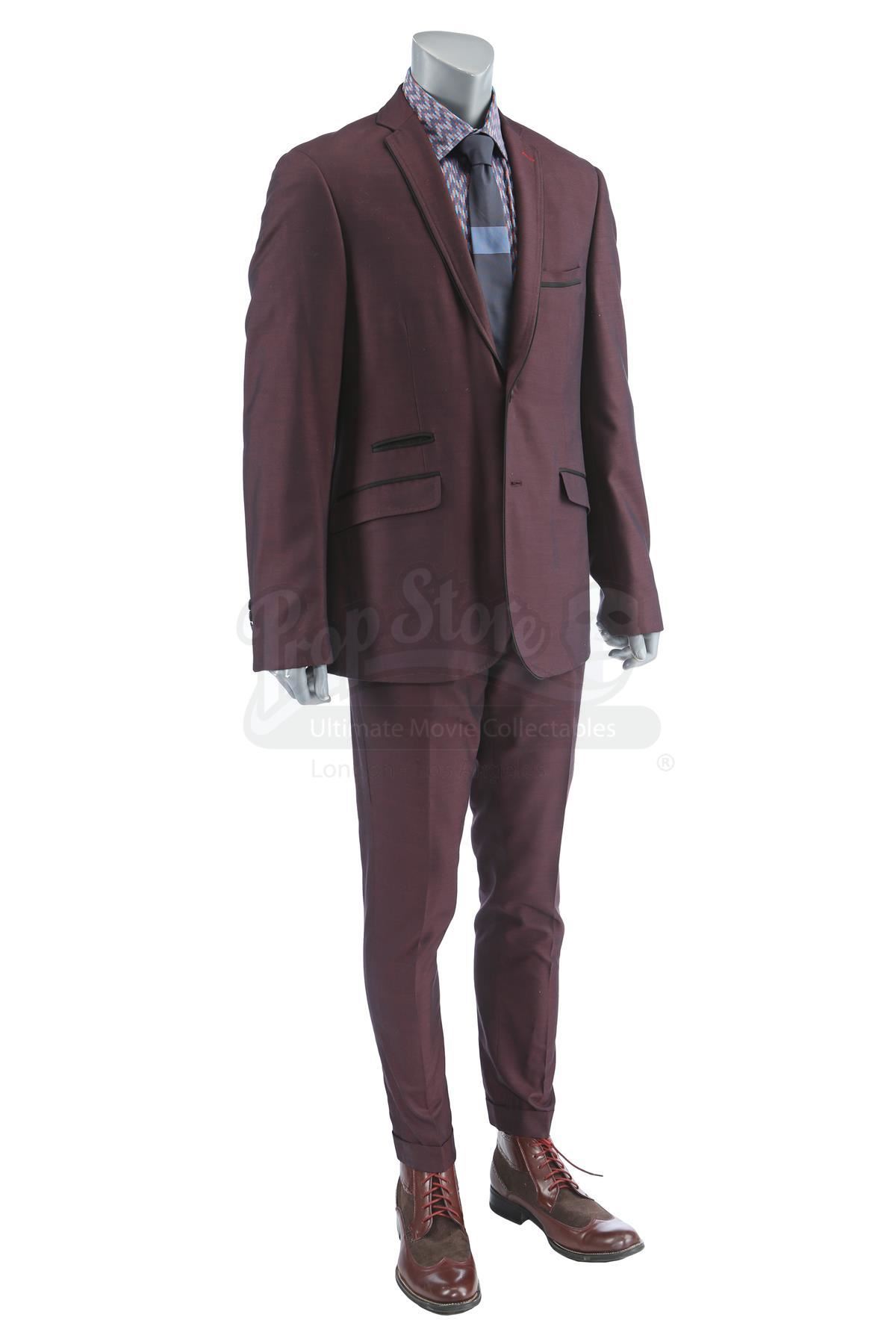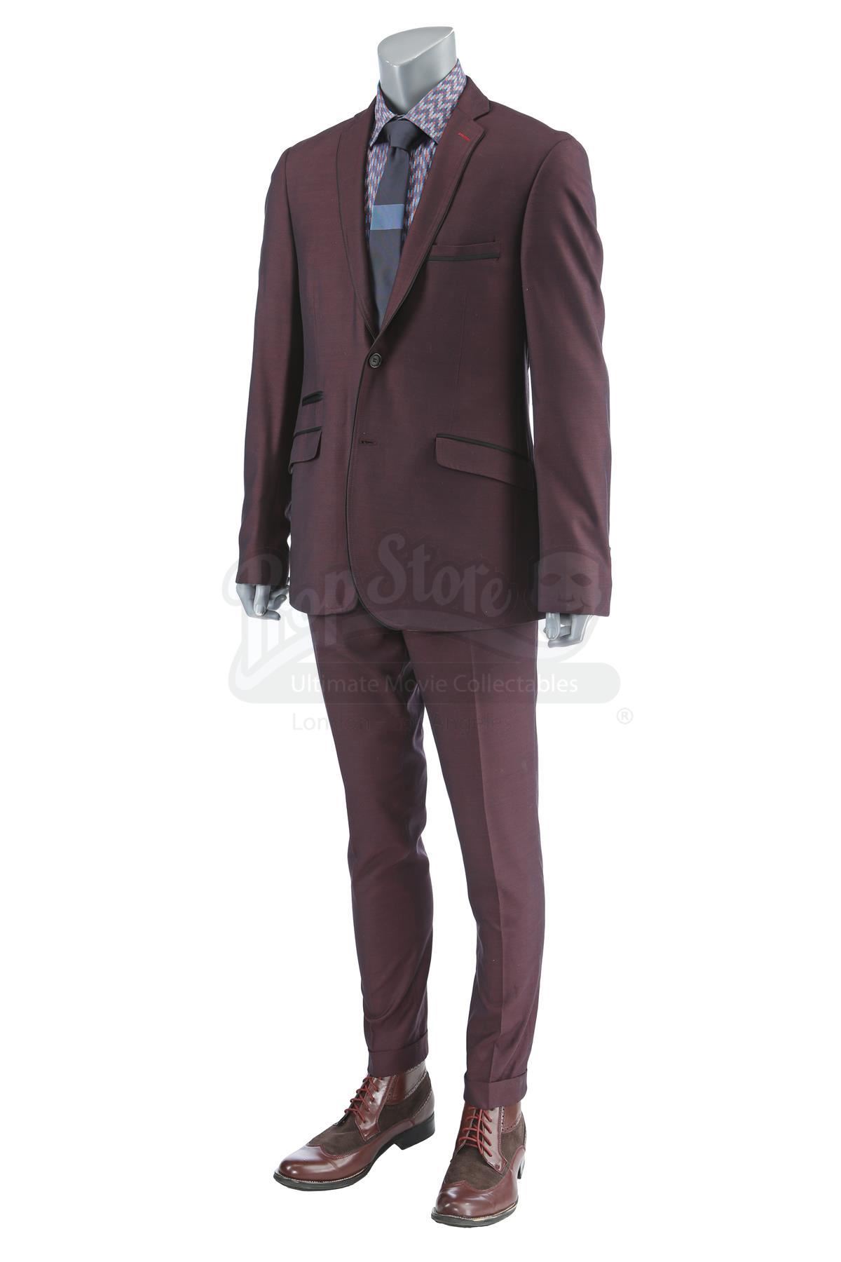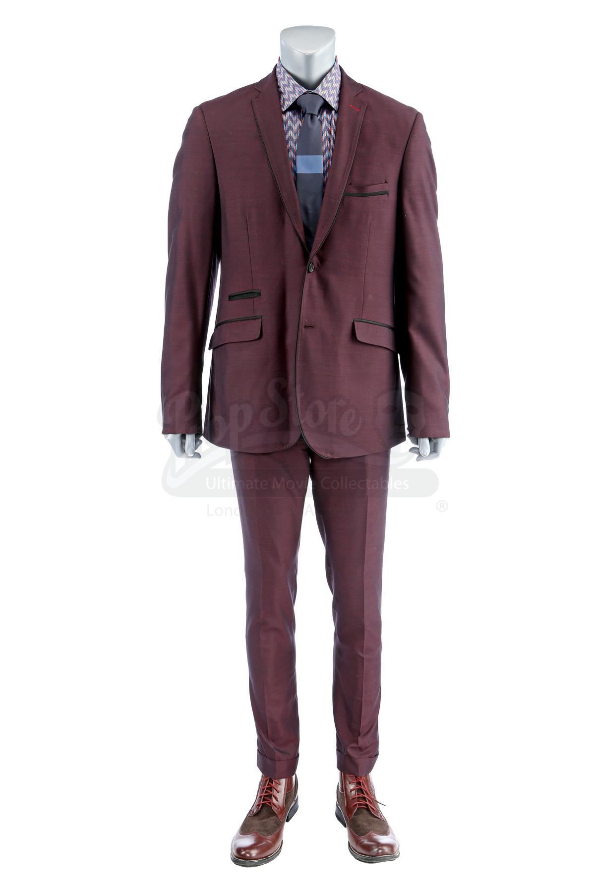 Dontrell ‘Cockroach’ Hamilton’s deal-making costume from the episode ‘Soul Brother #1’ (201) of Marvel's Luke Cage. In the episode, Hamilton wears his costume when he tries to make a deal with Mariah Dillard at Harlem’s Paradise. This lot consists of a dark purple viscose and polyester suit jacket and pants, both labeled ‘201 CH2 #12 Cockroach’, a blue, orange and burgundy cotton shirt, a spruce blue silk tie, and a pair of brown leather and rubber shoes. The lot is in good overall condition with minor signs of wear from production, including a small amount of faux blood on one shoe.