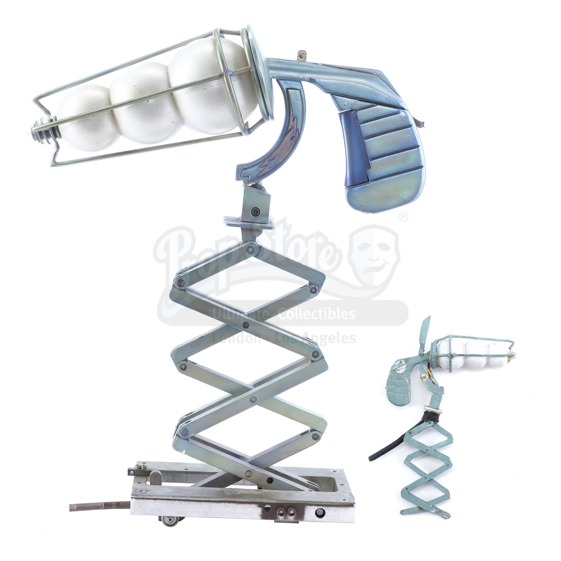 This lot will be auctioned on Wednesday, June 30th. The auction will begin at 9:00am PDT and lots are sold sequentially via live auctioneer; tune in to the live streaming broadcast on auction day to follow the pace. Note other lots in the auction may close on June 29th or July 1st. Clifford Daniels' (Martin Short) laser gun and miniature from the 1994 comedy Clifford. Clifford used his laser gun when he rode Larry the Scary Rex at Dinosaur World. The lot consists of the laser gun and miniature laser gun used for model miniature shots of the ride. The larger gun is cast resin, includes a grip trigger on the handle, and is fixed to a metal scissor extender. The miniature is also resin and features an extended scissor extender and a black cable attachment for electronic wiring from the production. The lot shows various signs of wear from production use and age as the sight is no longer attached to the laser gun and a bracket is loose from the miniature. Dimensions (Largest): 13" x 10" x 5.25" (25 cm x 33 cm x 13 cm); (smallest): 6" x 3.5" x .5" (15.25 cm x 9 cm x 1.25 cm) Estimate: $1,500 - 2,500