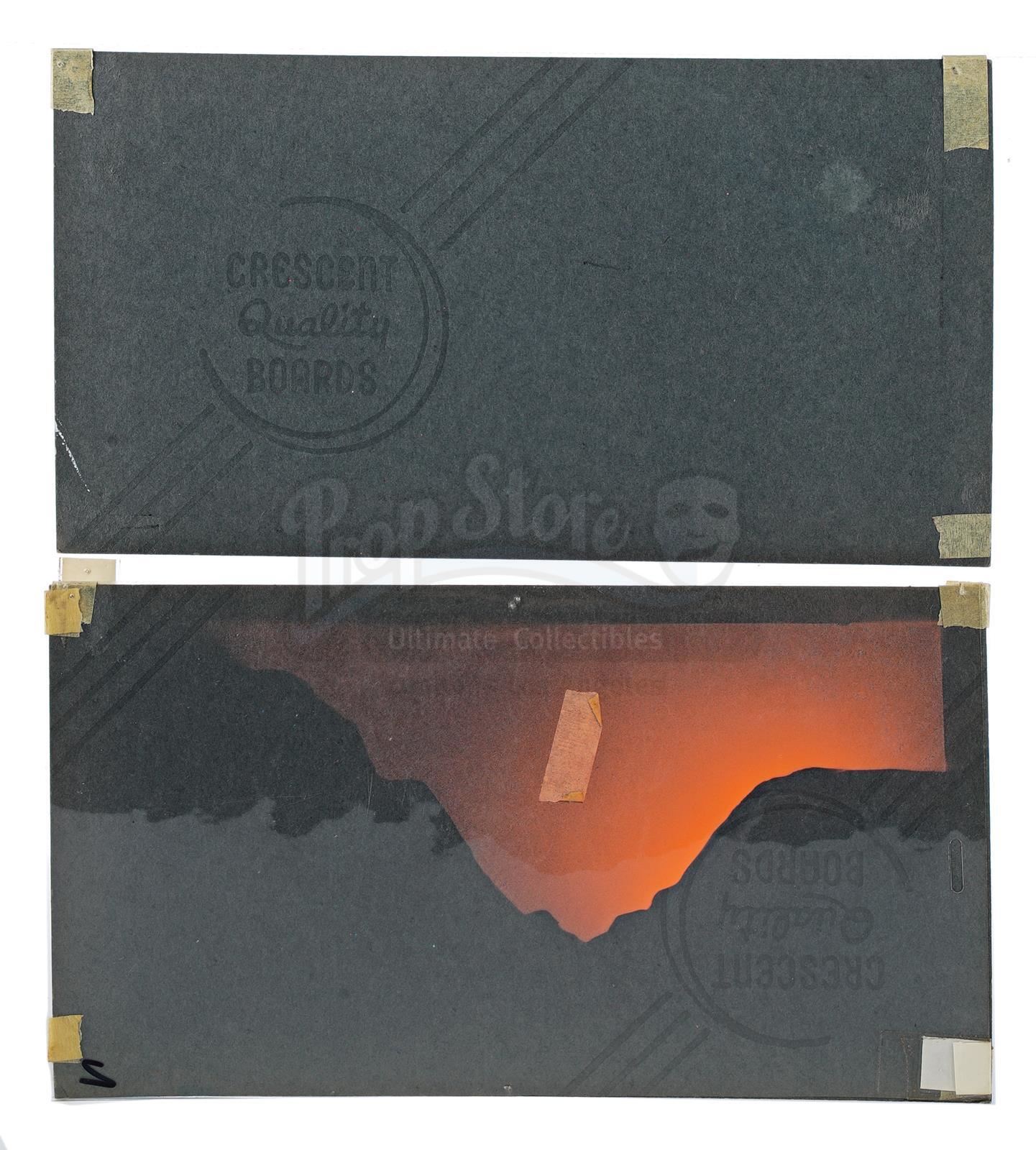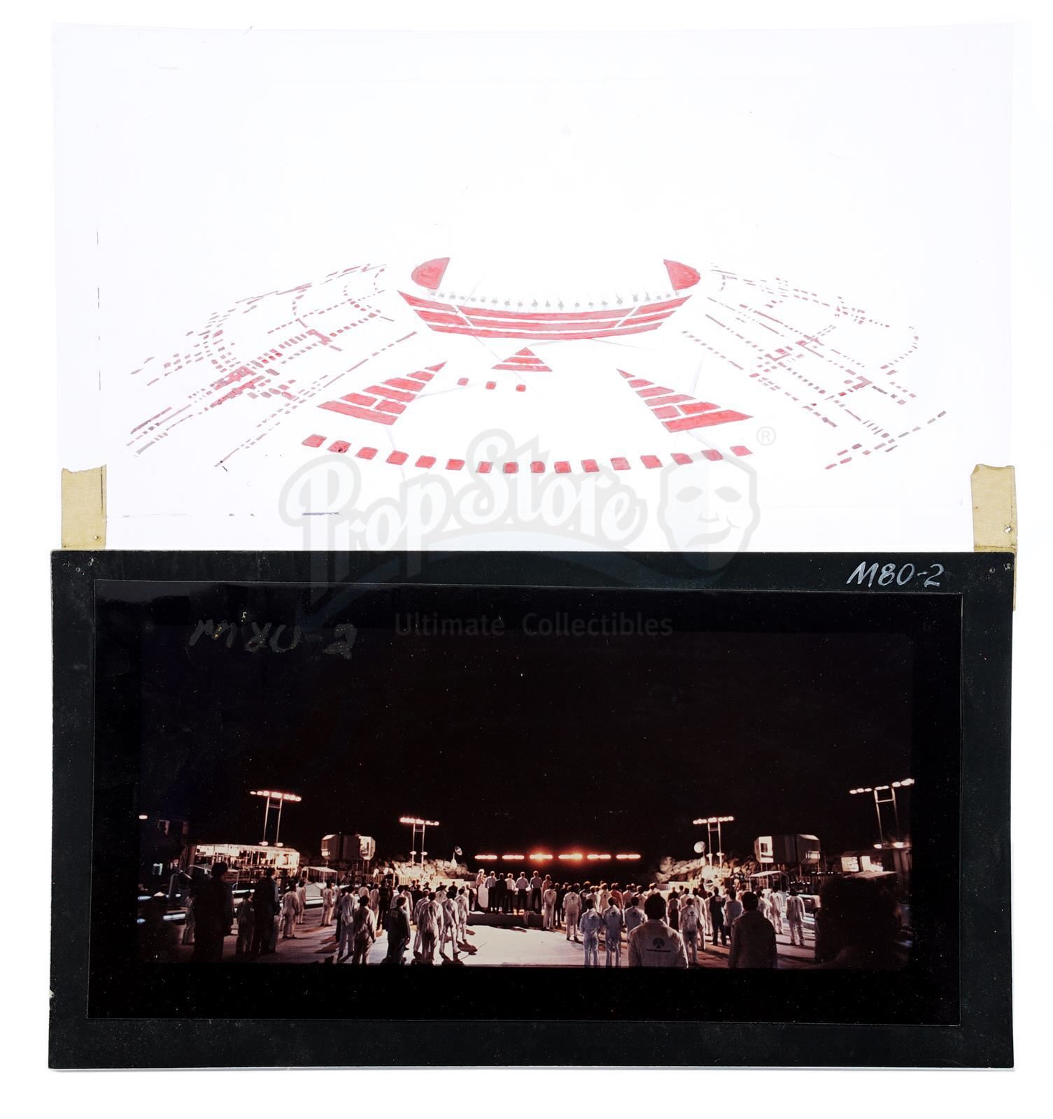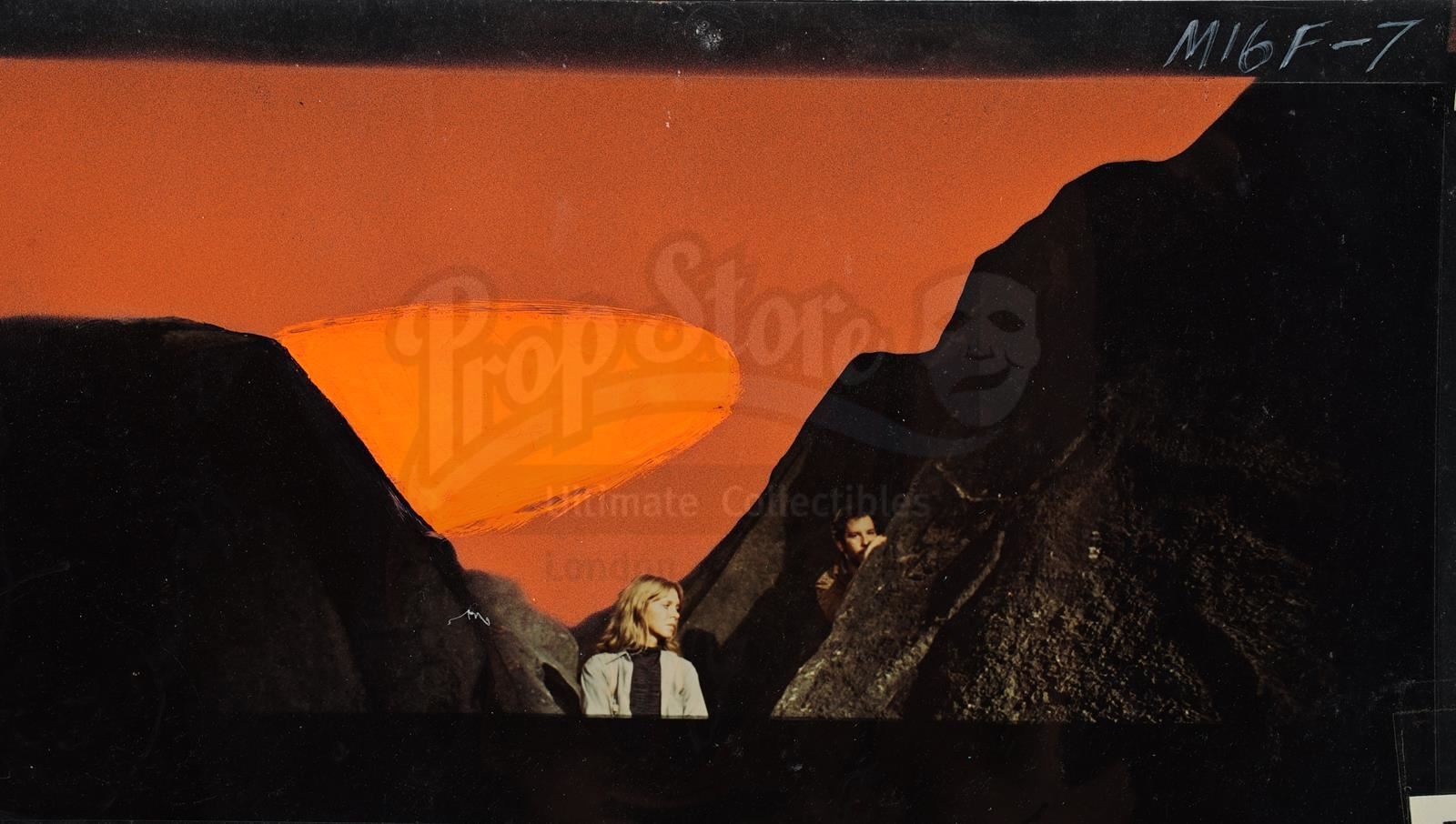 This lot will be auctioned on Wednesday, June 30th. The auction will begin at 9:00am PDT and lots are sold sequentially via live auctioneer; tune in to the live streaming broadcast on auction day to follow the pace. Note other lots in the auction may close on June 29th or July 1st.  Alien ship lighting concept illustrations hand-painted by Douglas Trumbull for Steven Spielberg's sci-fi film Close Encounters of the Third Kind. In the iconic finale, the extraterrestrial Mothership descended on Devils Tower, where its passengers chose Roy Neary (Richard Dreyfuss) to join them in space.  These two illustrations were created by special photographic effects artist Trumbull to plan composite shots. Each consists of a photo print of a live-action scene adhered to black illustration board with a clear plastic cel taped over it and a hand-painted illustration of the lighting of the alien vessels. One, labeled M80-2, depicts the Mothership above Devils Tower; the other, labeled M16F-7, depicts a smaller craft passing above Roy and Jillian Guiler (Melinda Dillon). Both are in good overall condition with some wear from use and age. Dimensions (each): 6.25" x 11" (16 cm x 28 cm)  Sold without copyright; see notice in the Buyer's Guide  Estimate: $3,000 - 5,000