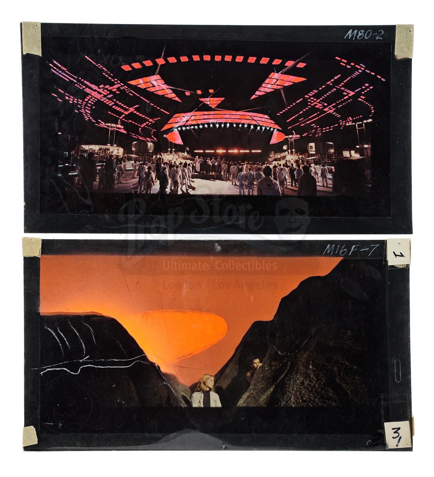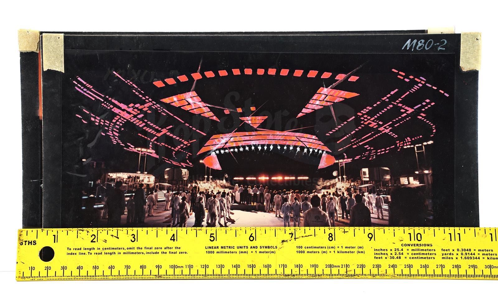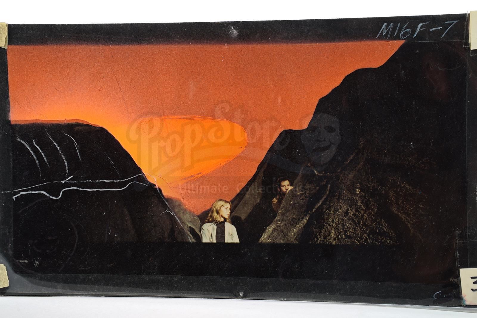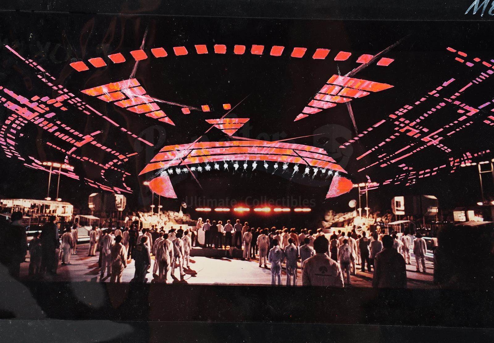 This lot will be auctioned on Wednesday, June 30th. The auction will begin at 9:00am PDT and lots are sold sequentially via live auctioneer; tune in to the live streaming broadcast on auction day to follow the pace. Note other lots in the auction may close on June 29th or July 1st.  Alien ship lighting concept illustrations hand-painted by Douglas Trumbull for Steven Spielberg's sci-fi film Close Encounters of the Third Kind. In the iconic finale, the extraterrestrial Mothership descended on Devils Tower, where its passengers chose Roy Neary (Richard Dreyfuss) to join them in space.  These two illustrations were created by special photographic effects artist Trumbull to plan composite shots. Each consists of a photo print of a live-action scene adhered to black illustration board with a clear plastic cel taped over it and a hand-painted illustration of the lighting of the alien vessels. One, labeled M80-2, depicts the Mothership above Devils Tower; the other, labeled M16F-7, depicts a smaller craft passing above Roy and Jillian Guiler (Melinda Dillon). Both are in good overall condition with some wear from use and age. Dimensions (each): 6.25" x 11" (16 cm x 28 cm)  Sold without copyright; see notice in the Buyer's Guide  Estimate: $3,000 - 5,000