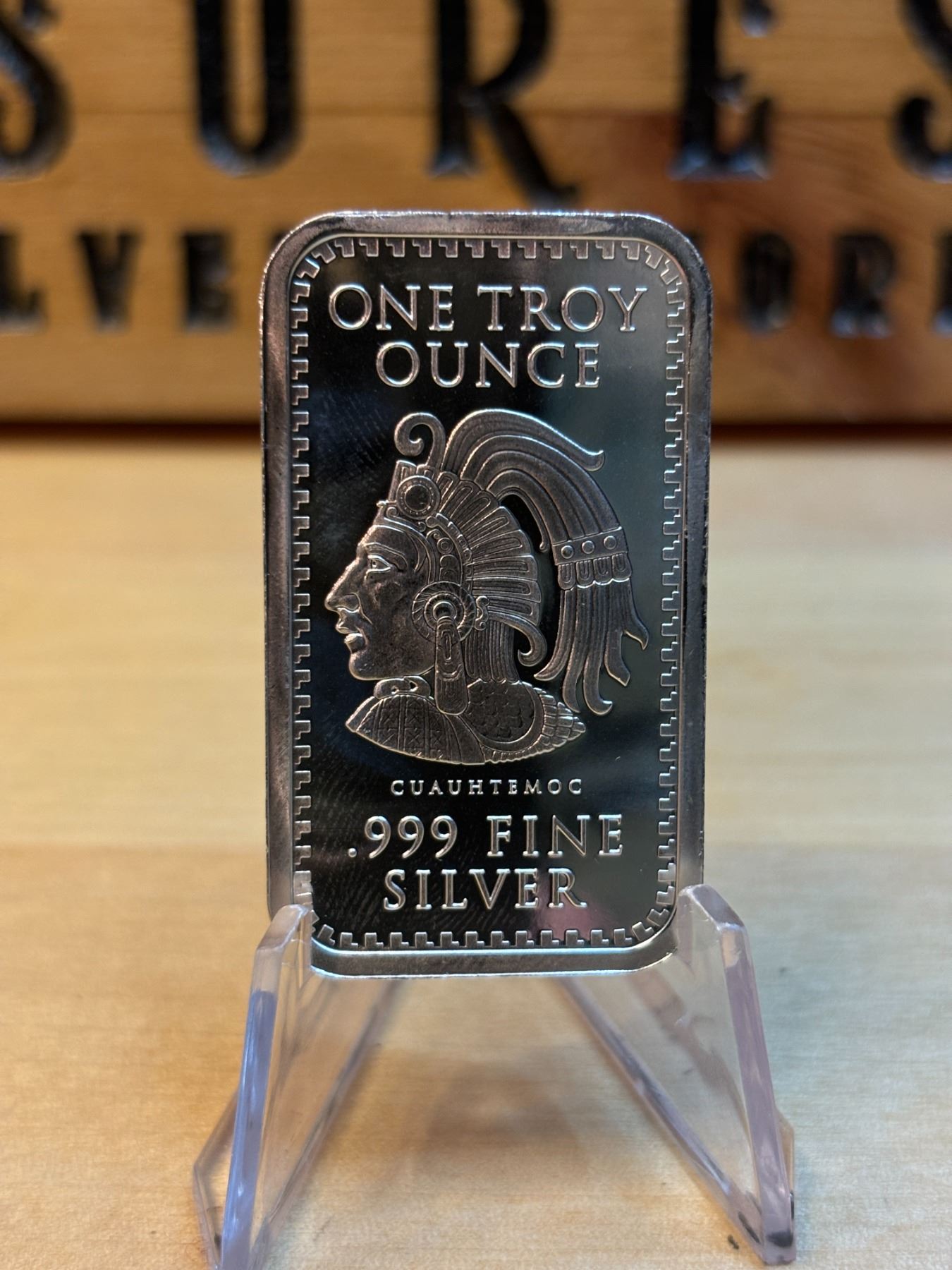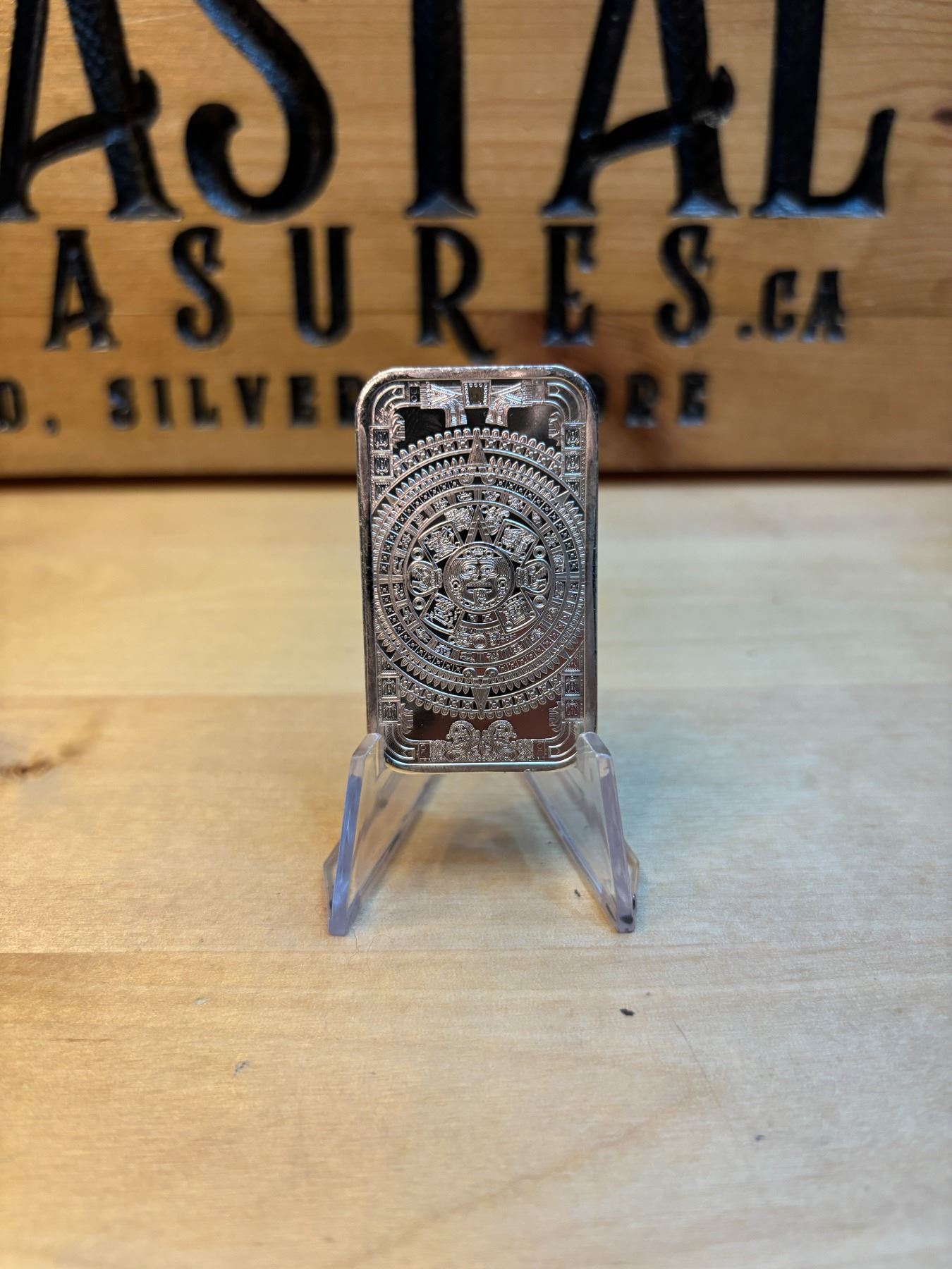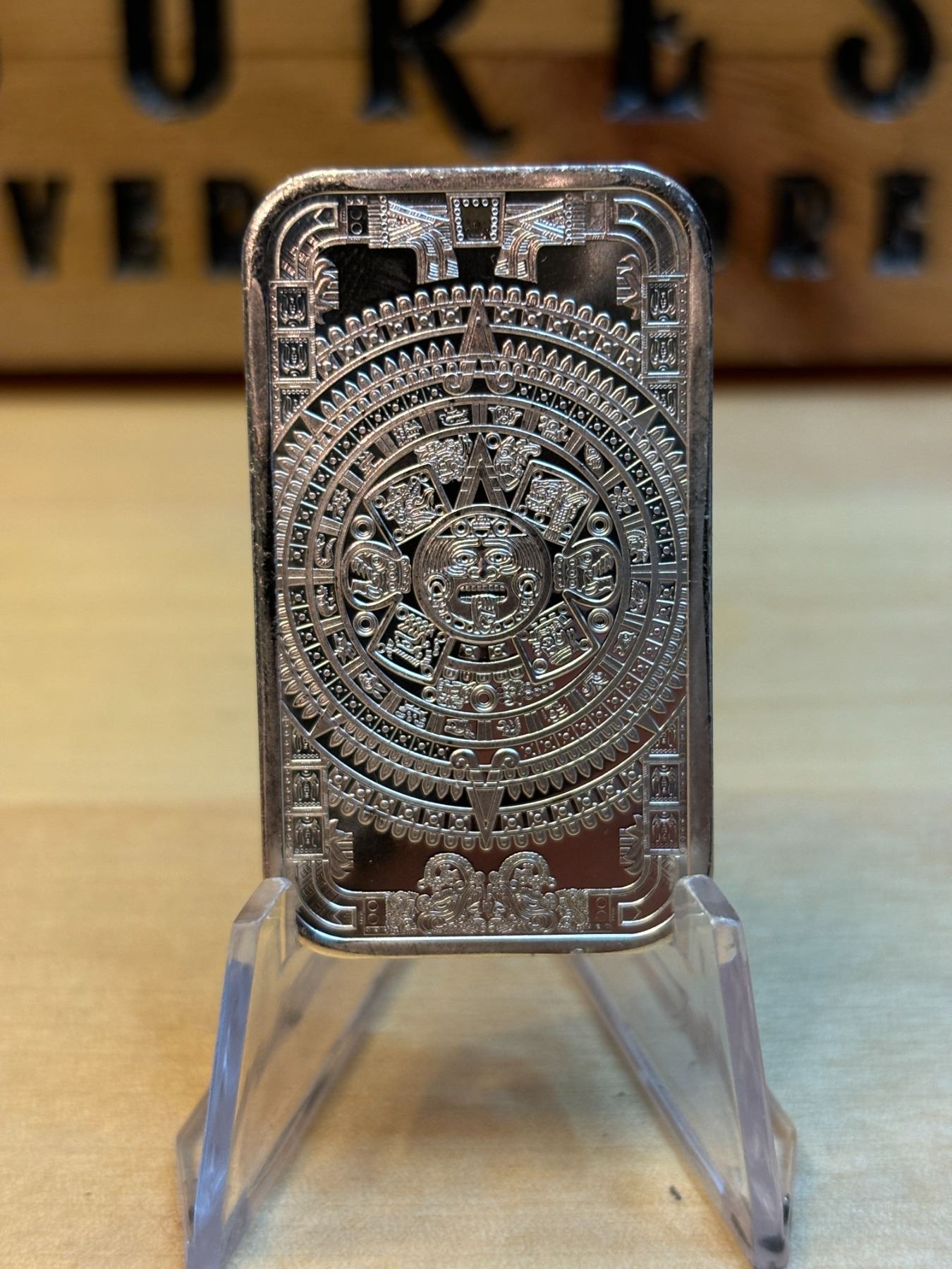 A 1 oz Aztec Calendar Silver Bar is a silver bar that contains 1 ounce of 99.9% pure silver, featuring a design inspired by the famous Aztec Sun Stone, also known as the Aztec Calendar Stone. This intricate and detailed design showcases the symbolic calendar used by the Aztec civilization, representing their advanced knowledge of time and astronomy. The design often includes the central face of the sun god Tonatiuh, surrounded by various symbols representing the days, months, and years in the Aztec calendar. These bars are popular with collectors due to their unique cultural and historical significance, and they may carry a premium over the silver spot price because of their design and limited mintage.