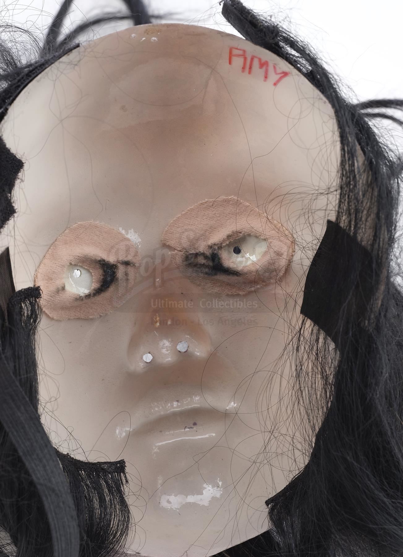 This flesh-colored plastic mask is marked "Amy" on the interior, painted to appear veiny and grimy, and affixed with long synthetic black hair and black Velcro straps. It exhibits signs of wear from production use and remains in excellent overall condition.