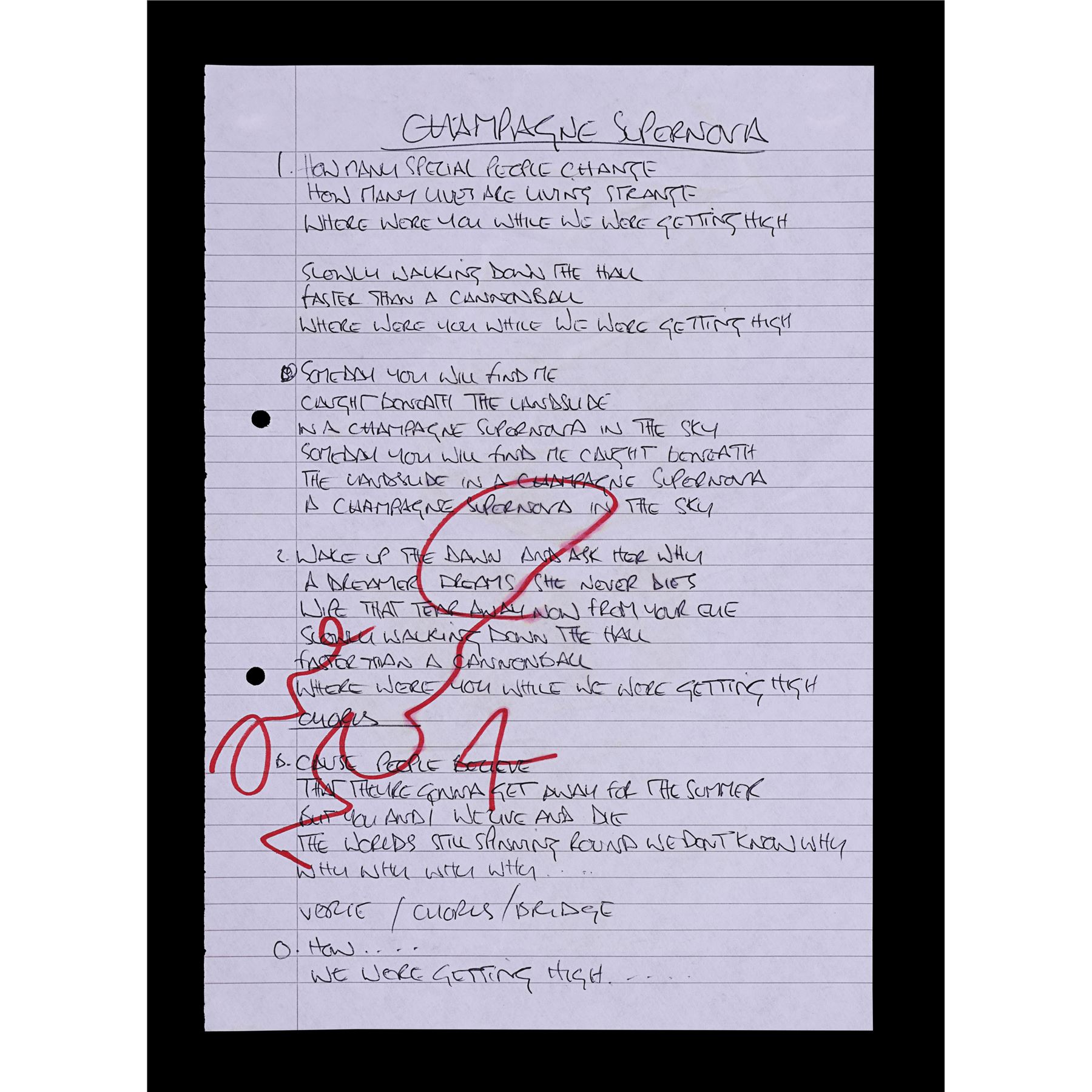 The lyrics for the Oasis song "Champagne Supernova", handwritten and signed by Noel Gallagher. "Champagne Supernova" was the final track on the band's second album (What's the Story) Morning Glory?, released in 1995 and widely considered one of the best albums of all time.
