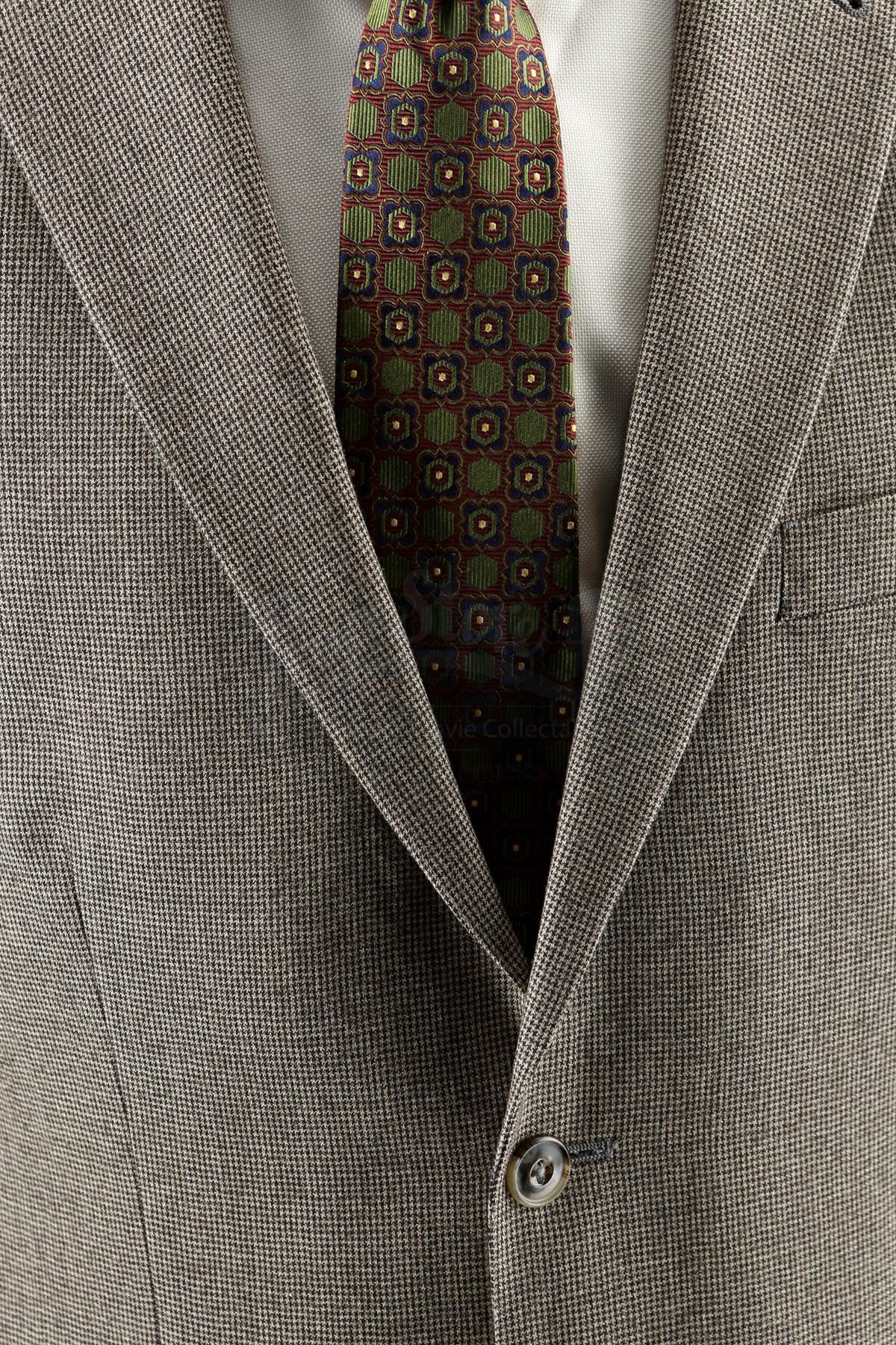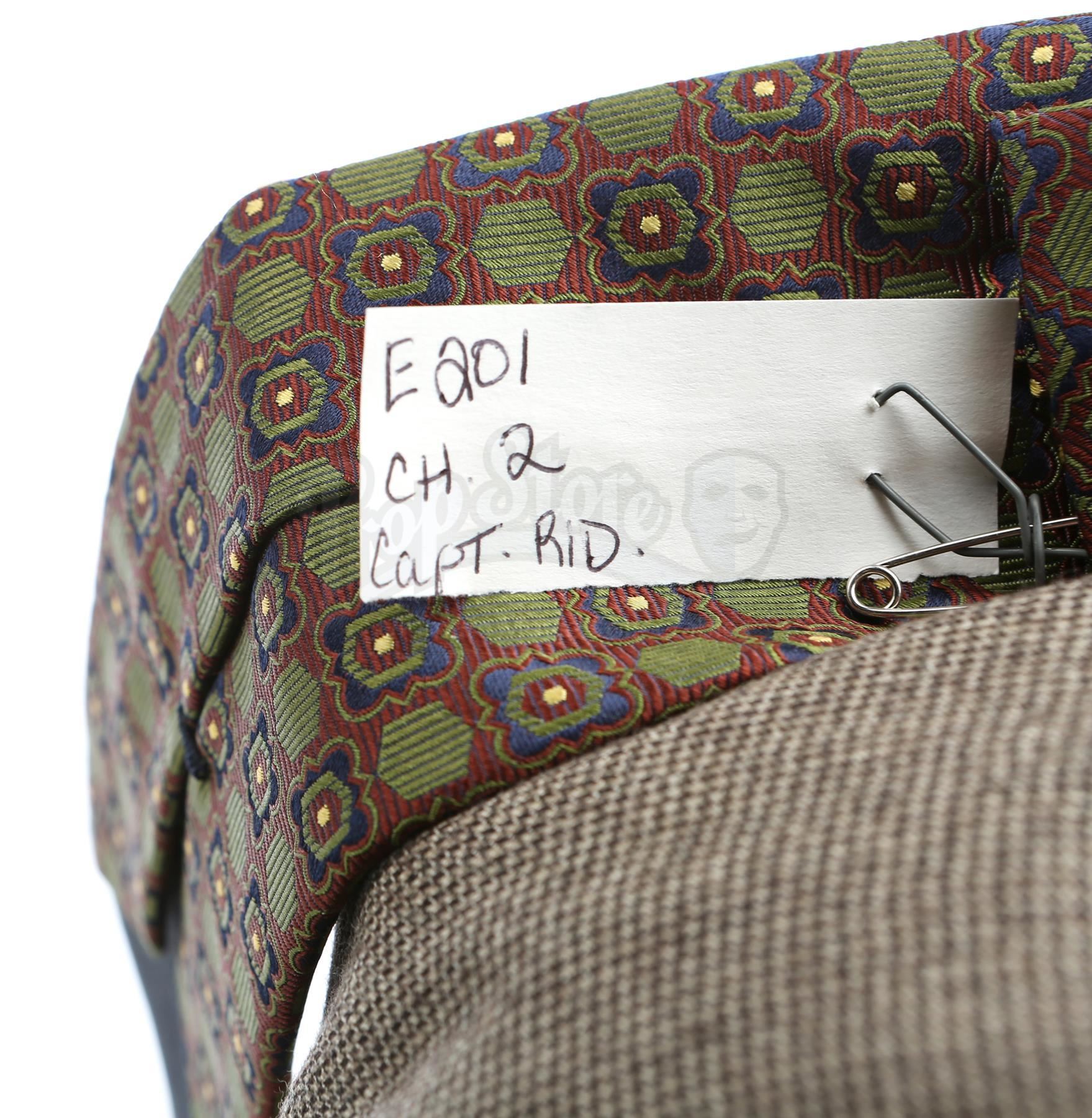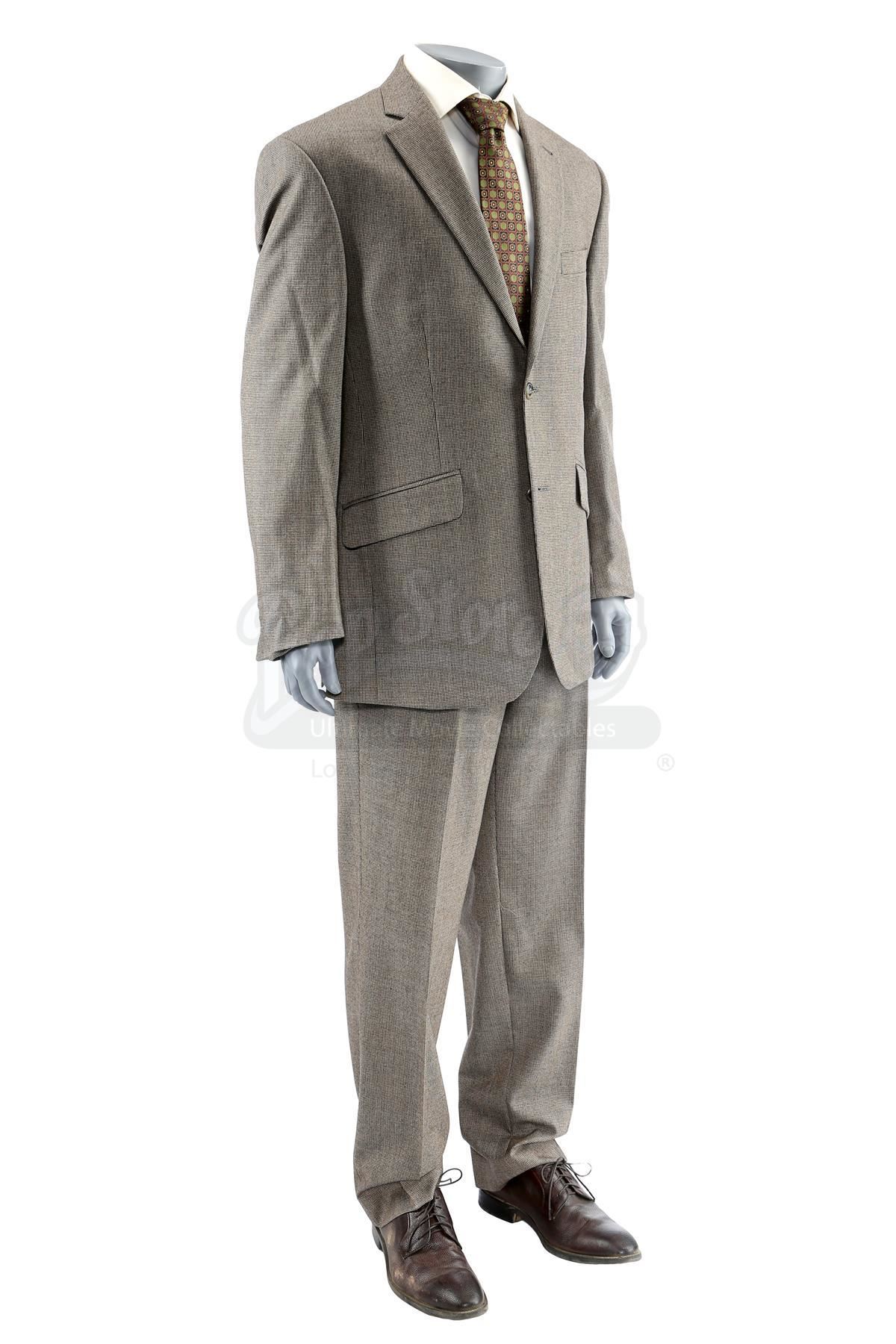 Thomas 'Tom' Ridenhour’s costume from the episode ‘Soul Brother #1’ (201) of Marvel’s Luke Cage. In the episode, Ridenhour wears his costume when Misty Knight comes into the precinct to ask for her job back. This lot consists of a wool two-piece suit with a brown houndstooth pattern, a cream-color cotton button-up shirt, a dark red, green, and navy silk tie, a pair of brown leather dress shoes, and a production tag pinned to the tie marked ‘E201 CH.2 Capt. Rid’. This lot is in good overall condition with minor signs of wear from production.