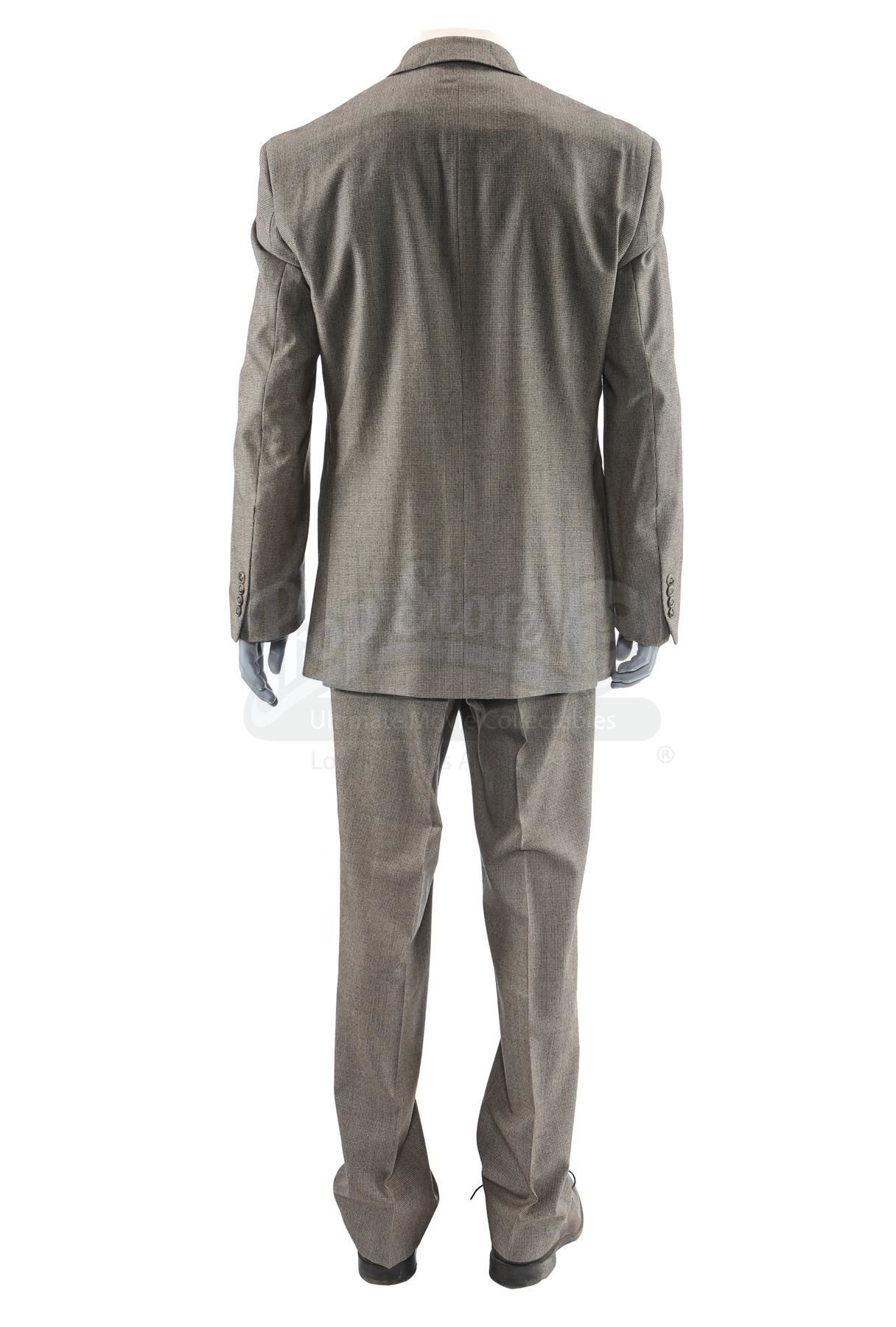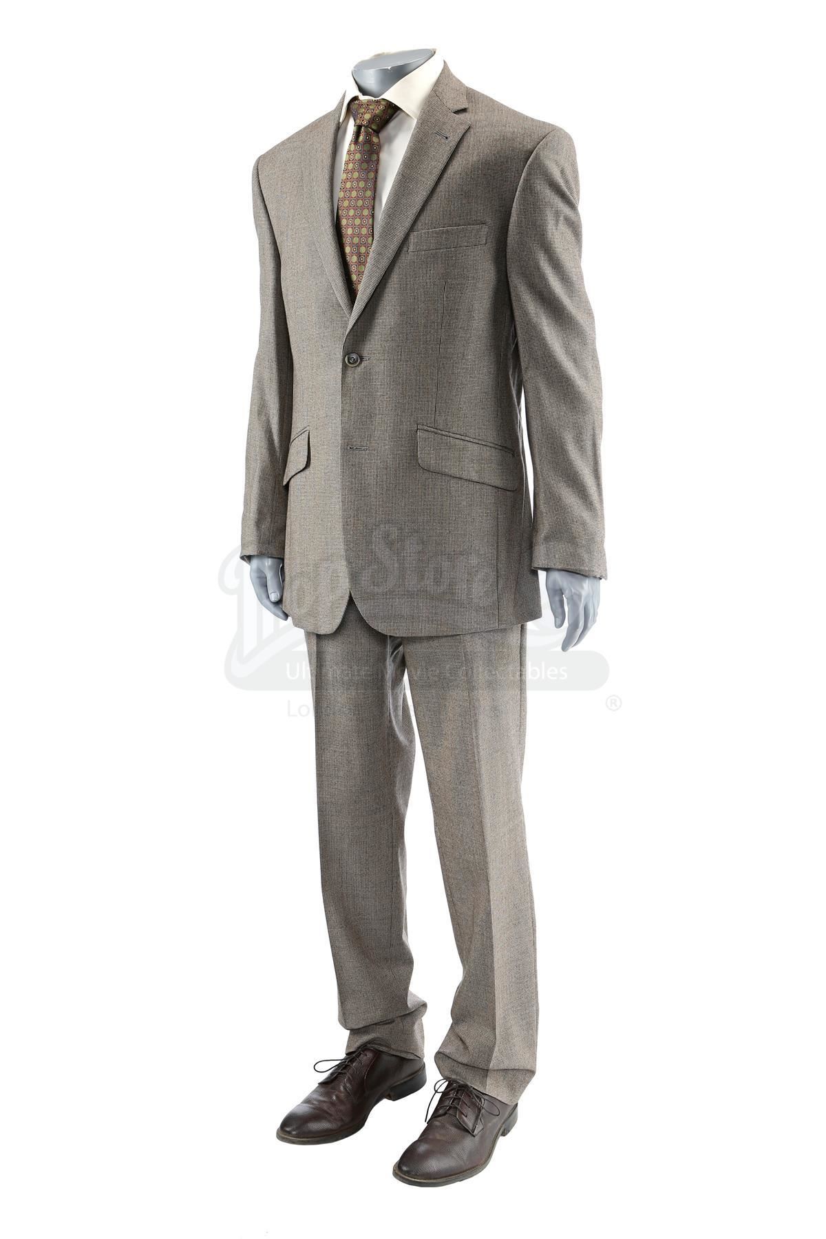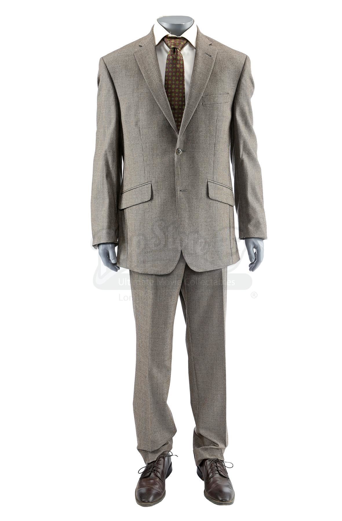 Thomas 'Tom' Ridenhour’s costume from the episode ‘Soul Brother #1’ (201) of Marvel’s Luke Cage. In the episode, Ridenhour wears his costume when Misty Knight comes into the precinct to ask for her job back. This lot consists of a wool two-piece suit with a brown houndstooth pattern, a cream-color cotton button-up shirt, a dark red, green, and navy silk tie, a pair of brown leather dress shoes, and a production tag pinned to the tie marked ‘E201 CH.2 Capt. Rid’. This lot is in good overall condition with minor signs of wear from production.