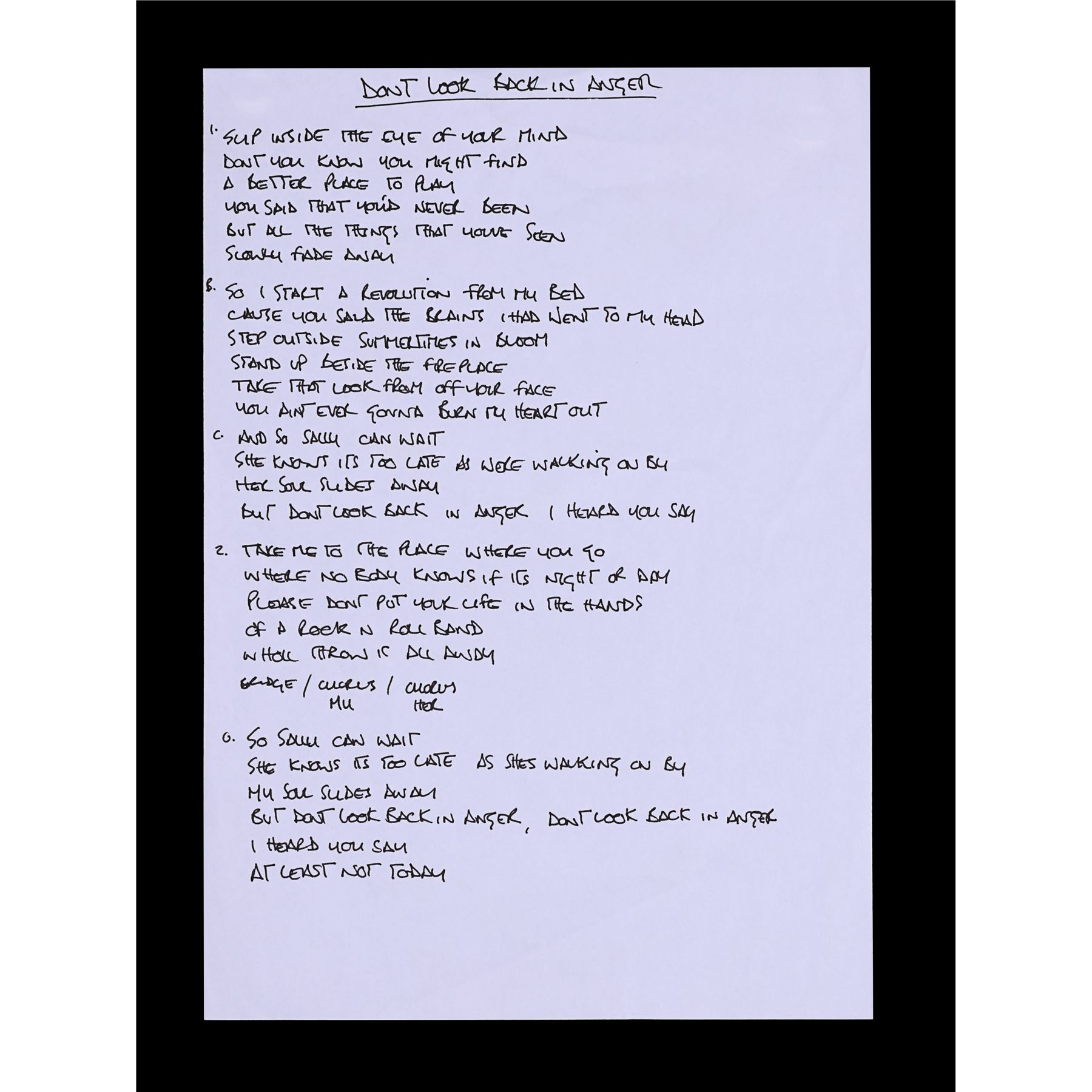 The lyrics for the Oasis song "Don't Look Back In Anger" handwritten by Noel Gallagher. "Don't Look Back In Anger" was the fourth track on the band's second album (What's the Story) Morning Glory?, which was released in 1995 and is widely considered one of the best albums of all time. It was also the first single to feature Noel on lead vocals.