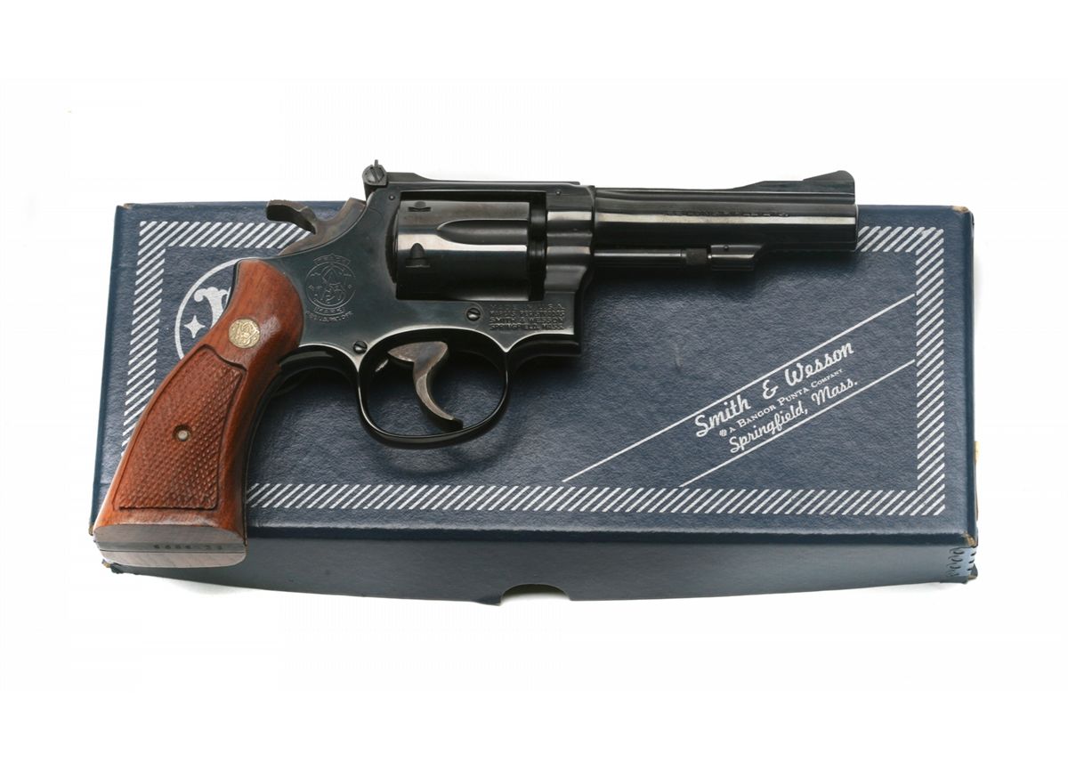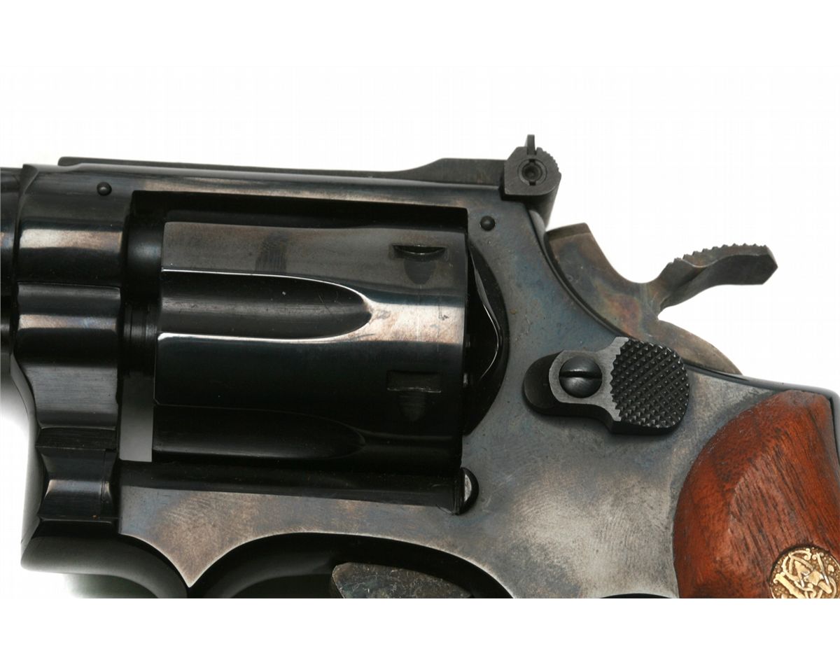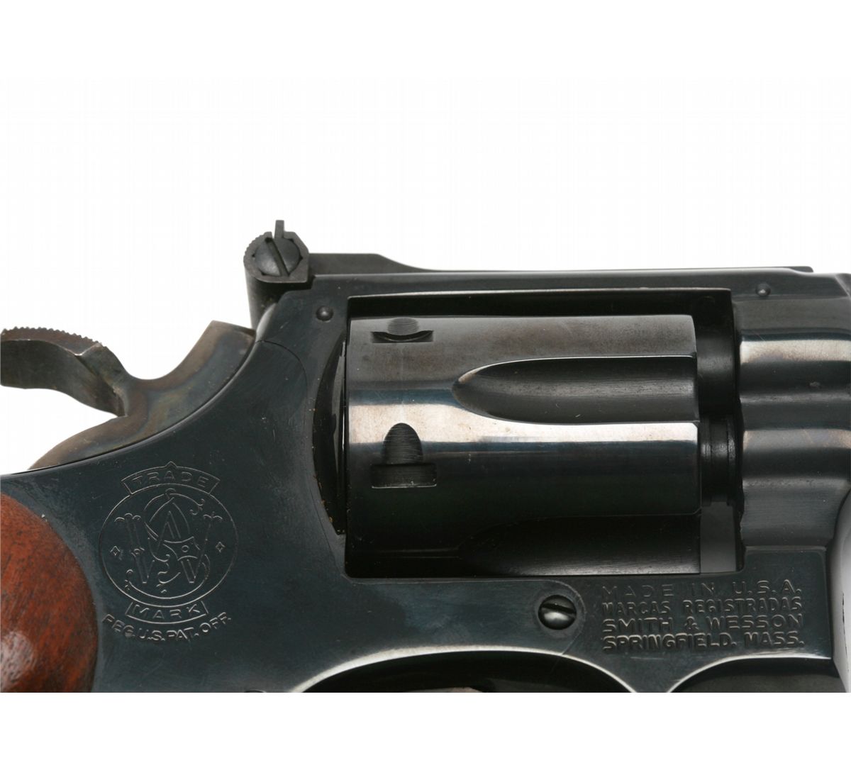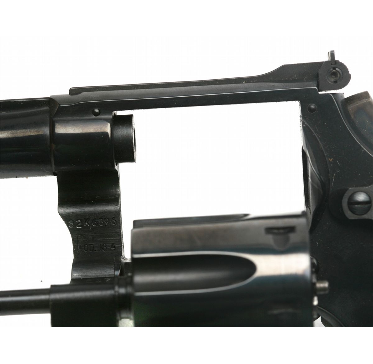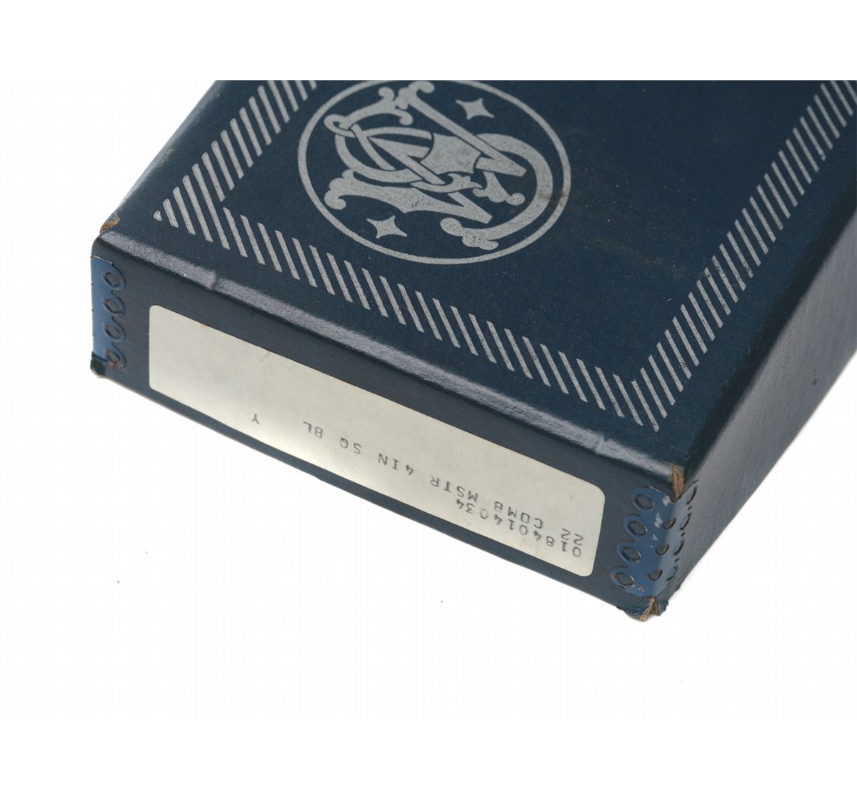 ANIB condition - 4" pinned ribbed barrel - The K-22 Combat Masterpiece model - retains 98%+ blue finish - checkered walnut K frame grips with S&W medallions in excellent condition - front raised serrated ramp & rear black micrometer adjustable sights - crisp markings on barrel & frame - crisp yoke markings - 6-shot fluted cylinder - strong case color on hammer & trigger - .500 serrated trigger & combat wide target hammer - 10 grooved backstrap & top strap - appears fired very little - yr. mfg: 1977-1985 - factory Bangor Punta box with intact corners sealed cleaning kit & manual - SN 82K6896 - est. 425 - 650 - FFL - 25JJCHKS006