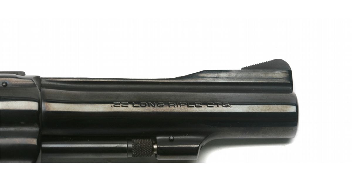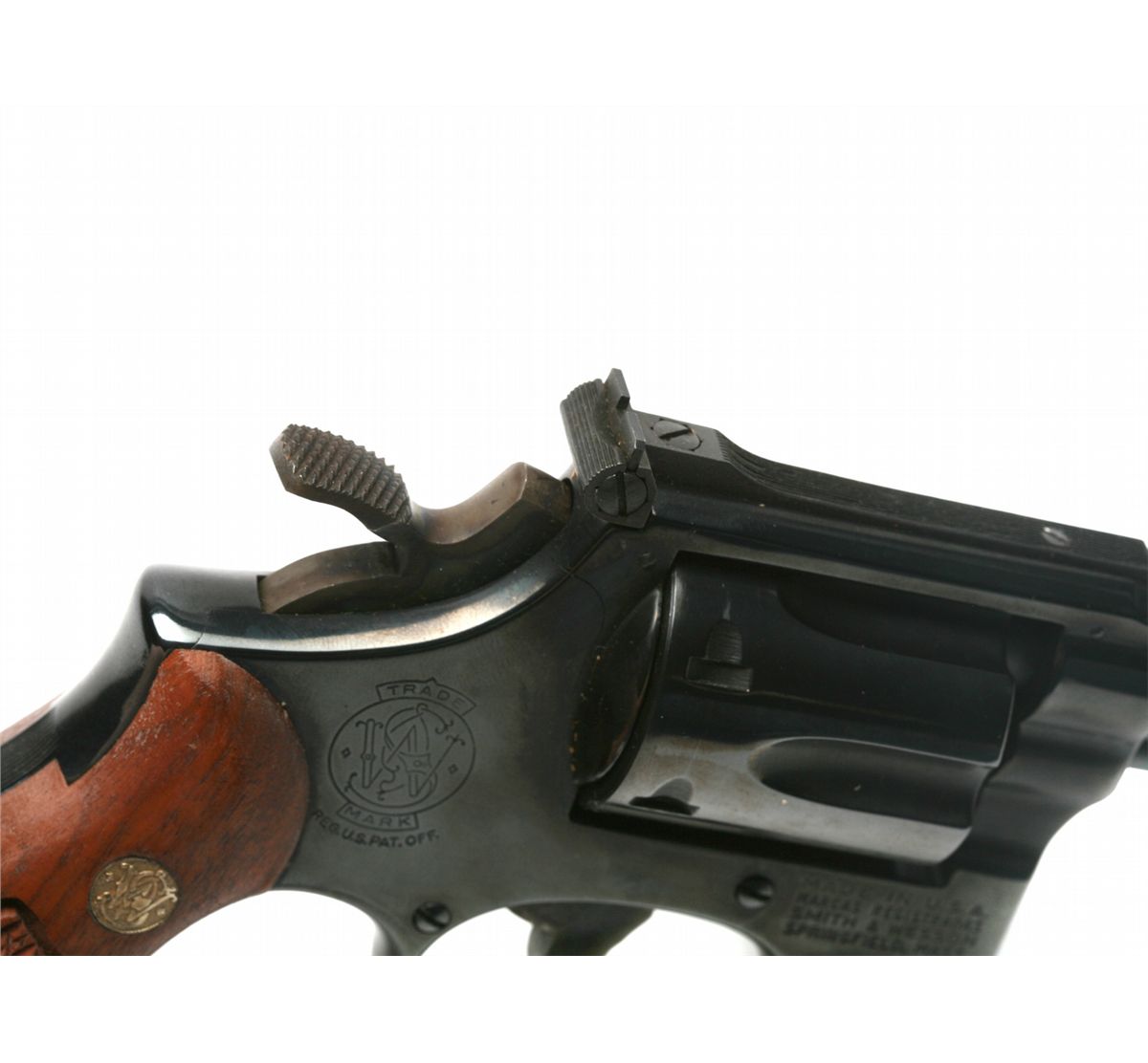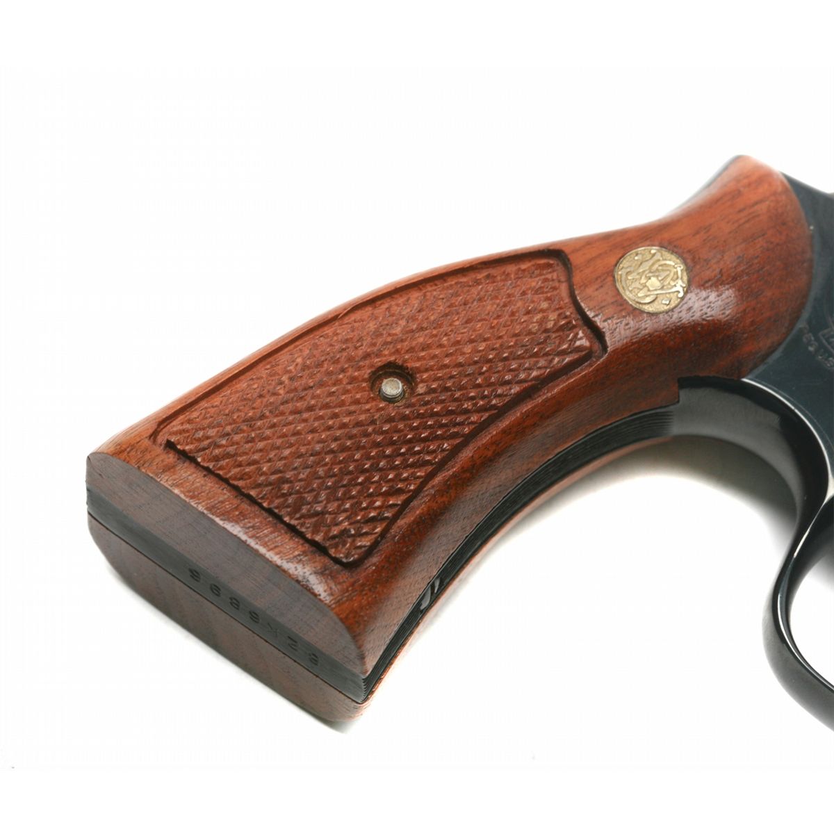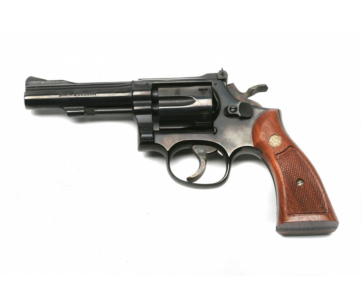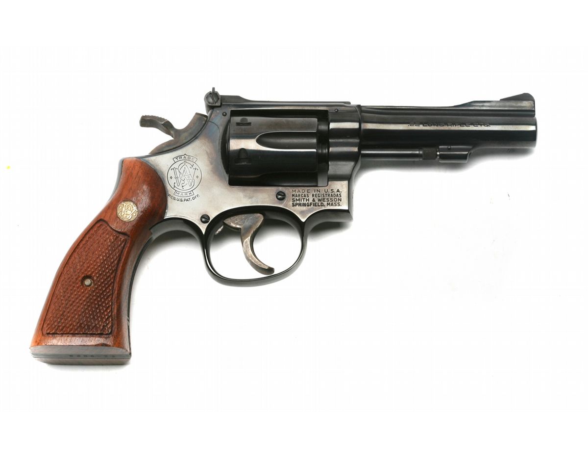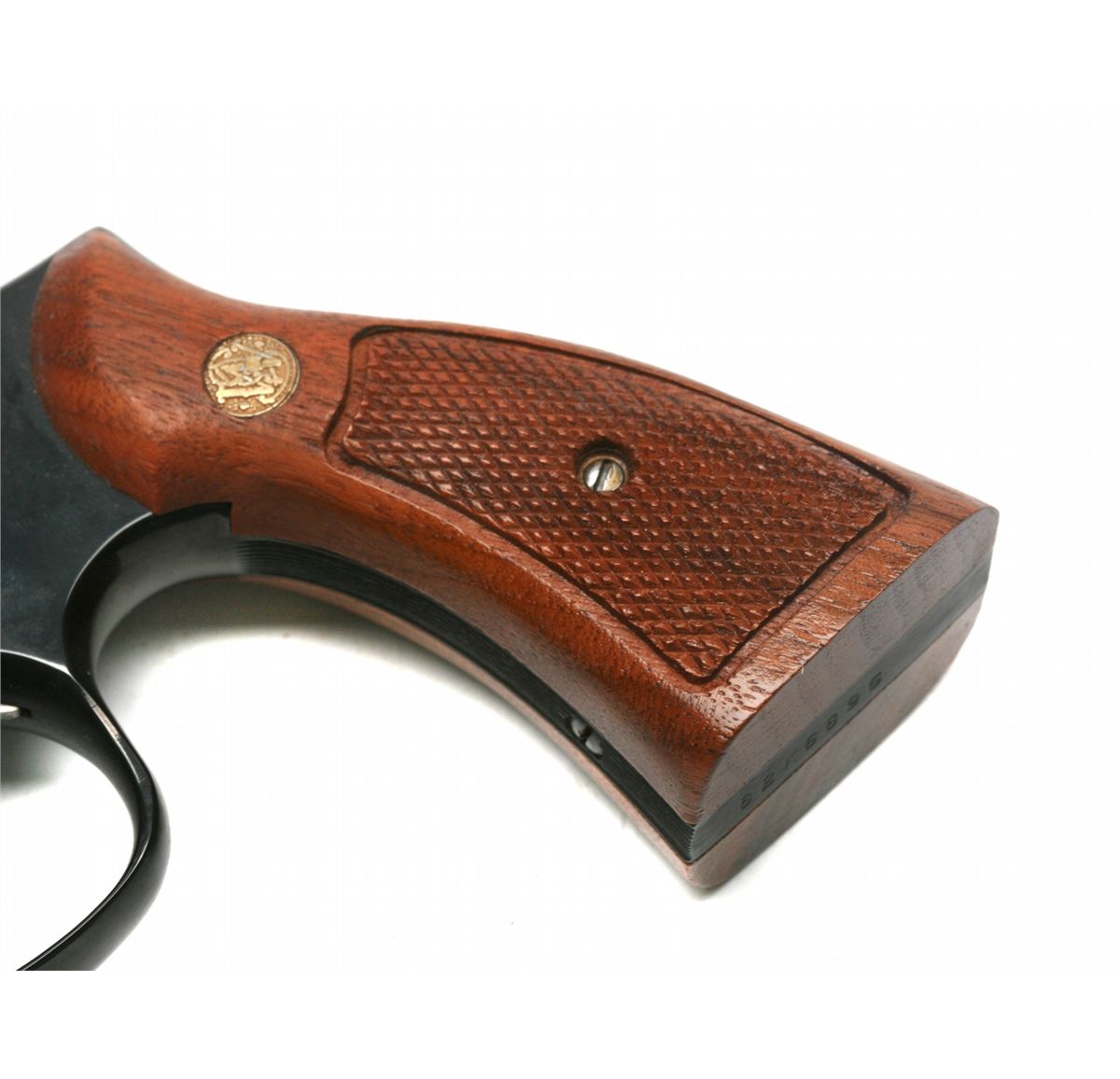 ANIB condition - 4" pinned ribbed barrel - The K-22 Combat Masterpiece model - retains 98%+ blue finish - checkered walnut K frame grips with S&W medallions in excellent condition - front raised serrated ramp & rear black micrometer adjustable sights - crisp markings on barrel & frame - crisp yoke markings - 6-shot fluted cylinder - strong case color on hammer & trigger - .500 serrated trigger & combat wide target hammer - 10 grooved backstrap & top strap - appears fired very little - yr. mfg: 1977-1985 - factory Bangor Punta box with intact corners sealed cleaning kit & manual - SN 82K6896 - est. 425 - 650 - FFL - 25JJCHKS006