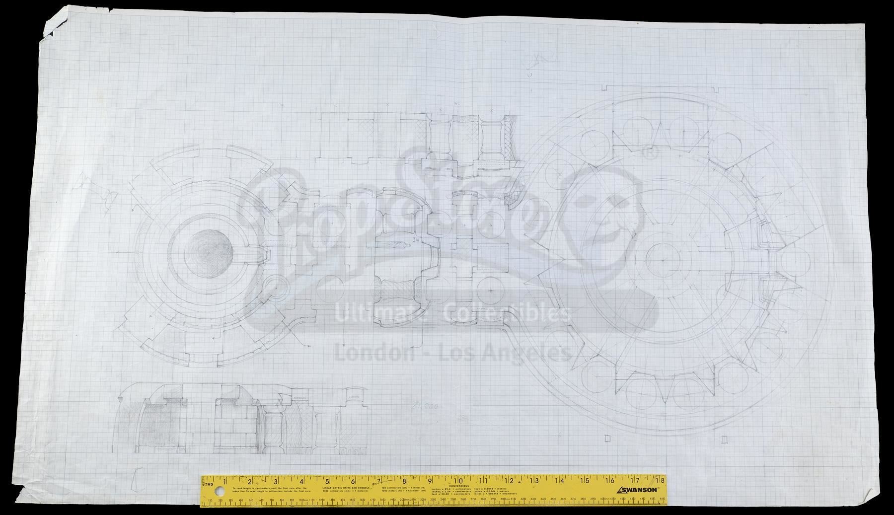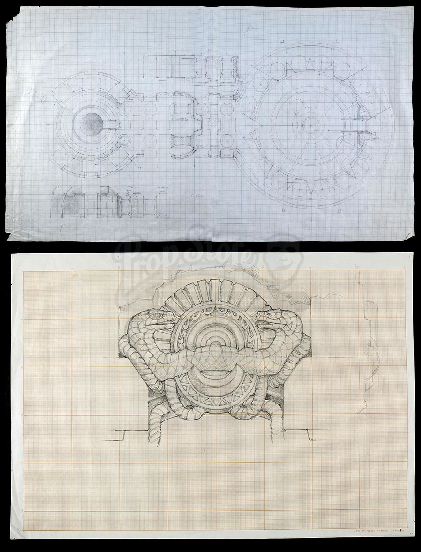 This lot will be auctioned on Wednesday, June 30th. The auction will begin at 9:00am PDT and lots are sold sequentially via live auctioneer; tune in to the live streaming broadcast on auction day to follow the pace. Note other lots in the auction may close on June 29th or July 1st. Hand-drawn Ron Cobb Temple of Set concept sketches from the production of John Milius' fantasy adventure Conan the Barbarian. Conan (Arnold Schwarzenegger) raided the Temple of Set seeking revenge against Thulsa Doom (James Earl Jones). These concept sketches, one of the Temple's exterior and one of a double-headed snake statue, are rendered in graphite on drafting and graph paper, respectively, by the film's production designer, Ron Cobb. They are in fair overall condition with some tears, pinholes, and creasing to both. Dimensions (largest): 24" x 34" (61 cm x 86.5 cm); (smallest): 12" x 16.5" (30.5 cm x 42 cm) Sold without copyright; see notice in the Buyer's Guide. Estimate: $800 - 1,200