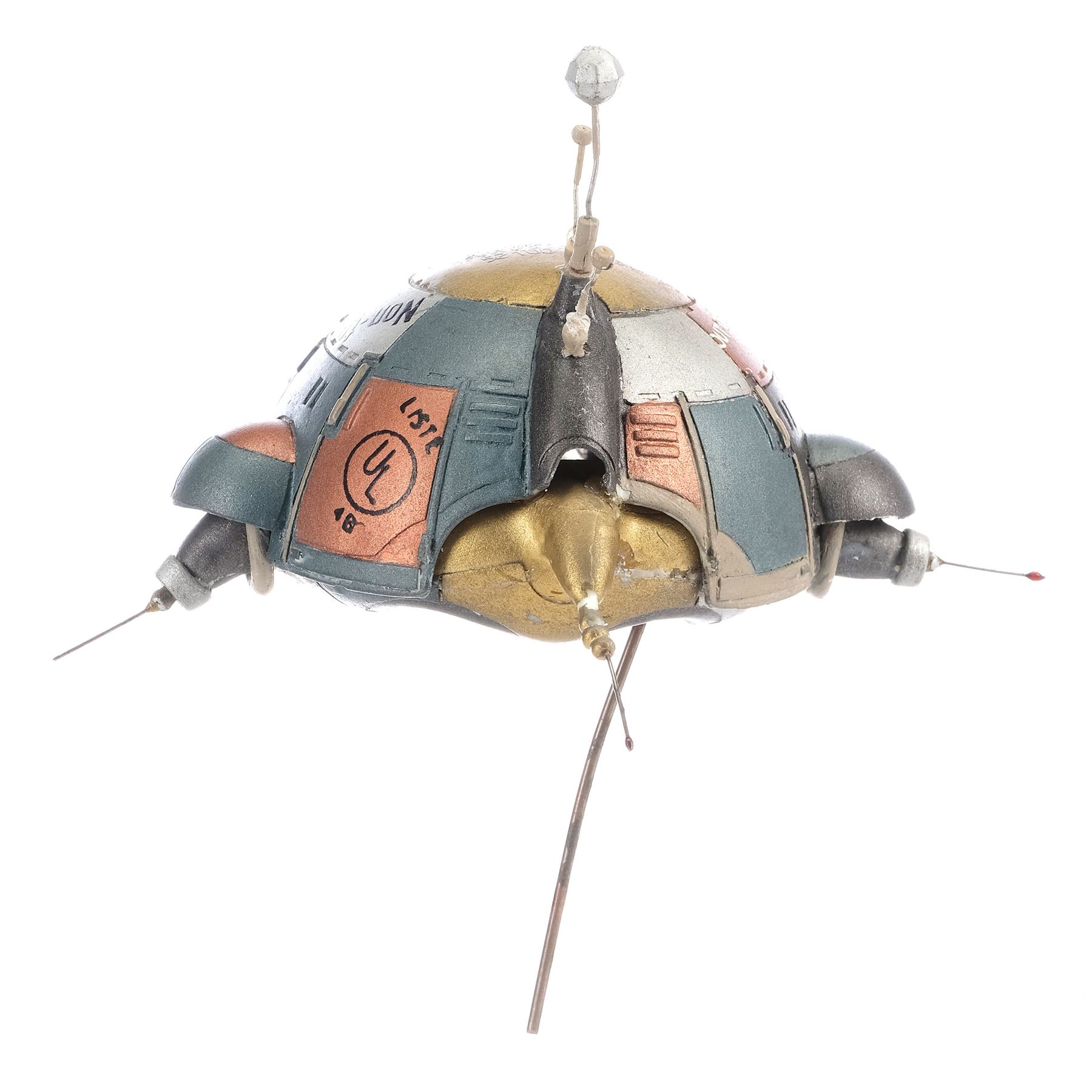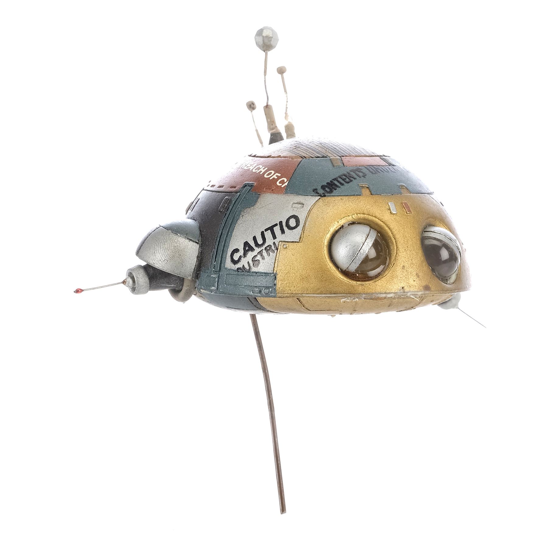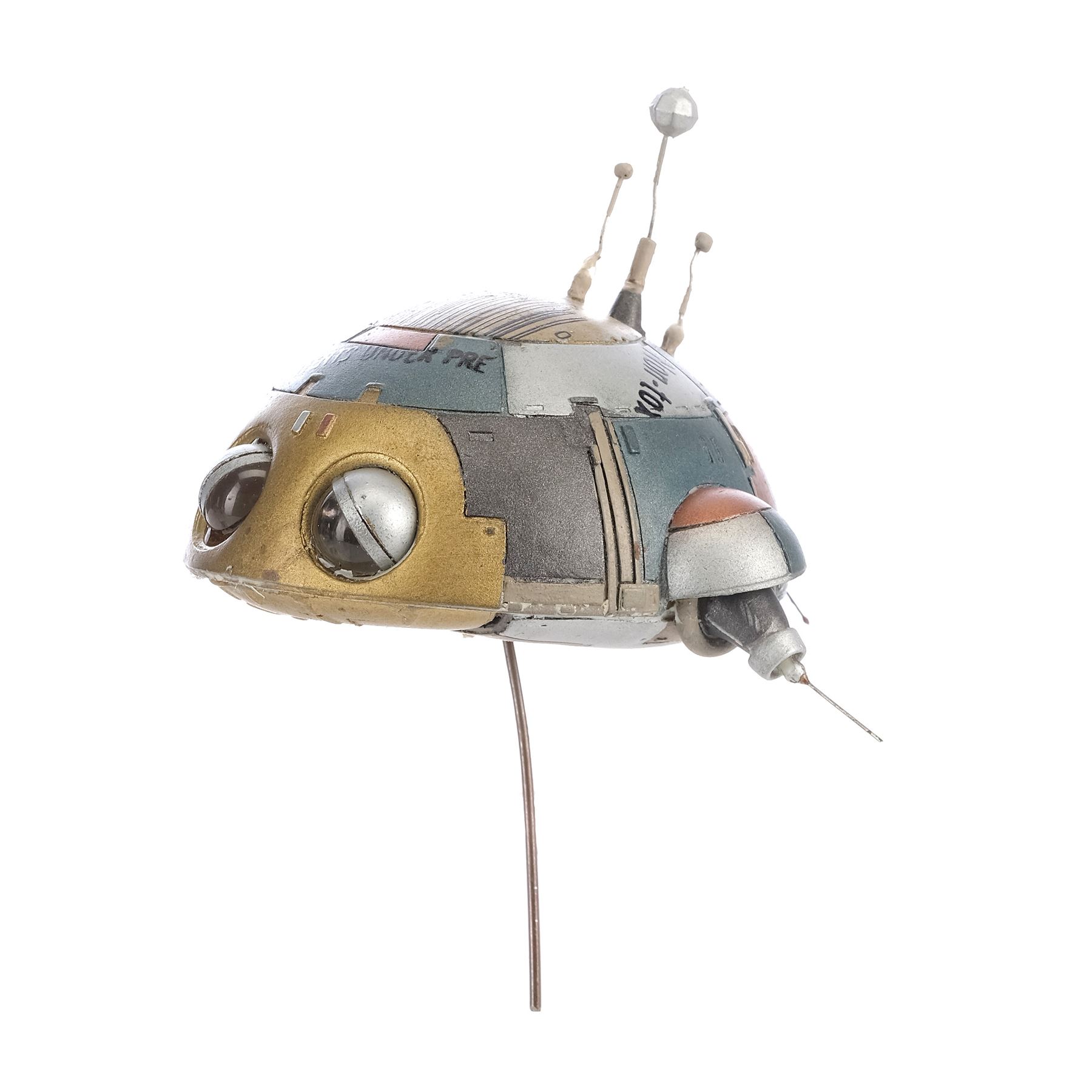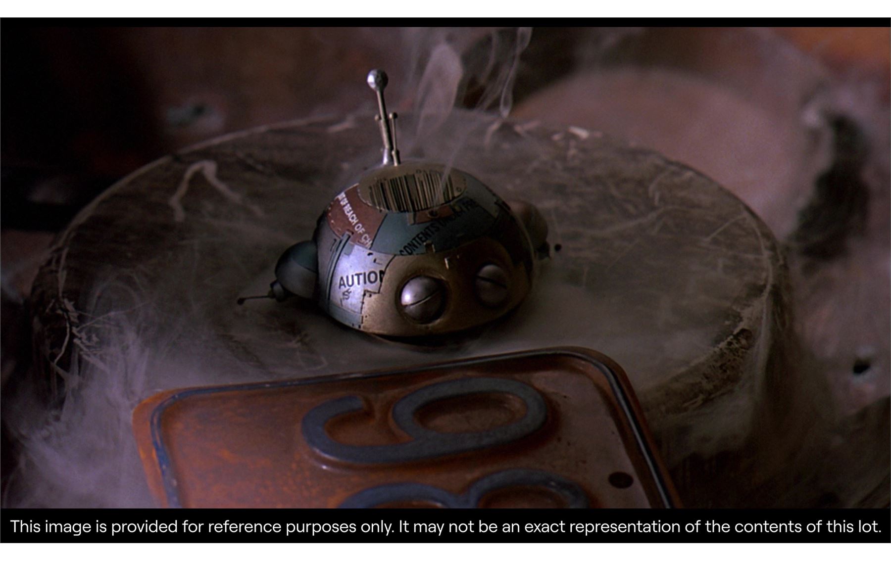 This robot model was created by Industrial Light & Magic (ILM), and veteran ILM artists, including Ralph McQuarrie and Paul Huston, contributed to the design of the Fix-Its. This resin puppet is hand-painted with Wheems' signature patchwork of blue, gold- and copper-colour, and stencilled lettering and barcodes. It is presented in its legless flying mode and exhibits scuffing and a small hole in the bottom. Dimensions: 12.75 cm x 12.75 cm x 7.75 cm (5" x 5" x 3")