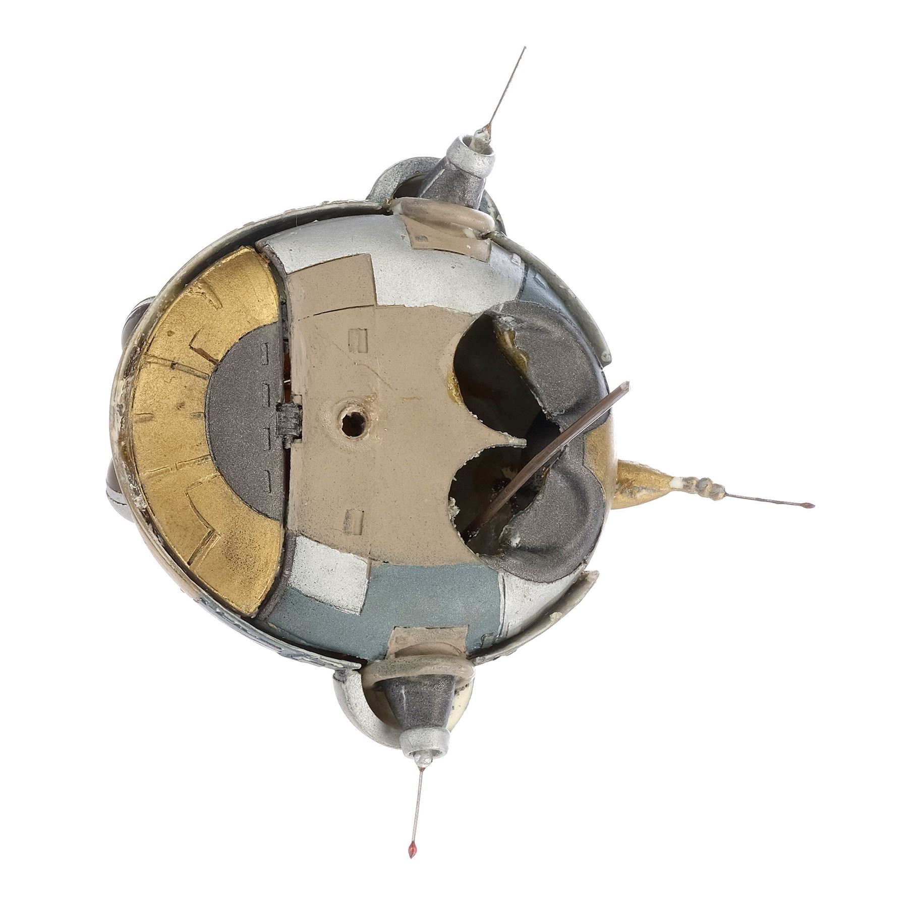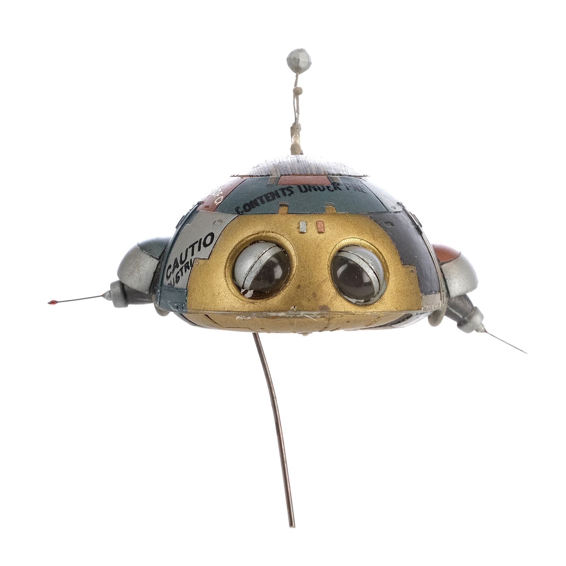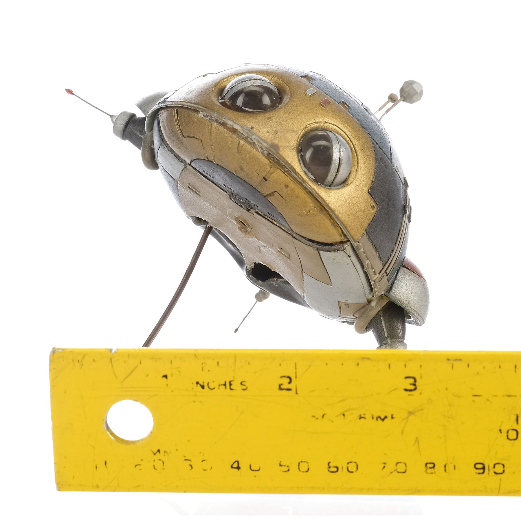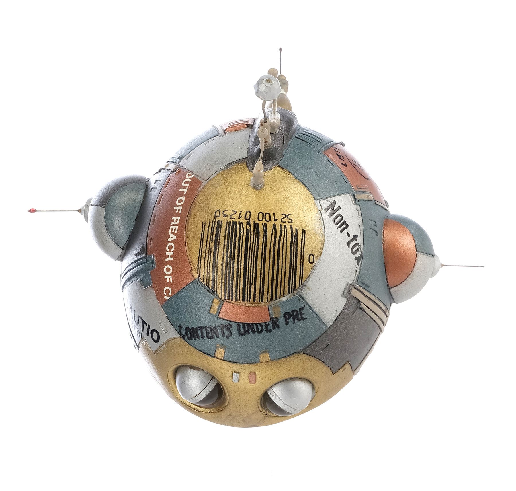 This robot model was created by Industrial Light & Magic (ILM), and veteran ILM artists, including Ralph McQuarrie and Paul Huston, contributed to the design of the Fix-Its. This resin puppet is hand-painted with Wheems' signature patchwork of blue, gold- and copper-colour, and stencilled lettering and barcodes. It is presented in its legless flying mode and exhibits scuffing and a small hole in the bottom. Dimensions: 12.75 cm x 12.75 cm x 7.75 cm (5" x 5" x 3")