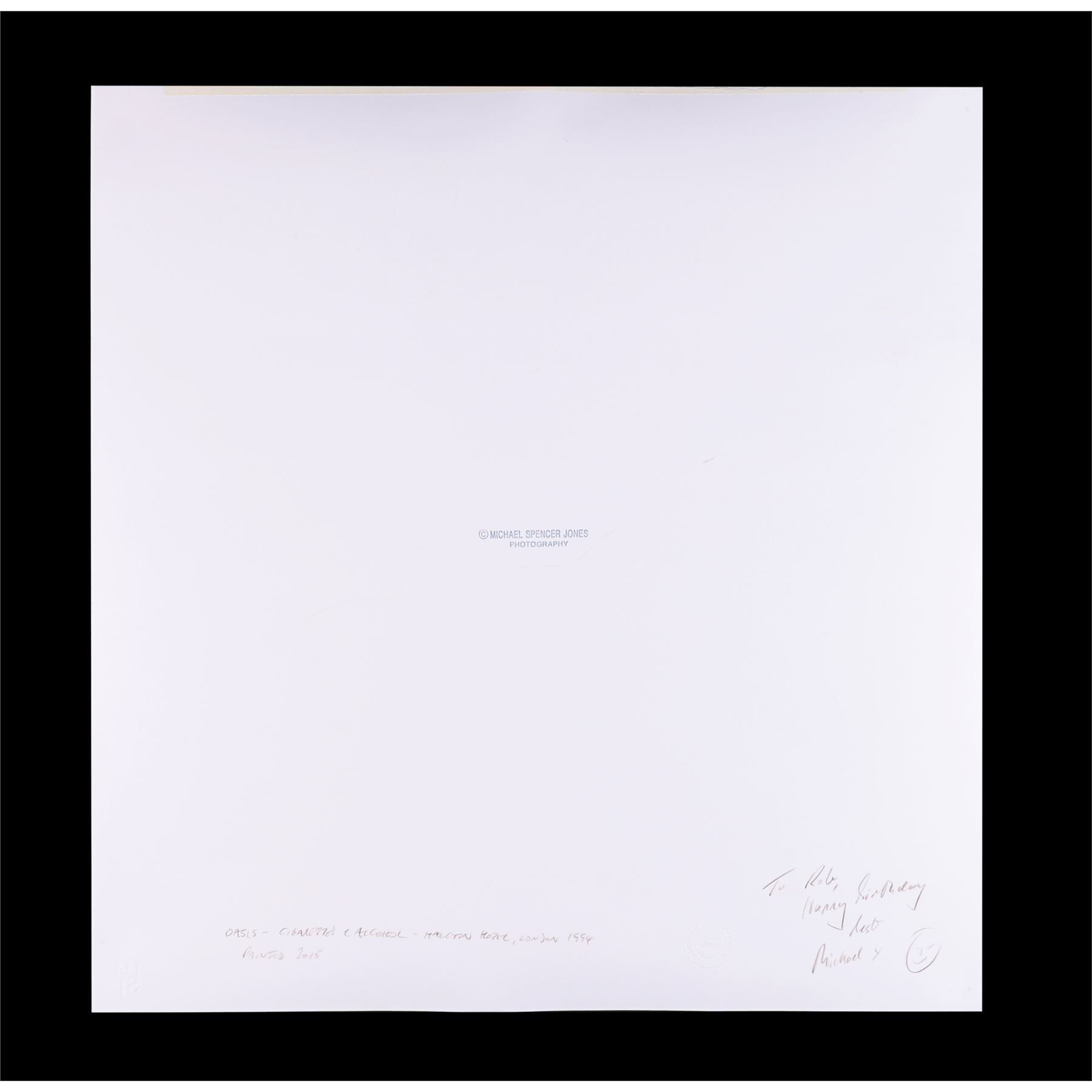 A limited-edition photographic print featuring Noel and Liam Gallagher. This candid image by acclaimed rock photographer Michael Spencer Jones was taken during the photoshoot for the cover of "Cigarettes & Alcohol" at the Halcyon Hotel on 14th August 1994.