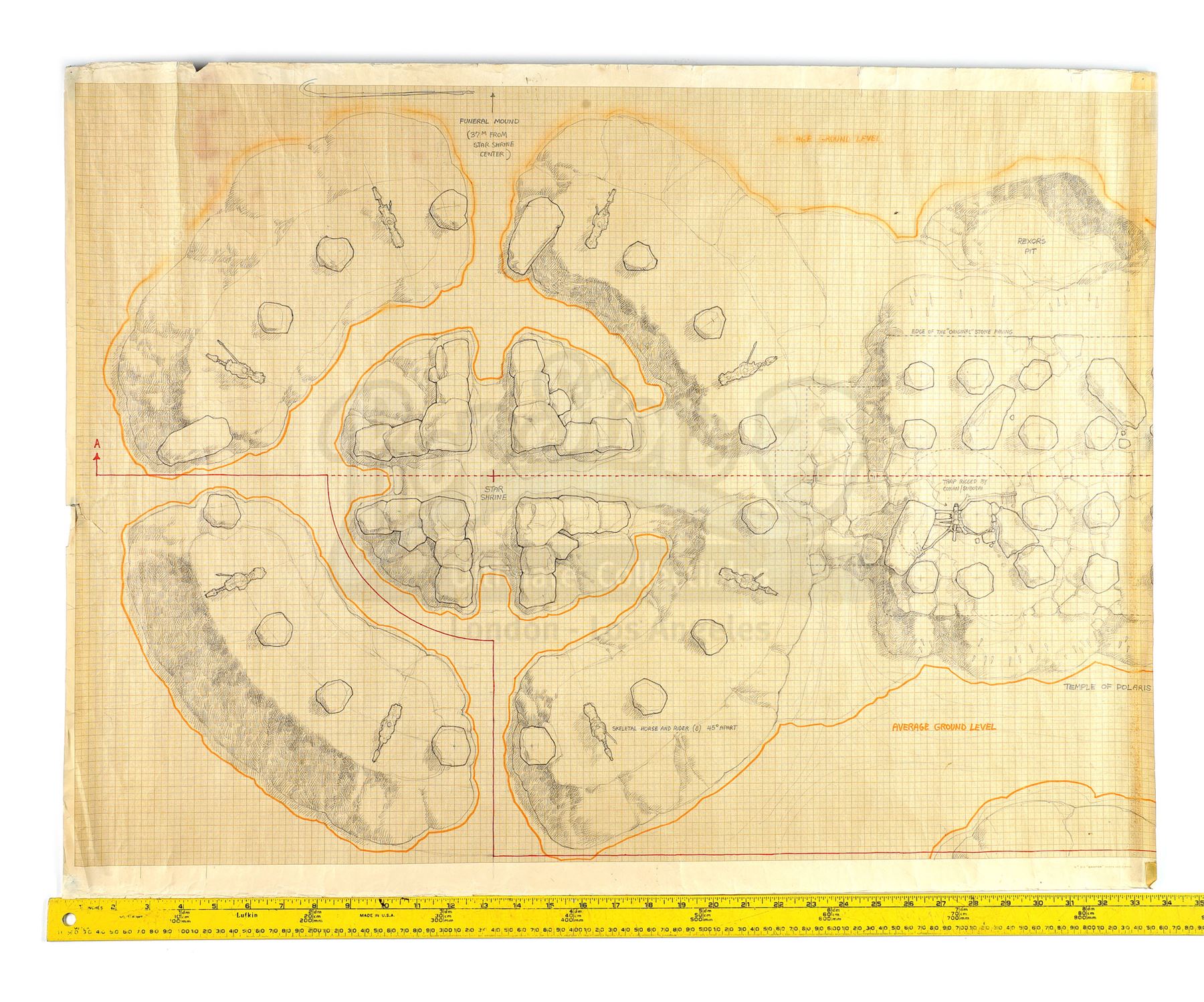 This lot will be auctioned on Wednesday, June 30th. The auction will begin at 9:00am PDT and lots are sold sequentially via live auctioneer; tune in to the live streaming broadcast on auction day to follow the pace. Note other lots in the auction may close on June 29th or July 1st. Hand-drawn Ron Cobb Mountain of Power concept sketches from the production of John Milius' fantasy adventure Conan the Barbarian. Power-mad snake cult leader Thulsa Doom (James Earl Jones) commanded an army of minions from the Mountain of Power, his primary temple built into the side of a rock formation. This pair of concept sketches of the temple's exterior are rendered in pencil on graph paper, annotated, and signed by the film's production designer, Ron Cobb. Both exhibit some edge wear and folding to the corners, but the pair remains in good overall condition. Dimensions (largest): 30" x 34" (76.25 cm x 86.5 cm); (smallest): 23" x 23" (58.5 cm x 58.5 cm) Estimate: $800 - 1,200