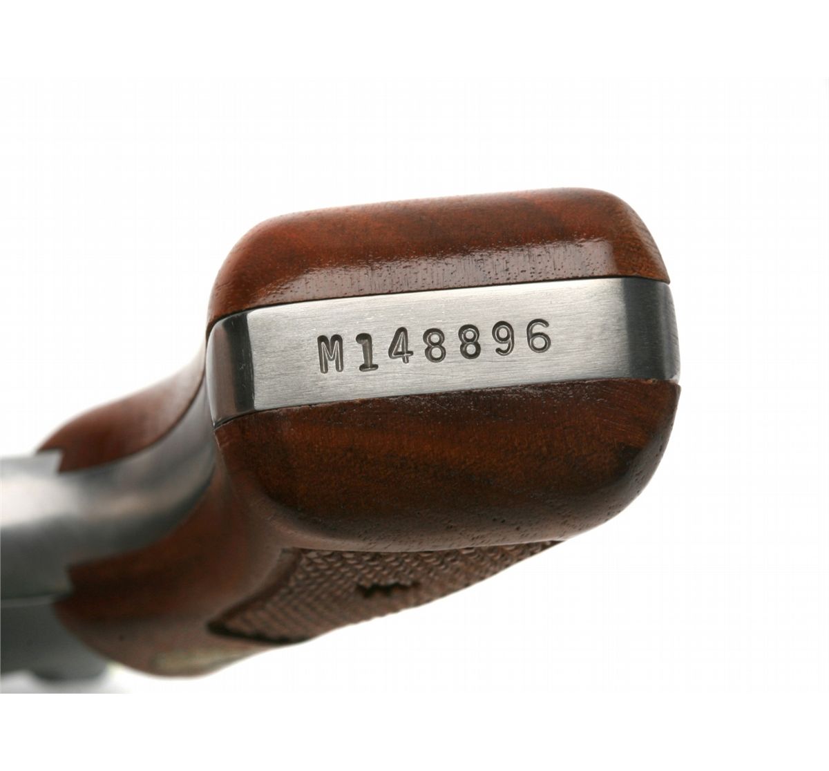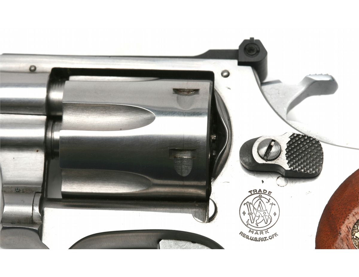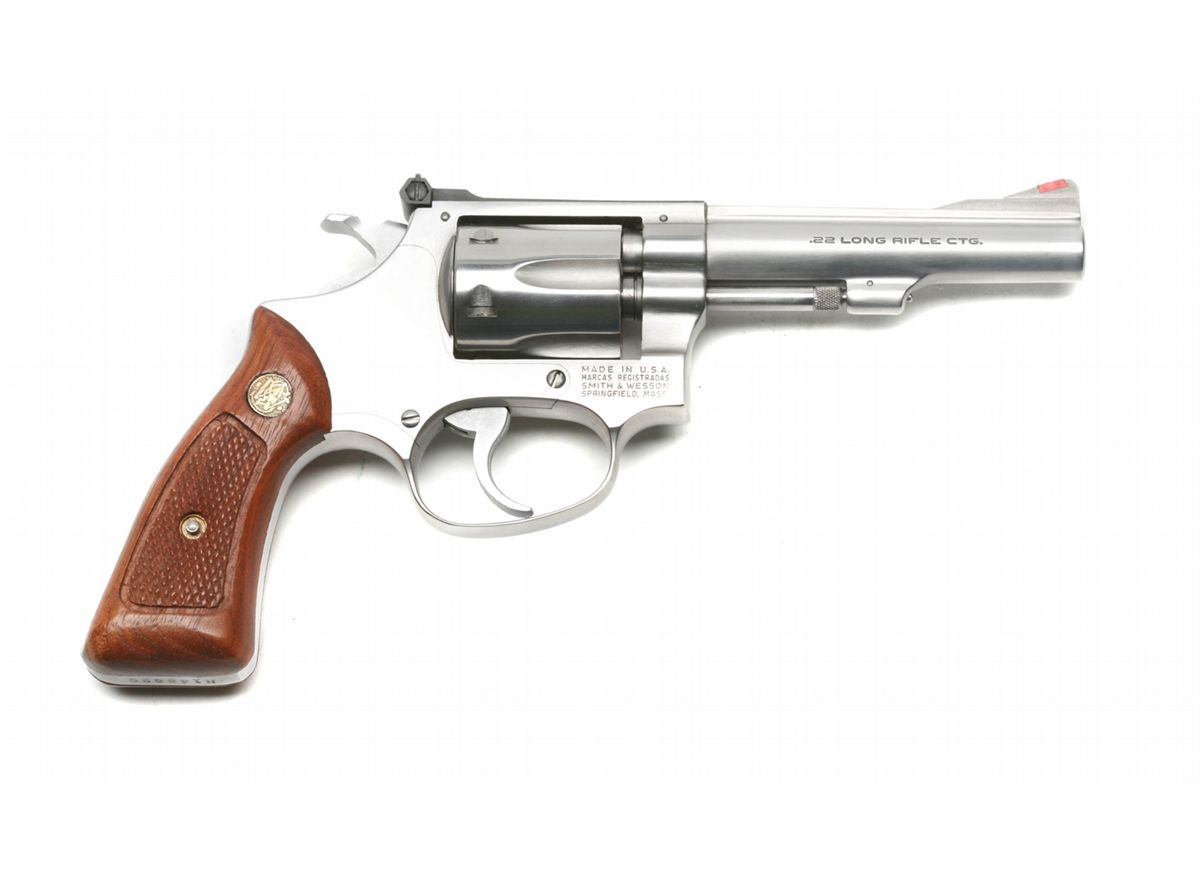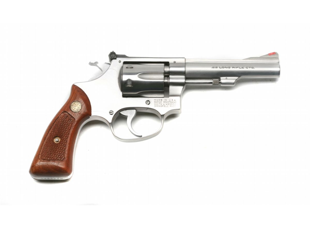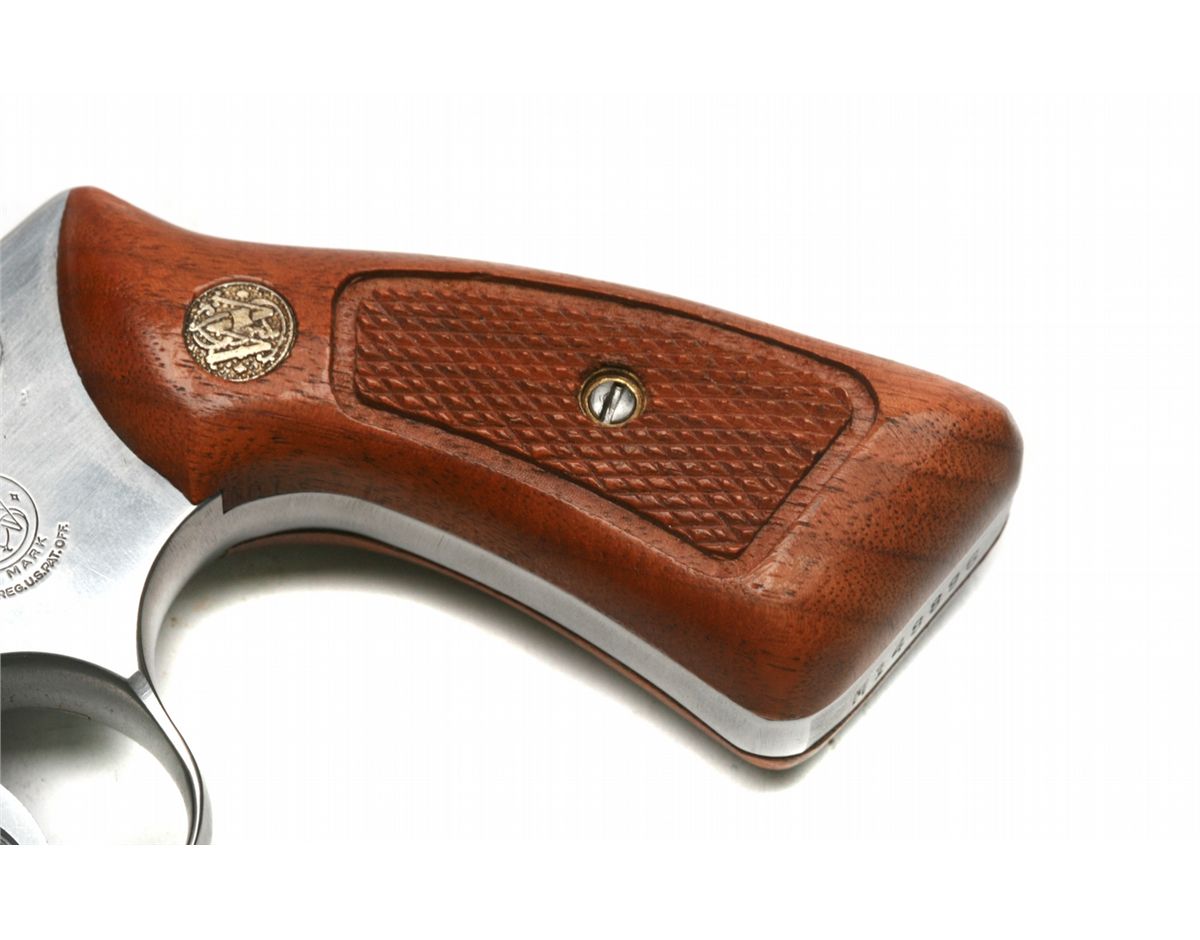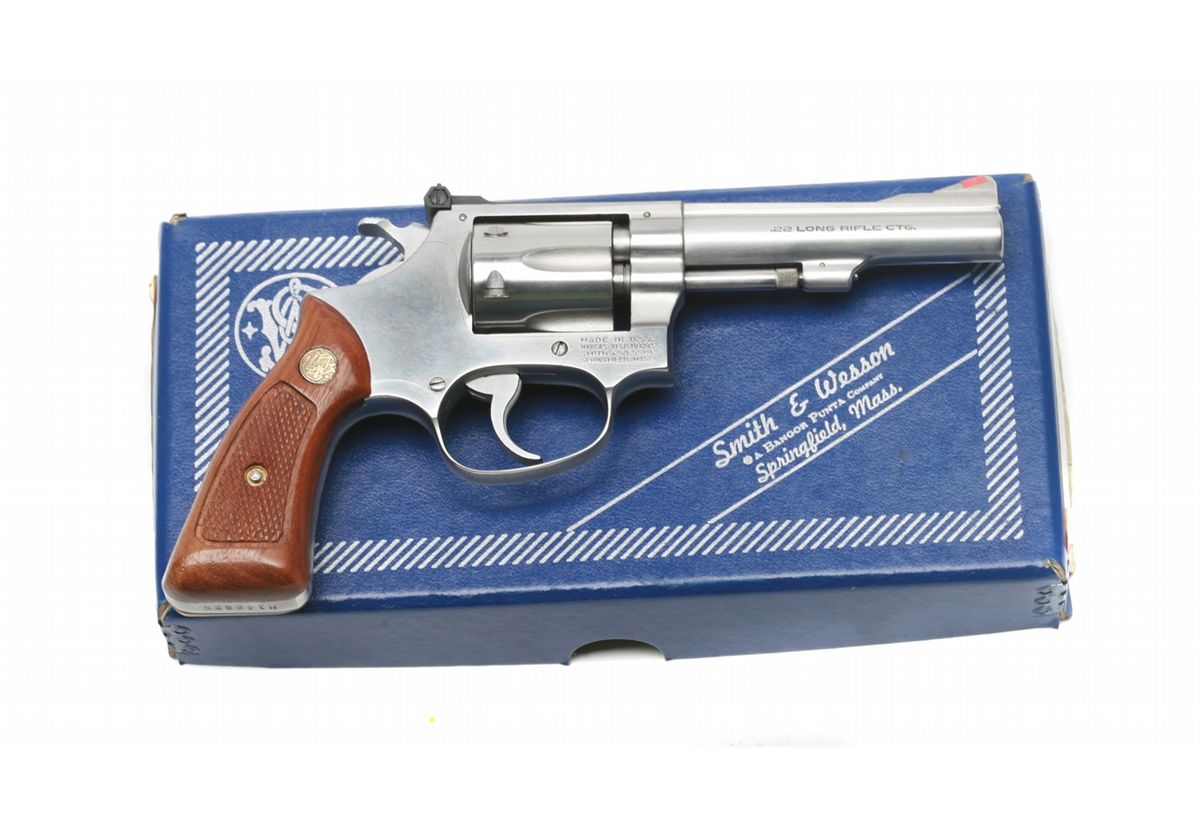 ANIB condition - 4" half lug pinned barrel - .22/32 Kit Gun Stainless model - 99% stainless finish - checkered walnut J frame grips with S&W medallions in excellent condition - front fixed serrated red ramp & rear black adjustable sights - crisp markings on barrel & frame - crisp yoke markings - smooth backstrap & serrated top rib - 6-shot fluted cylinder - serrated trigger - appears unfired - yr. mfg: 1977-81 - factory Bangor Punta box in very good condition, strong corners - sealed cleaning kit - papers - SN M148896 - est. 300 - 600 - FFL - 25JJCHKS013